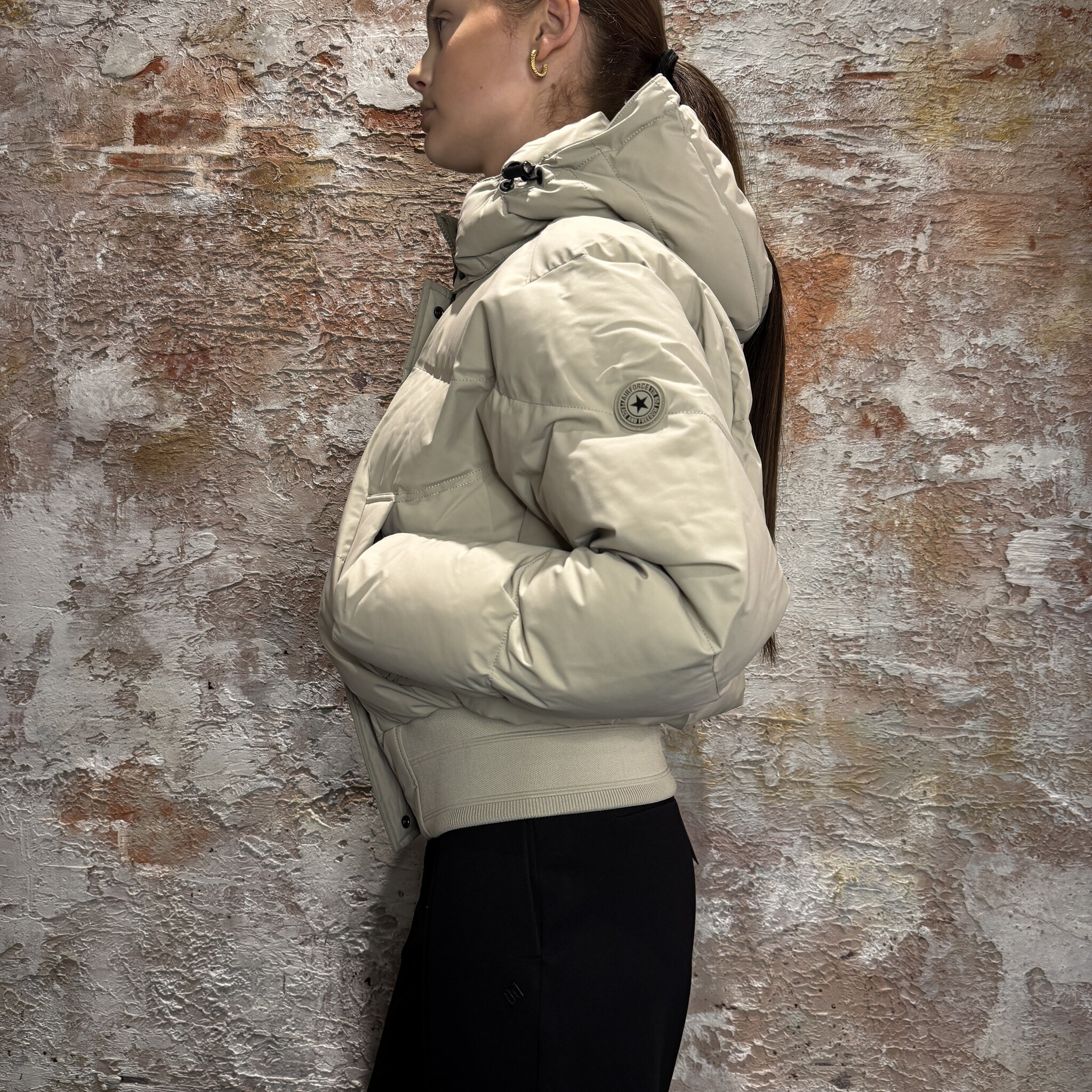 Airforce Bex Bomber in Taupe Plaza is een stijlvolle en functionele jas.Het heeft een gewatteerde structuur voor extra warmte, een stevige capuchon met verstelbare koorden, een rits met overslag en diepe zakken voor optimaal comfort.Perfect voor de winter