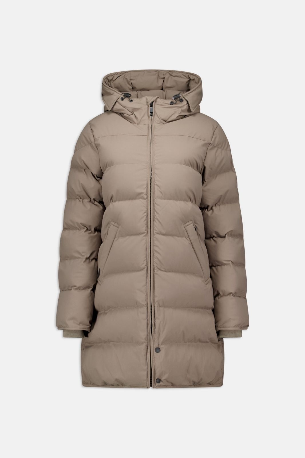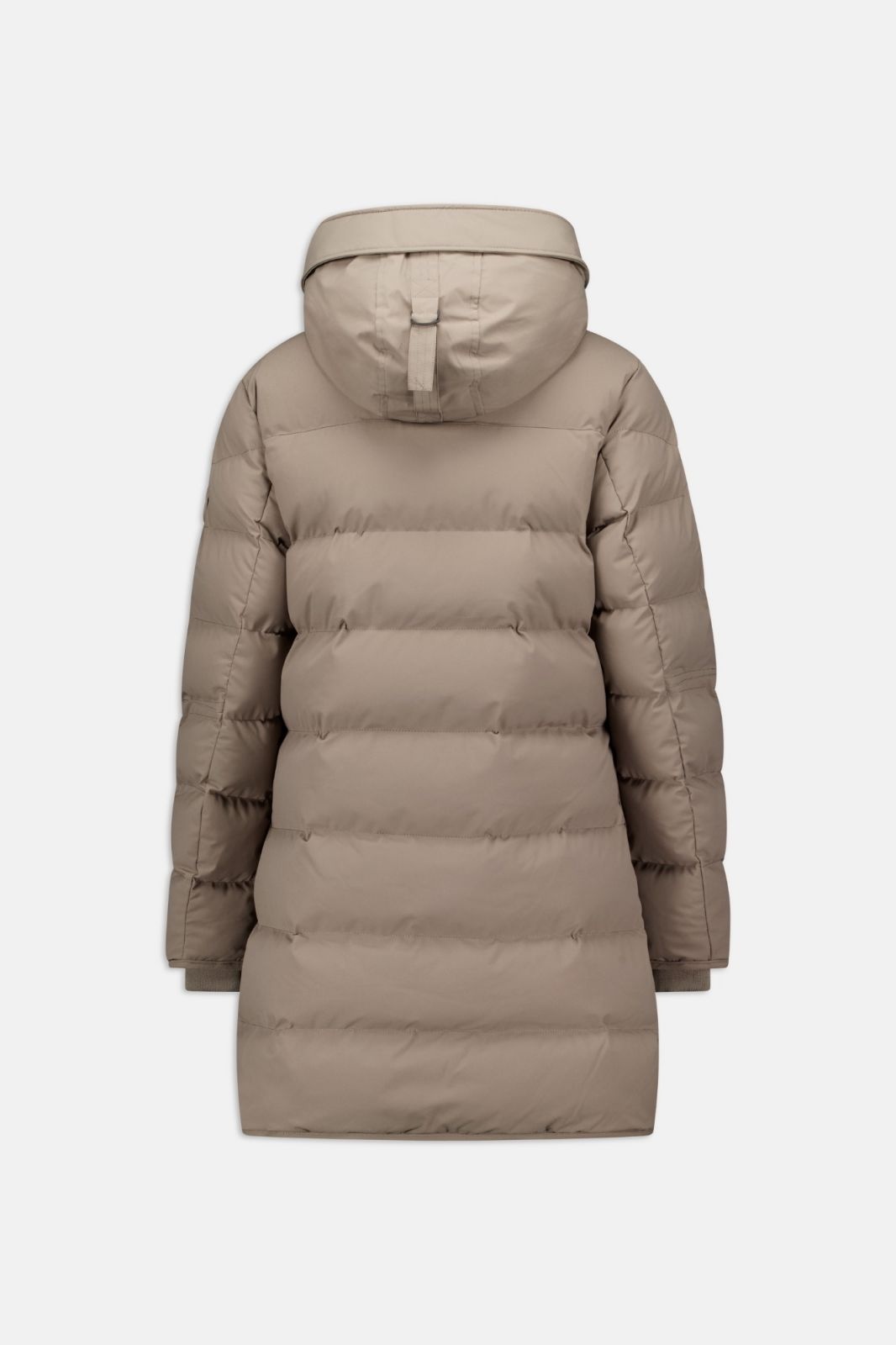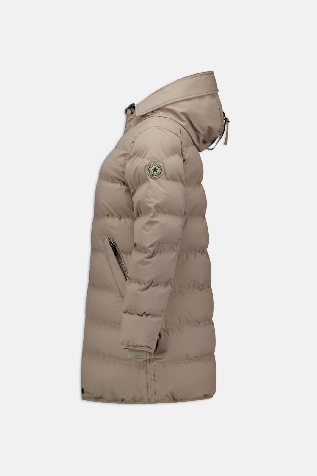 Airforce Jade Jacket Matt Bungee Cord. Warme dames winterjas met matte taupe kleurige afwerking, gevoerde capuchon en ritssluiting. Winddicht en waterafstotend, ideaal voor koude dagen. Tijdloos model met stijlvolle pasvorm en hoogwaardige kwaliteit.