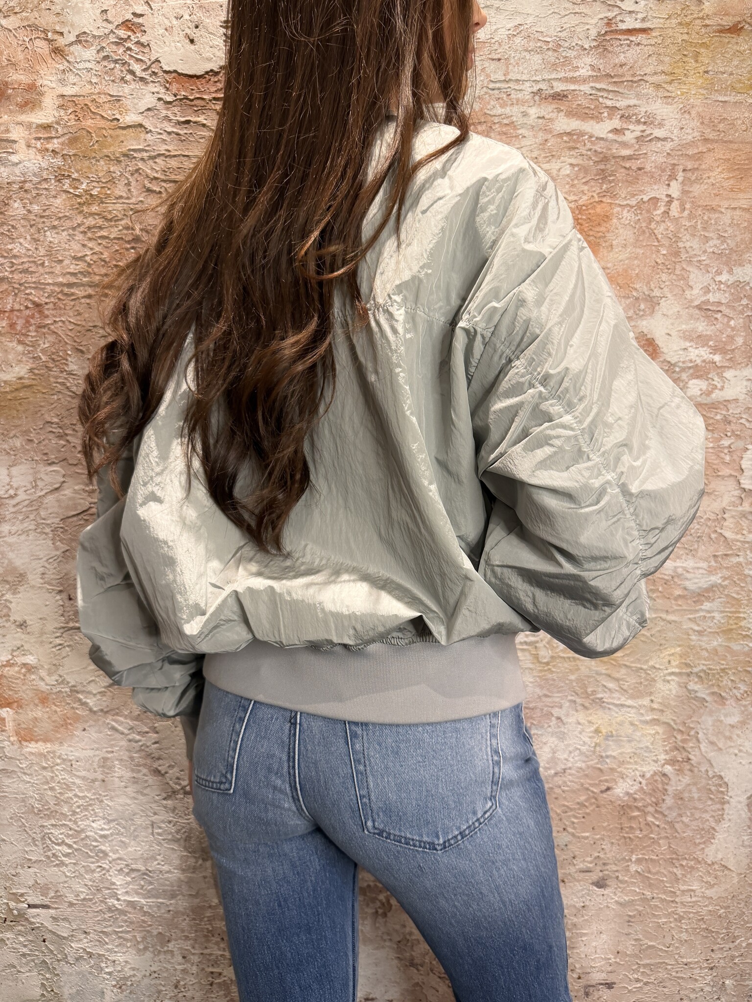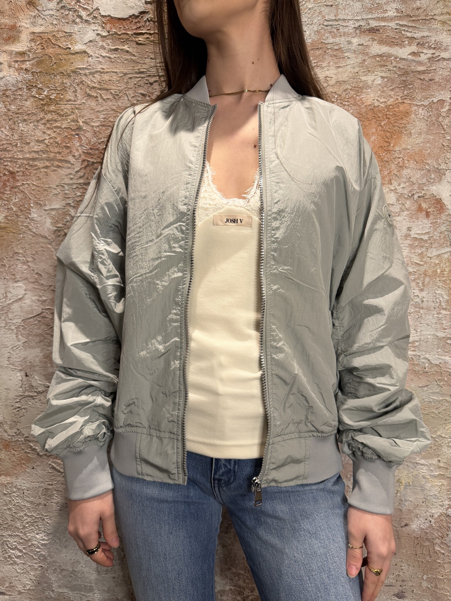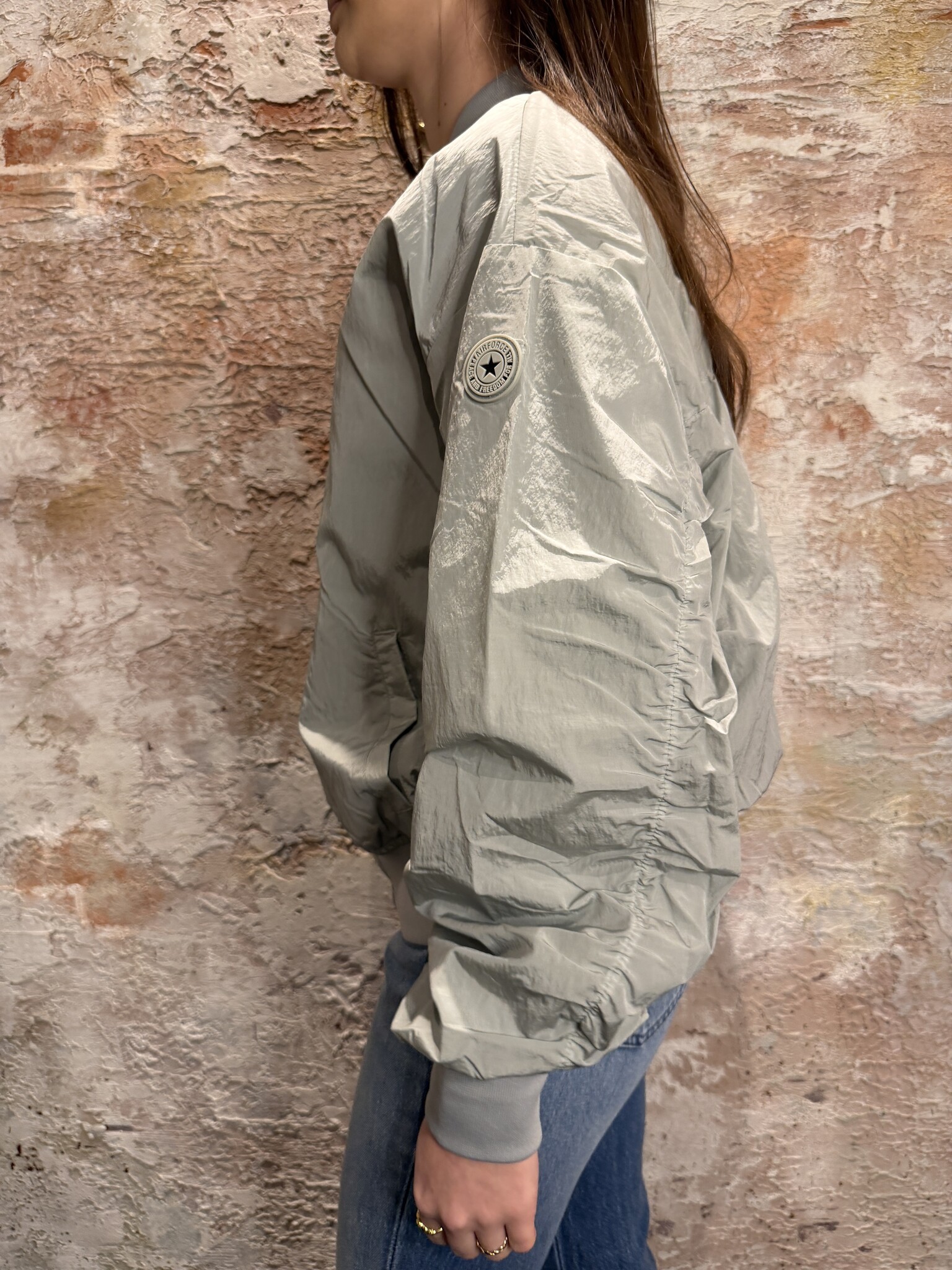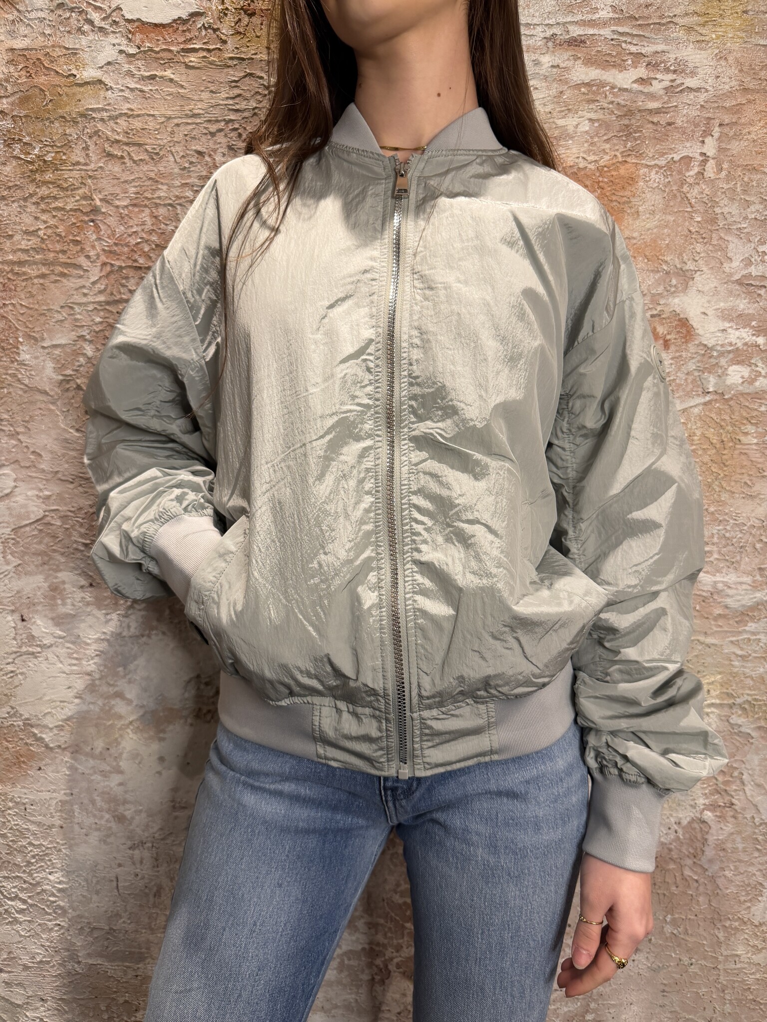 Stoere Airforce bomber in Metal met een moderne crinkle structuur. De jas heeft een ritssluiting, elastische boorden en een comfortabele fit. Ideaal als licht jasje voor het voorjaar en perfect te combineren met iedere casual look.