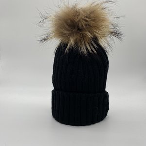 Warme kabel muts in het zwart, de pompon is in de zelfde kleur.