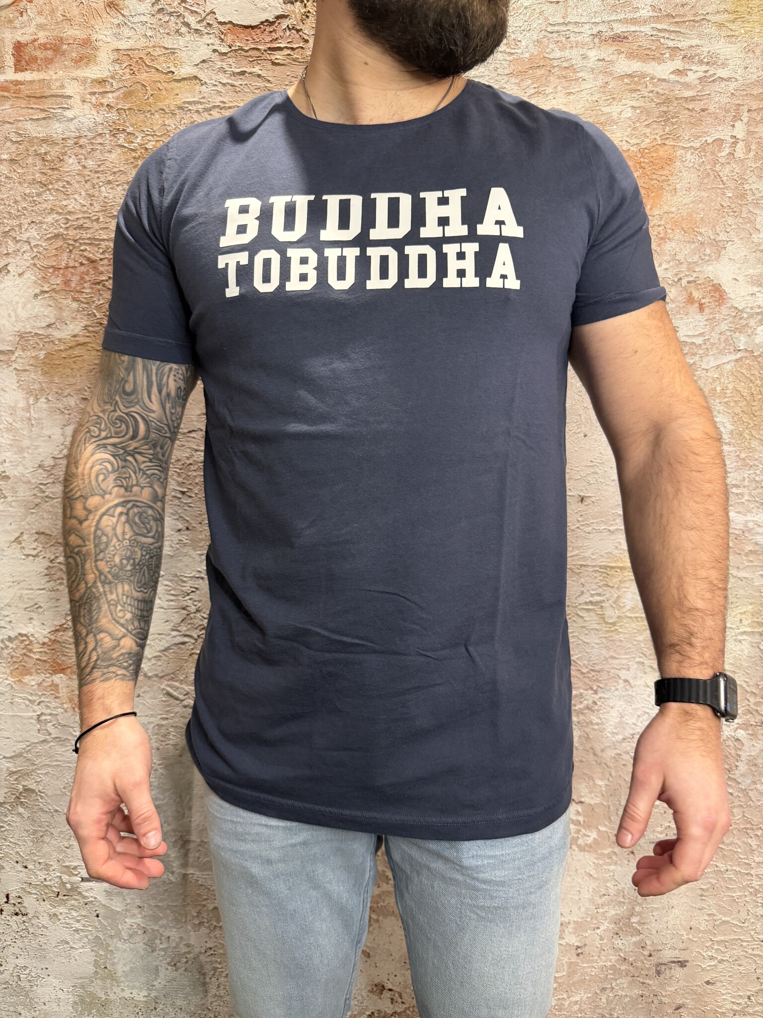 Stoer Buddha to Buddha heren T-shirt in navy met opvallende logo print op de borst. Dit comfortabele katoenen T-shirt voor heren heeft een moderne slim fit en premium kwaliteit. Perfect voor een casual streetwear look en makkelijk te combineren met jeans.