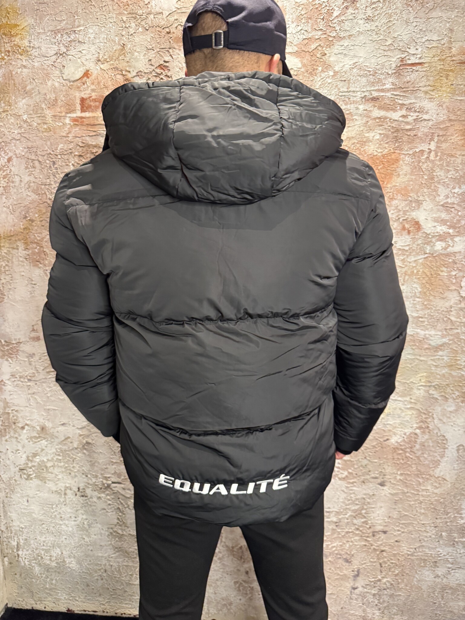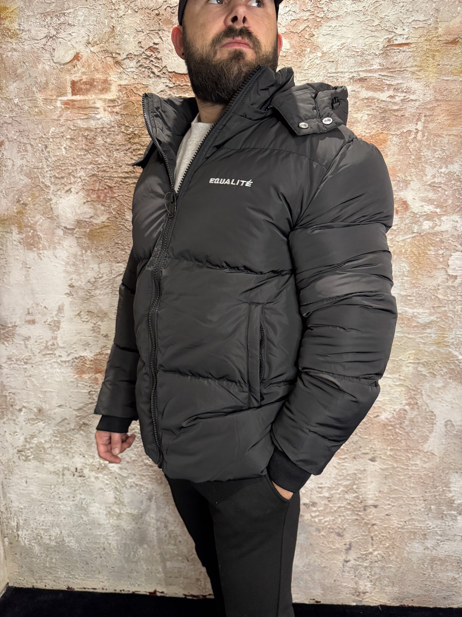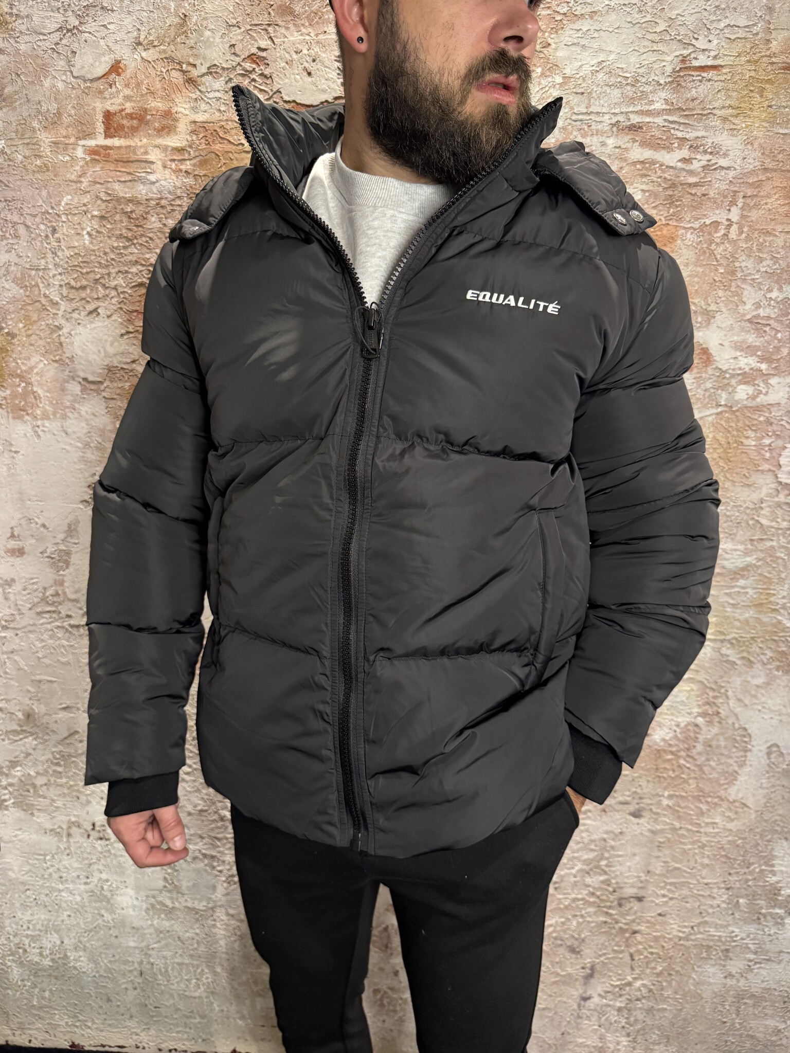 Equalité Essential Puffer Black heren jas. Deze zwarte gewatteerde puffer is warm, winddicht en heeft een afneembare capuchon, ritssluiting en Equalité logo op borst en rug. Comfortabele fit en ideaal als stijlvolle winterjas, ook verkrijgbaar in grijs.