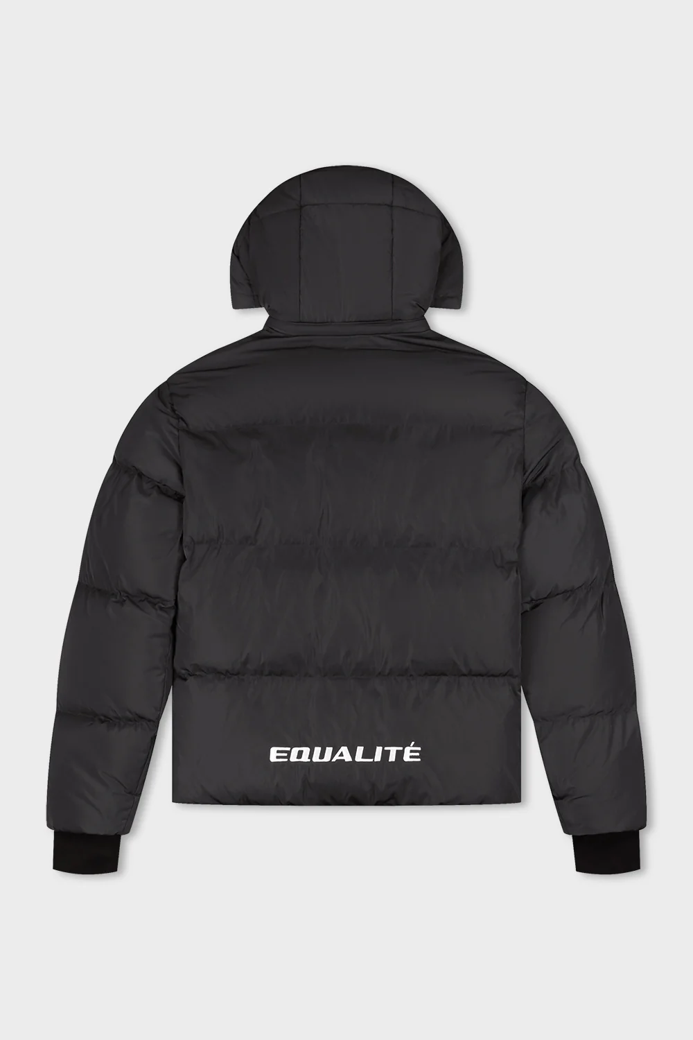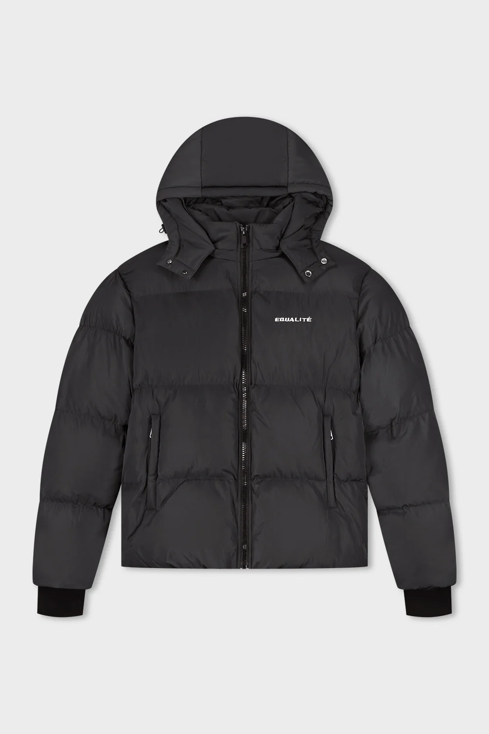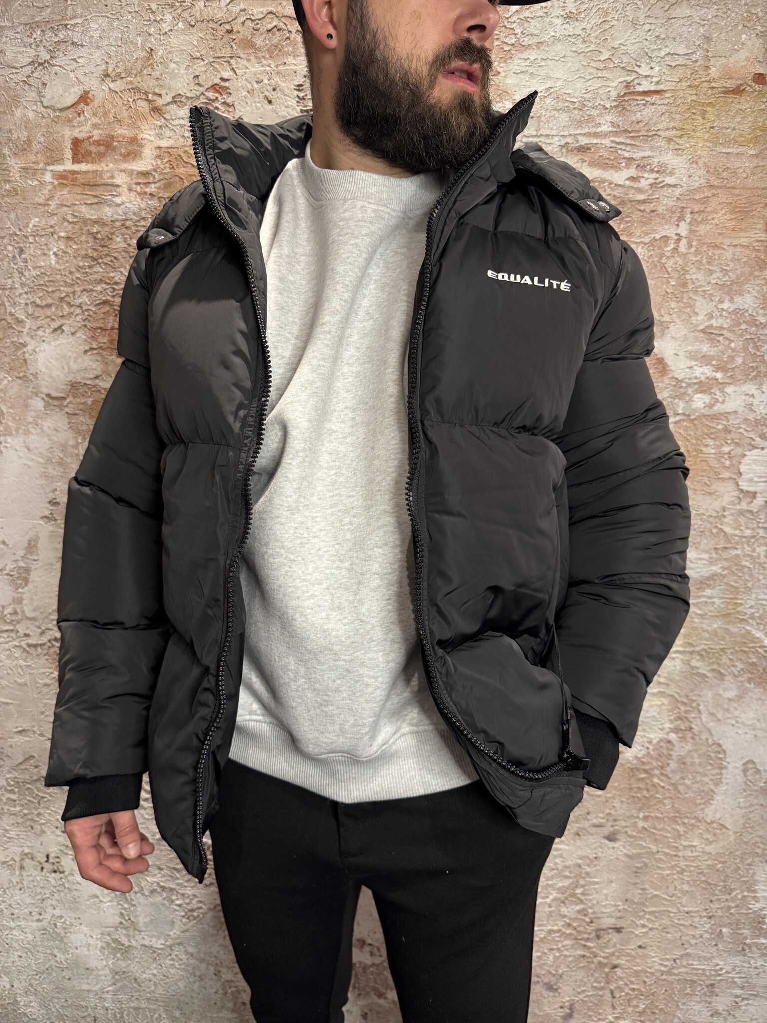 Equalité Essential Puffer Black heren jas. Deze zwarte gewatteerde puffer is warm, winddicht en heeft een afneembare capuchon, ritssluiting en Equalité logo op borst en rug. Comfortabele fit en ideaal als stijlvolle winterjas, ook verkrijgbaar in grijs.