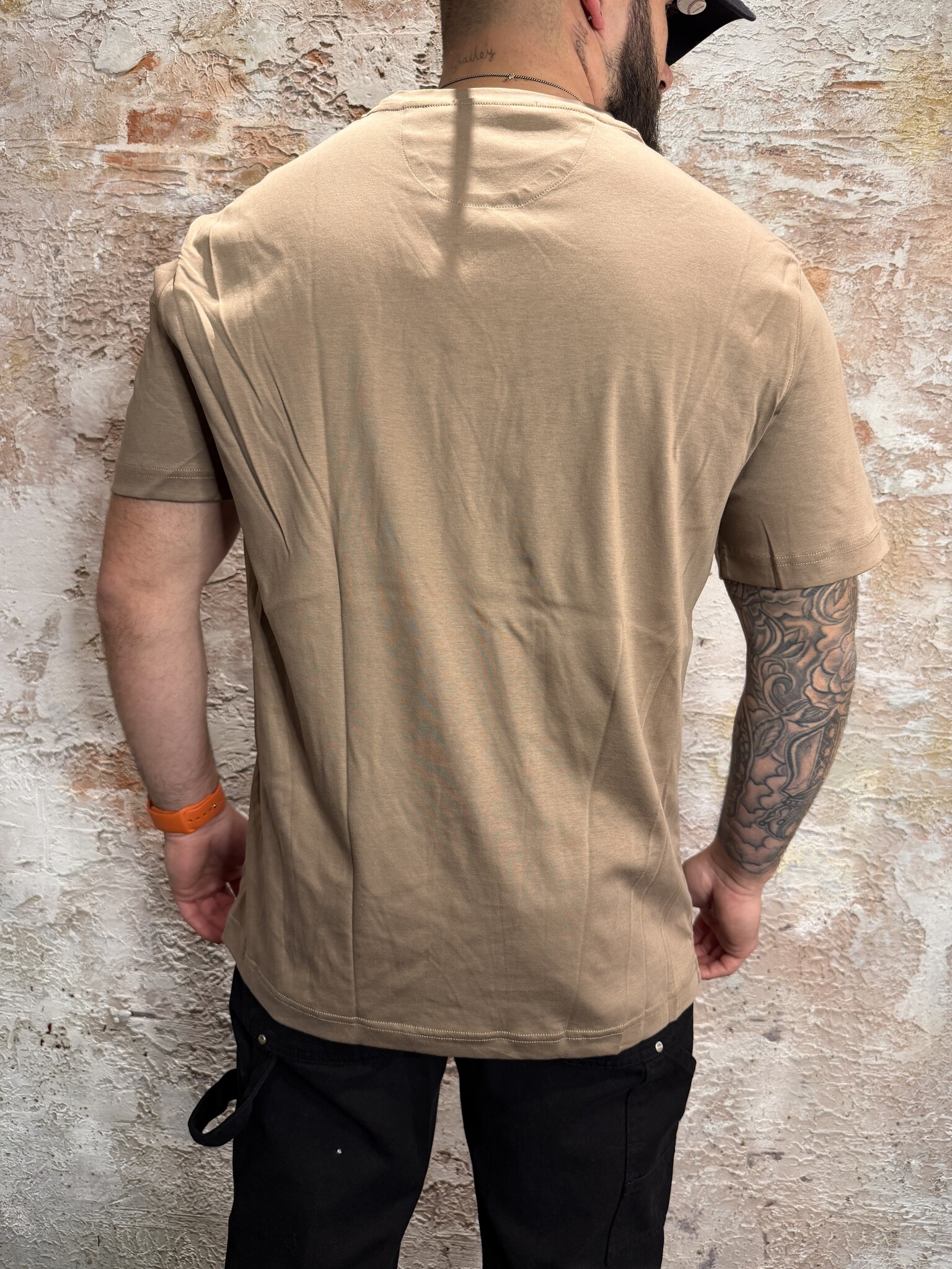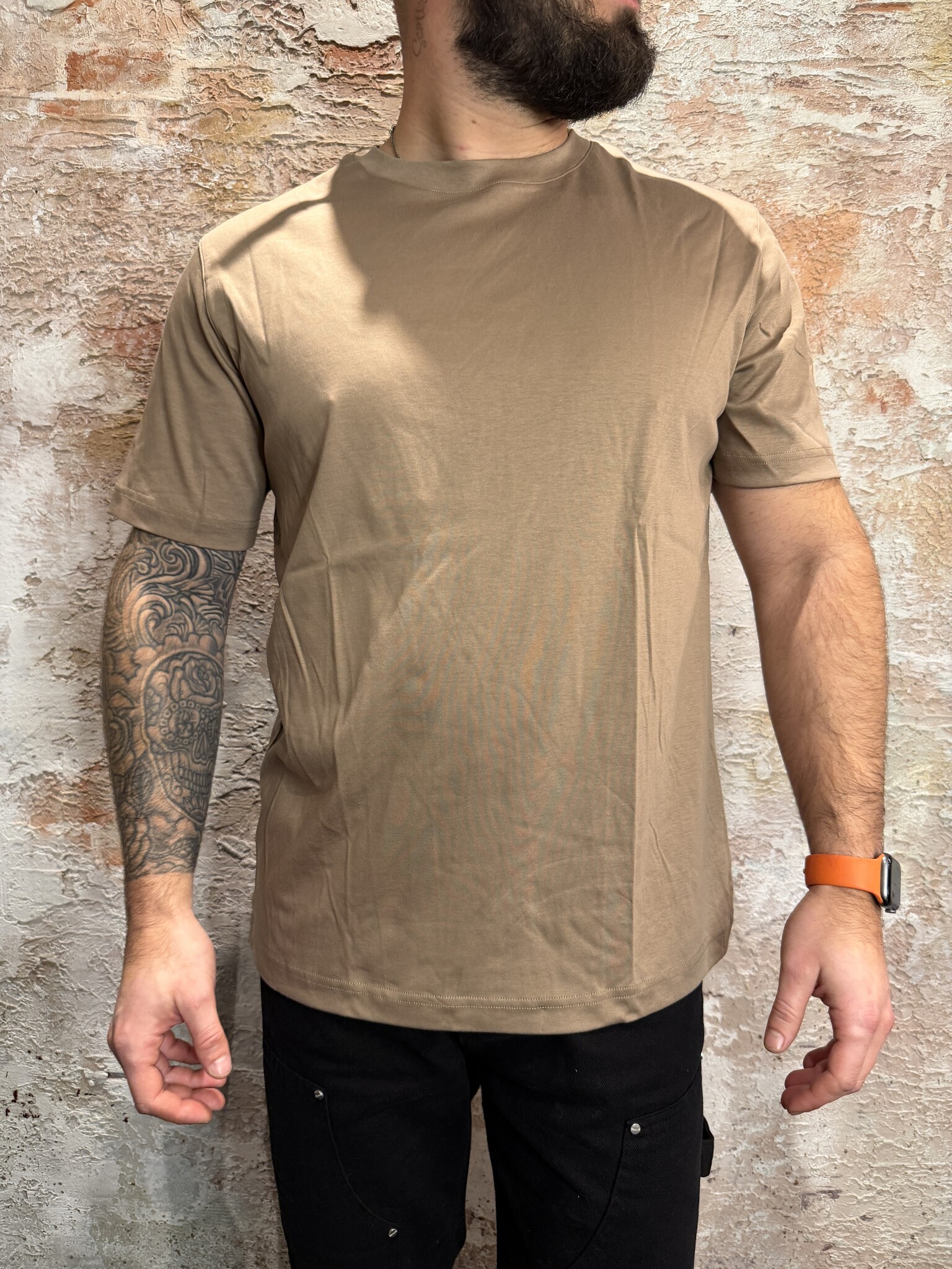 Cou7ure Essentials Glans T-Shirt in licht bruin, gemaakt van 100% katoen. Comfortabele fit met een subtiele glans voor een luxe uitstraling. Perfect als stijlvolle basic, ideaal te combineren met jeans, chino of onder een jacket. Ons model draagt small.