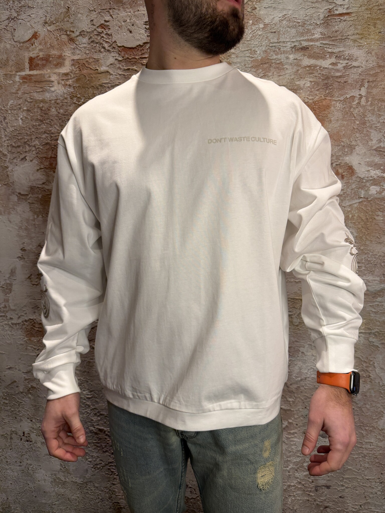 Don’t Waste Culture Yorika Longsleeve Off White met relaxed fit en luxe geborduurde details op mouwen en rug zichtbaar. Gemaakt van zachte katoenmix voor comfort. Minimalistische frontprint, premium streetwear look, unisex en stijlvol.