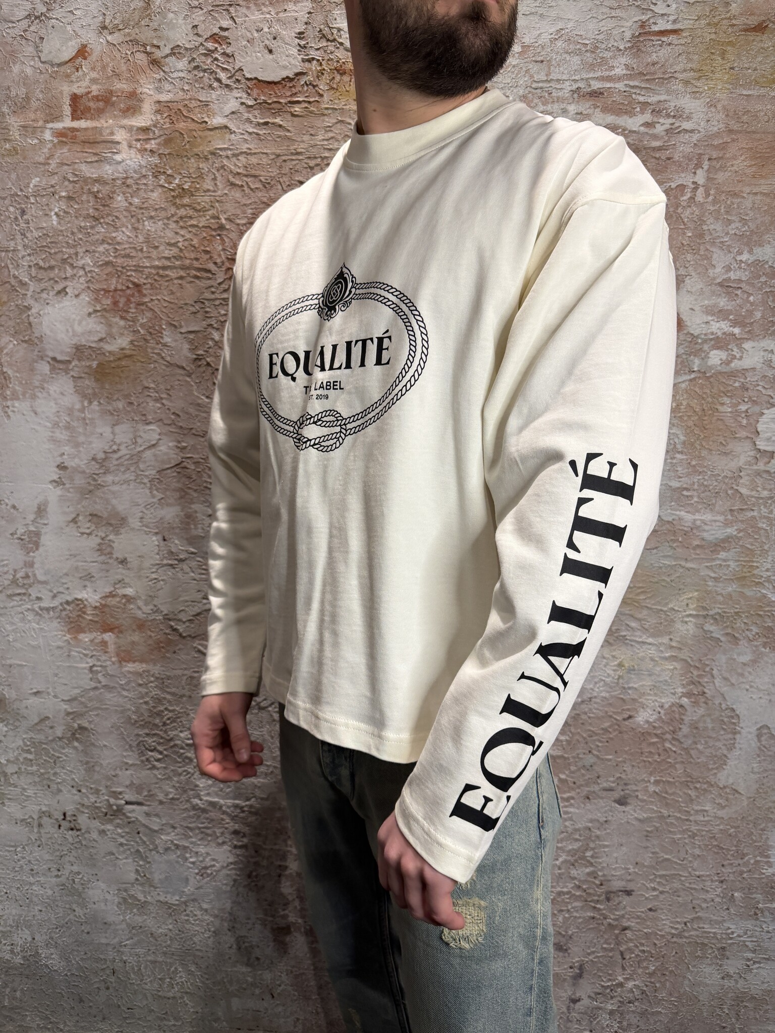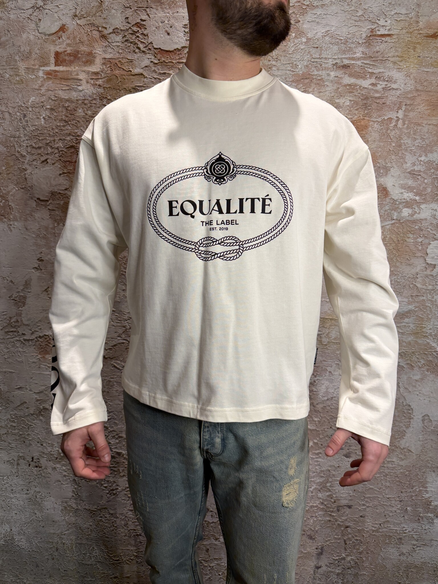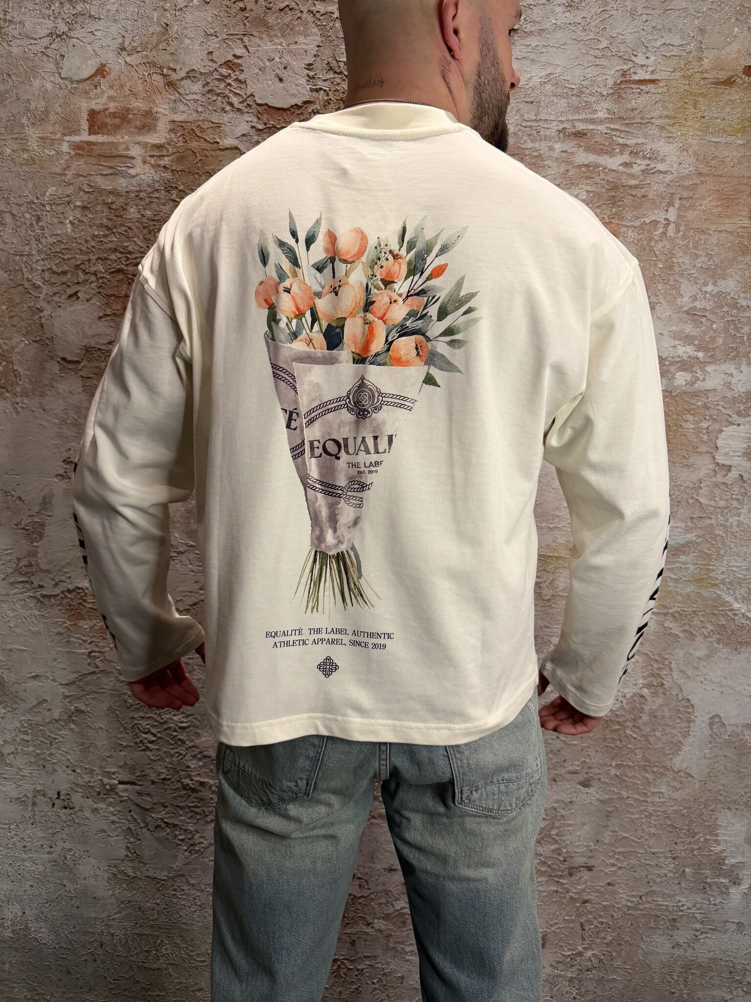 Equalité Bouquet Longsleeve Tee Off-White met relaxed fit en luxe bloemprint op de rug. Gemaakt van zachte katoenmix voor optimaal draagcomfort. Stijlvol design met Equalité branding op borst en mouwen. Perfecte unisex longsleeve voor elke dag.