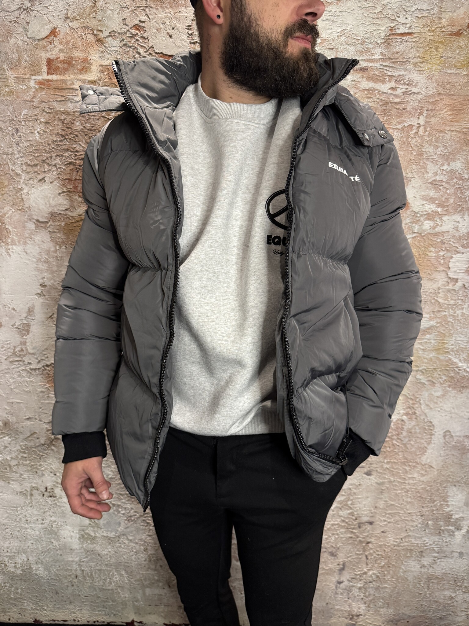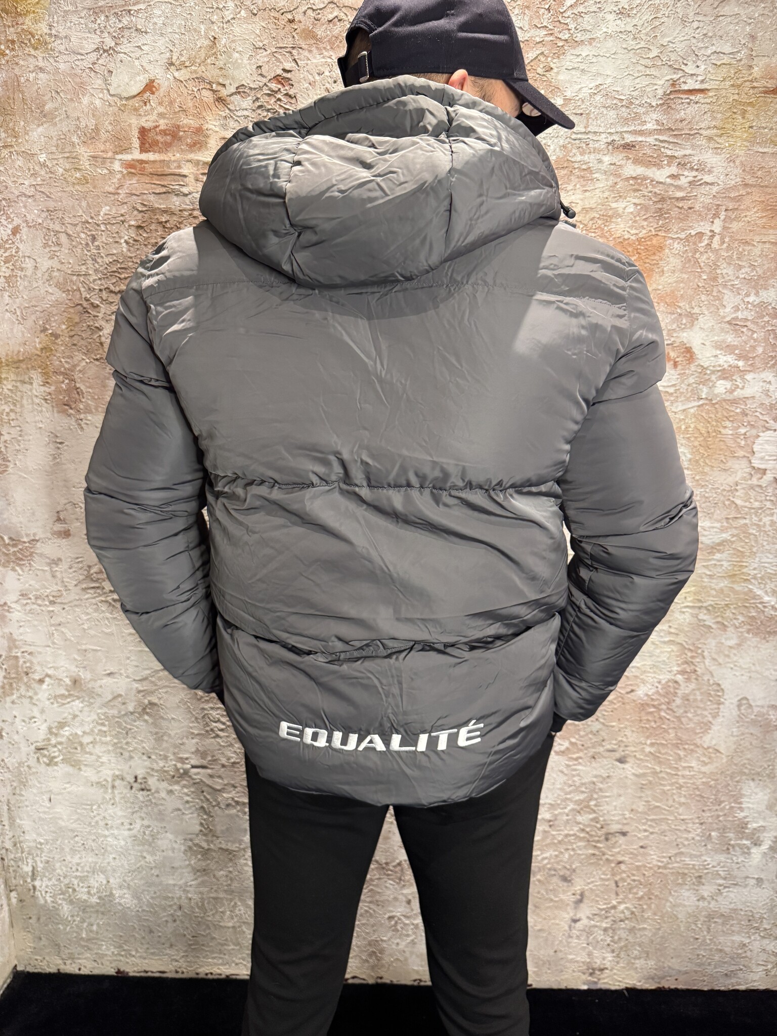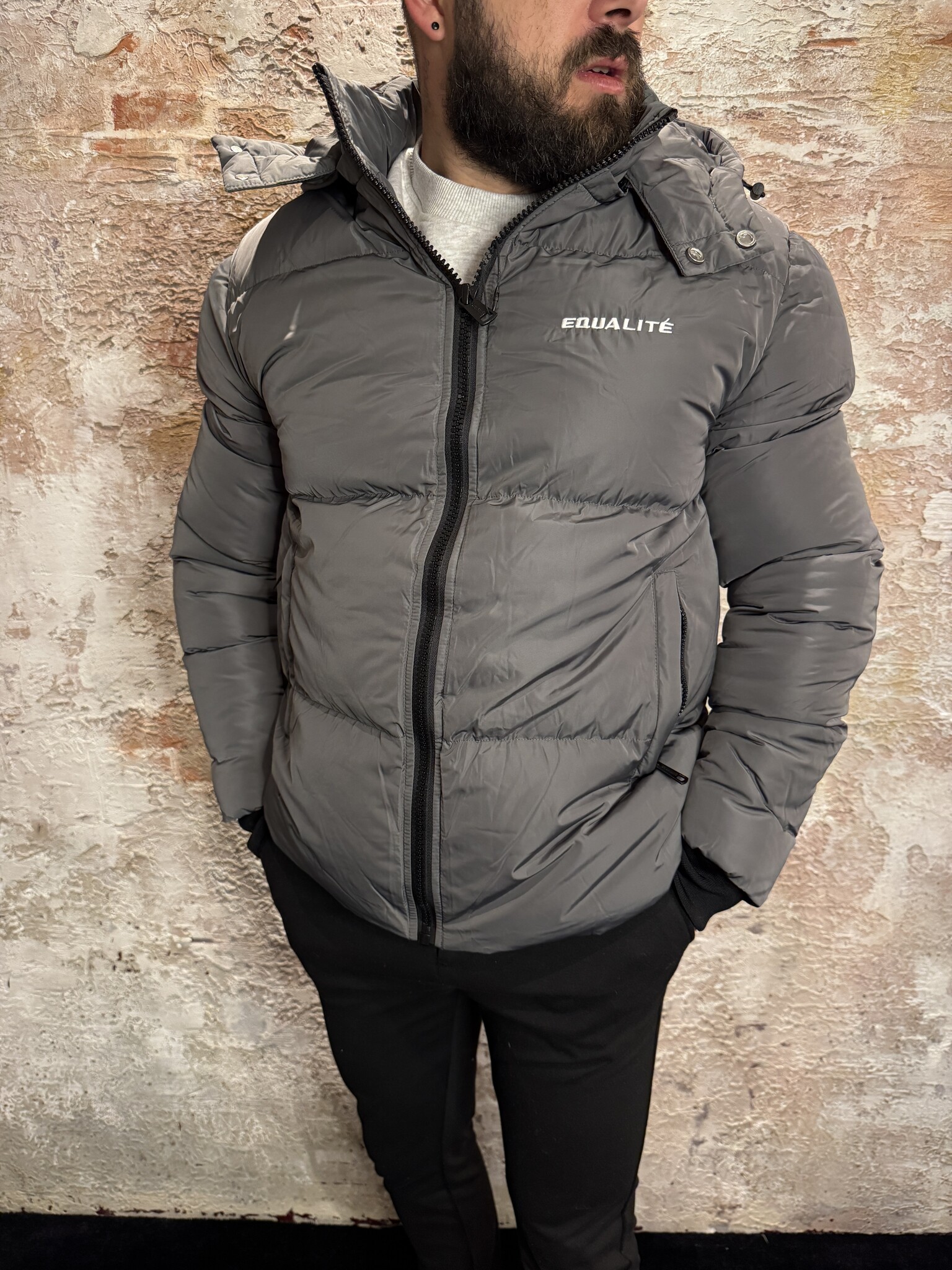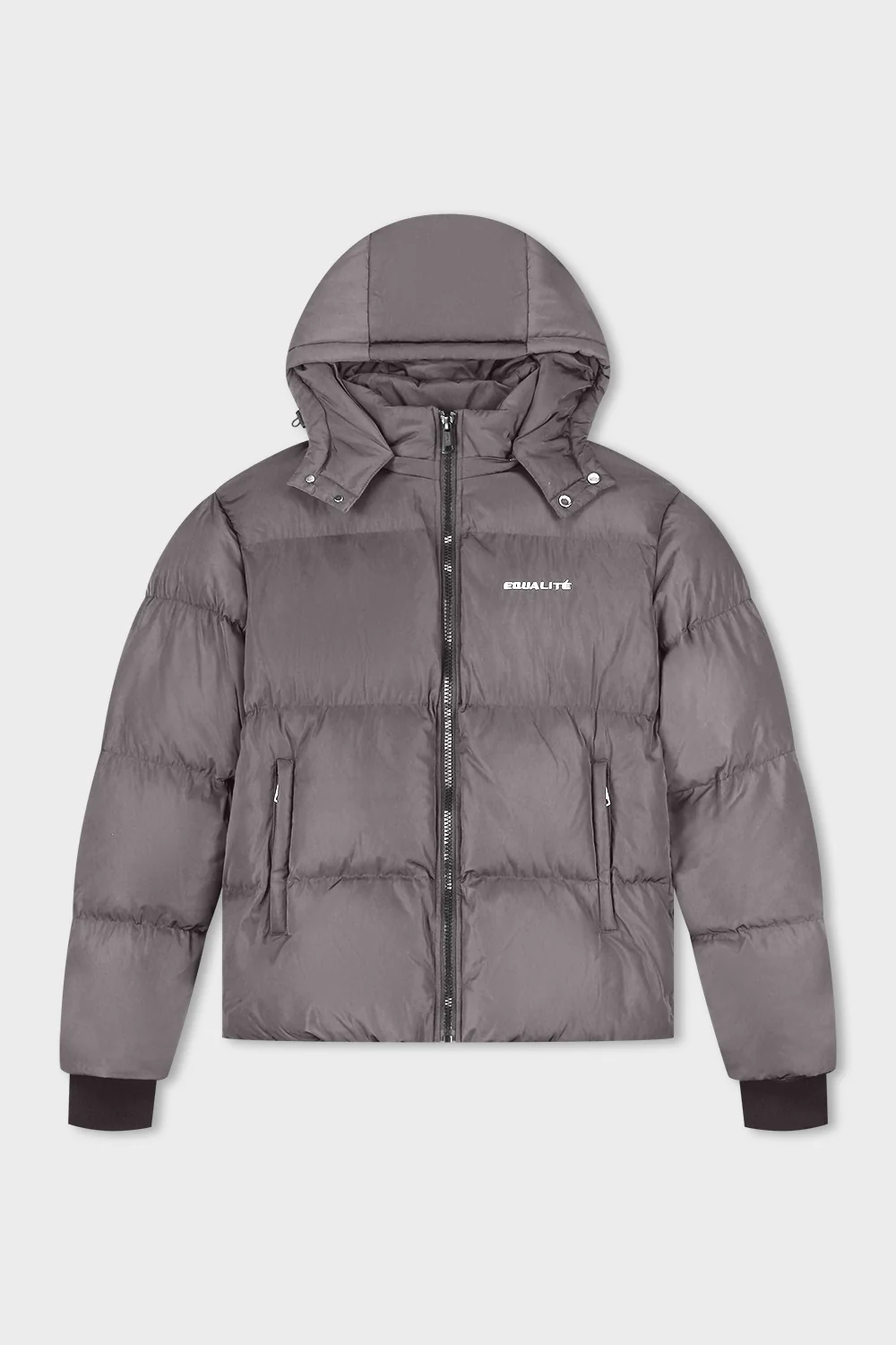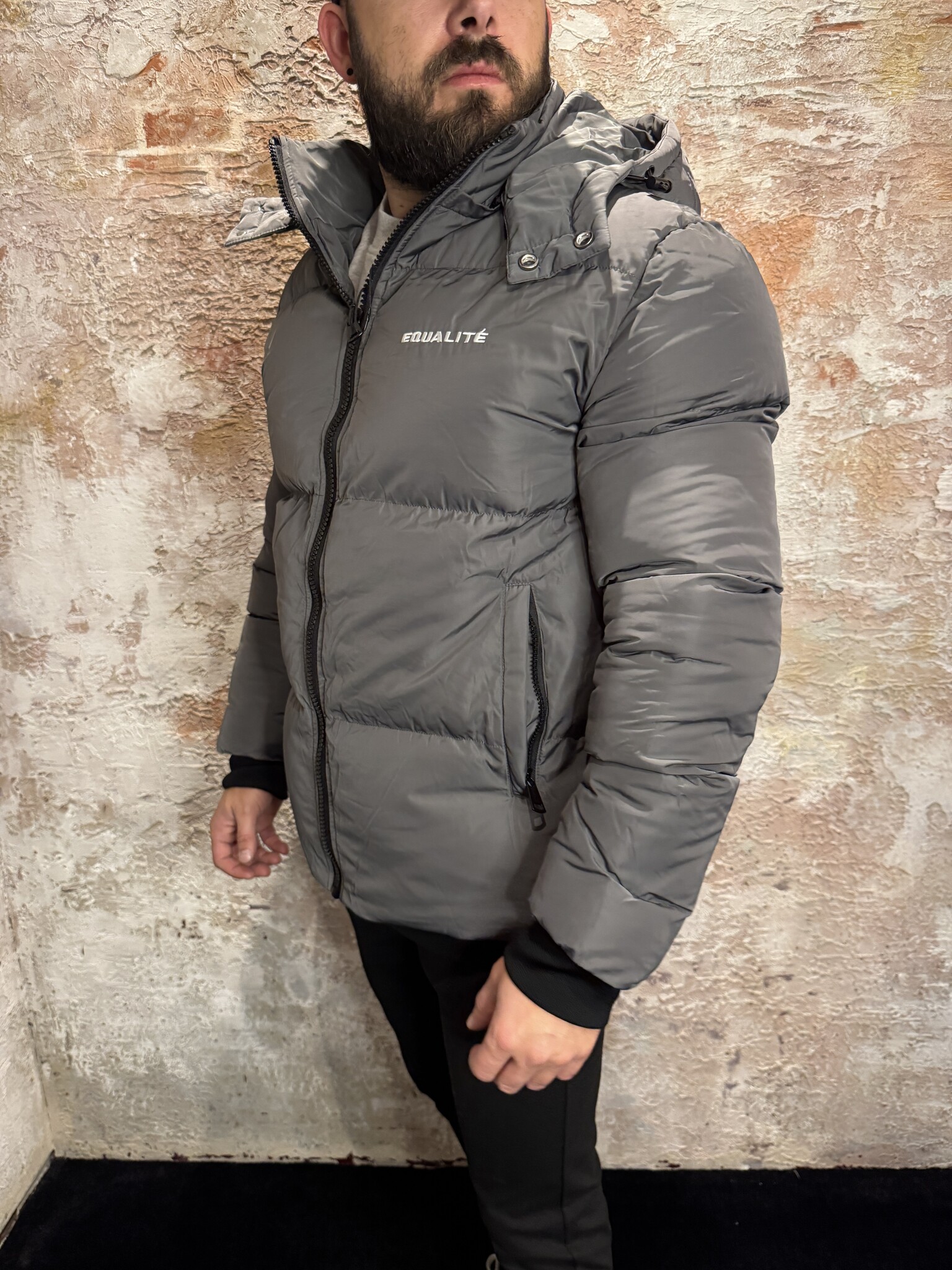 Equalité Essential Puffer Antra heren jas. Deze warme gewatteerde puffer in antraciet heeft een afneembare capuchon, ritssluiting, logo op borst en rug en een comfortabele pasvorm. Ideaal als stijlvolle en winddichte winterjas.