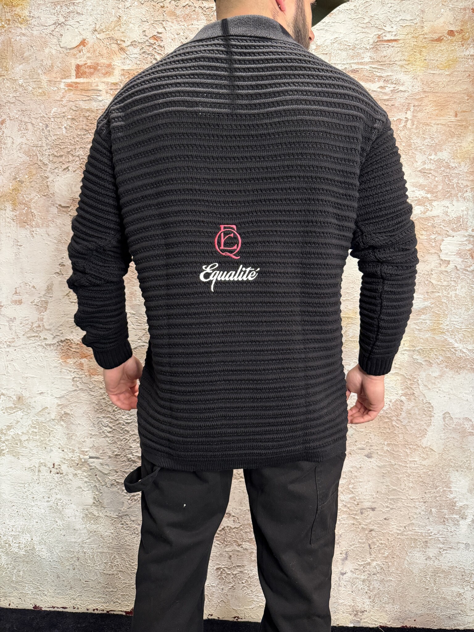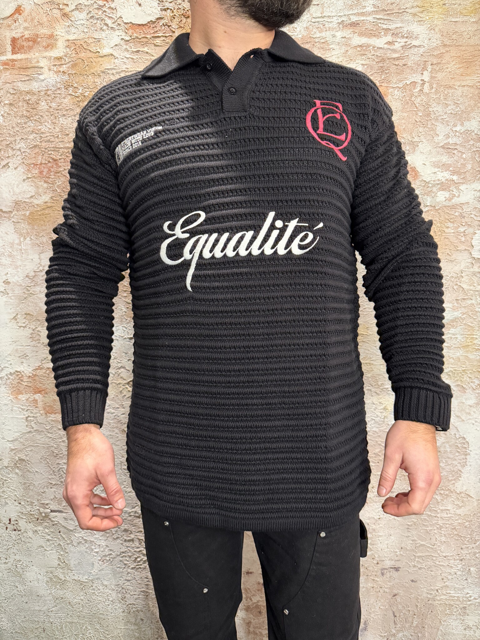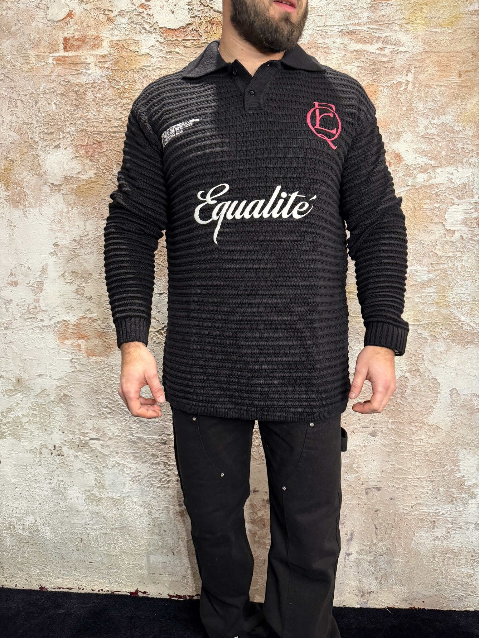 Stijlvolle ribgebreide lange polo van Equalité in zwart. Voorzien van kraag met knoopsluiting, geborduurd logo op de borst en subtiele backprint. Gemaakt van een comfortabele knit met luxe uitstraling. Perfect te dragen casual of smart-streetwear.
