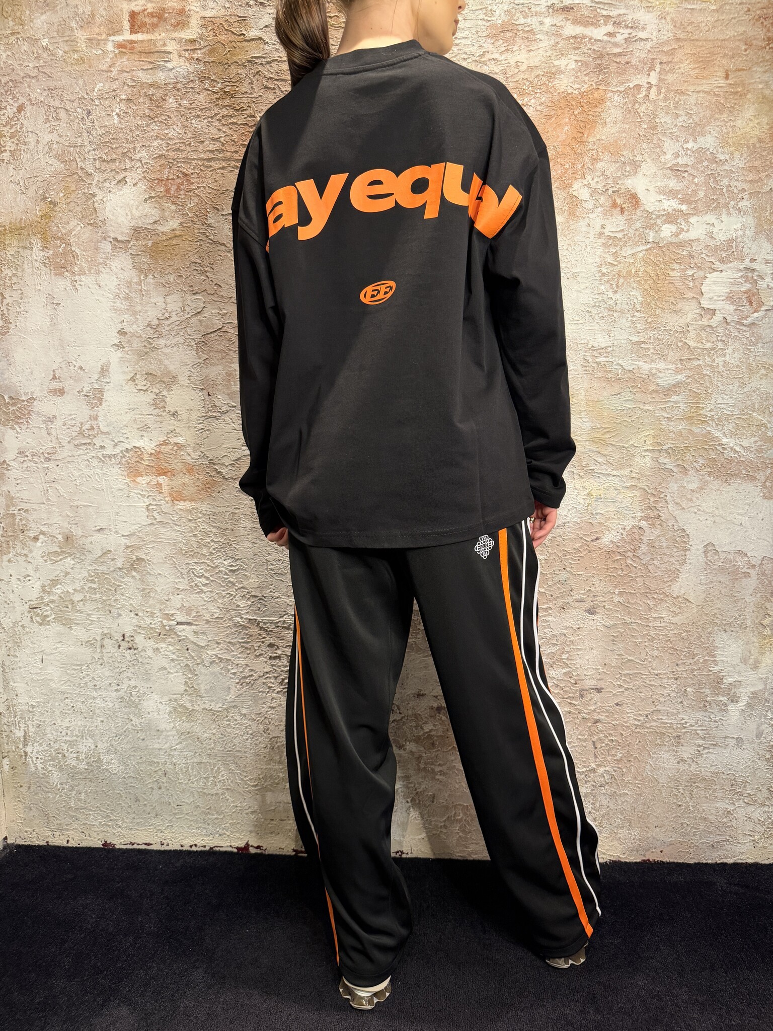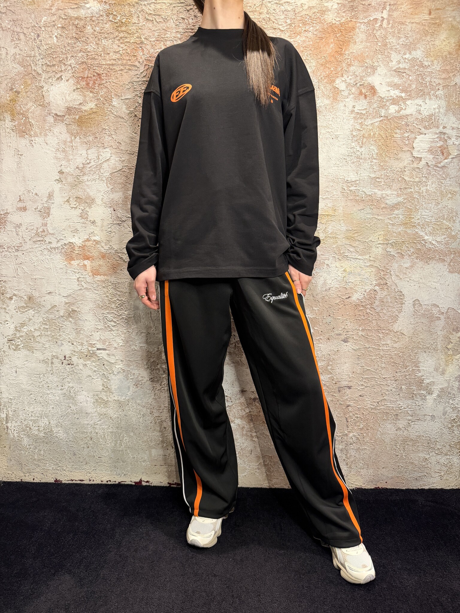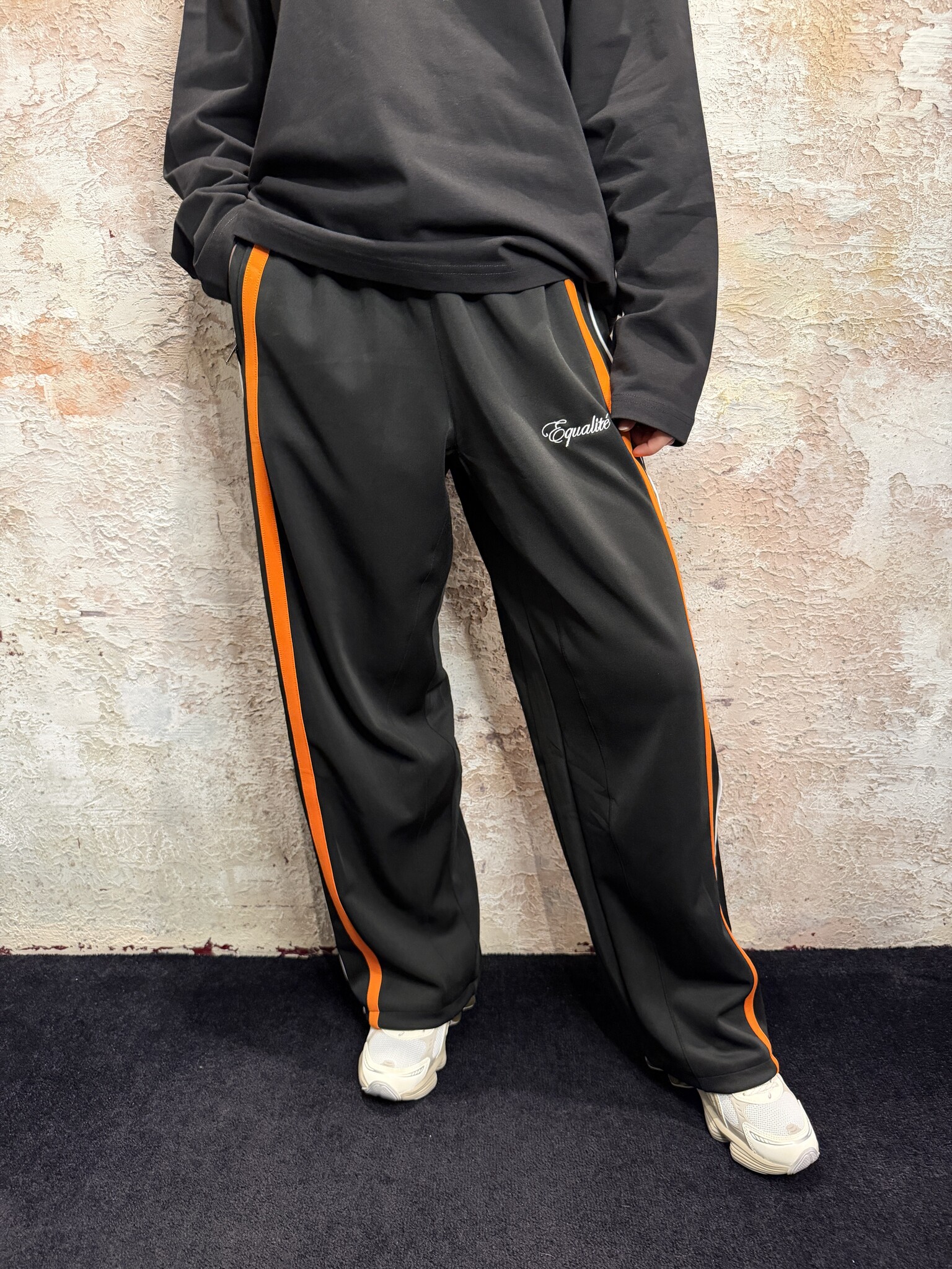 Equalité Oversized Unisex Trackpants Black Orange. Trendy trackpants met relaxte fit, opvallende oranje zijstrepen en subtiel logo. Comfortabele stof en perfecte pasvorm voor streetwear looks. Combineer casual of sportief. Must-have voor elke outfit.