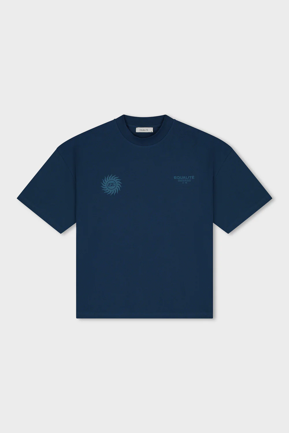 Equalité Sunny Boxy Tee Navy. Donkerblauw heren T-shirt met boxy fit en grote backprint. Comfortabele katoenen kwaliteit met subtiel logo op de borst. Modern streetwear design, perfect voor casual outfits. Combineer met jeans of short voor een trendy look