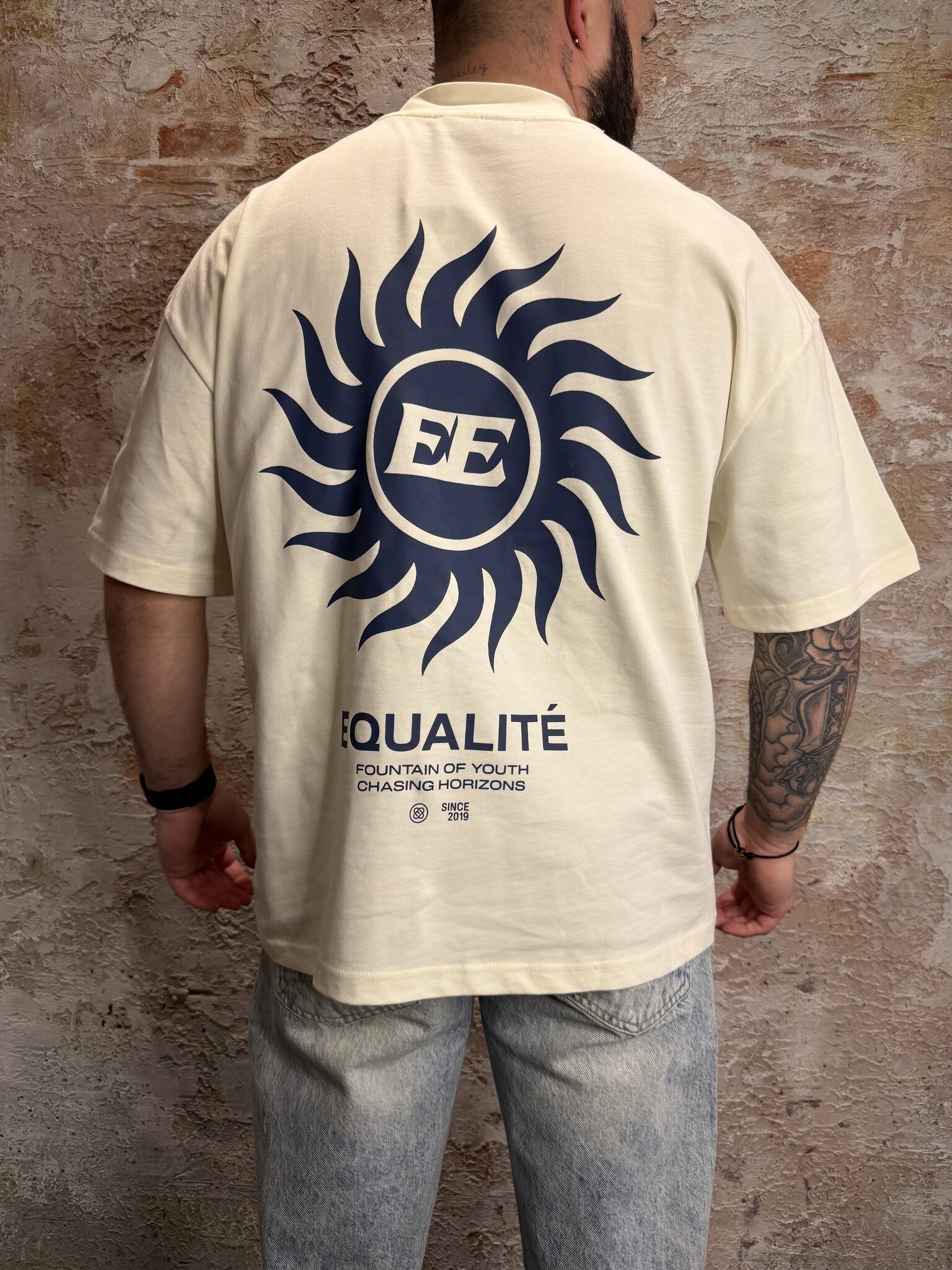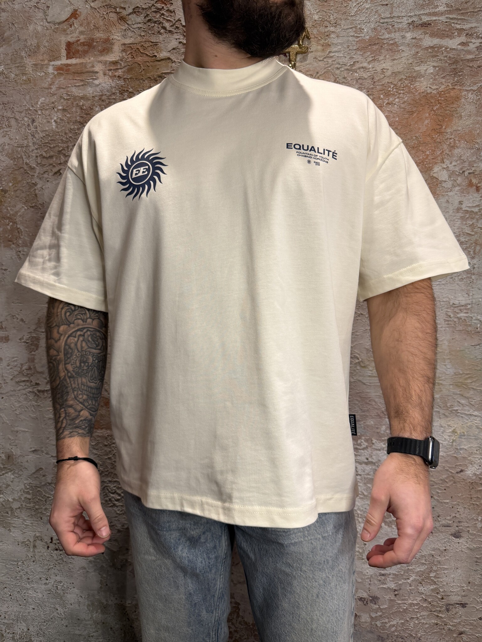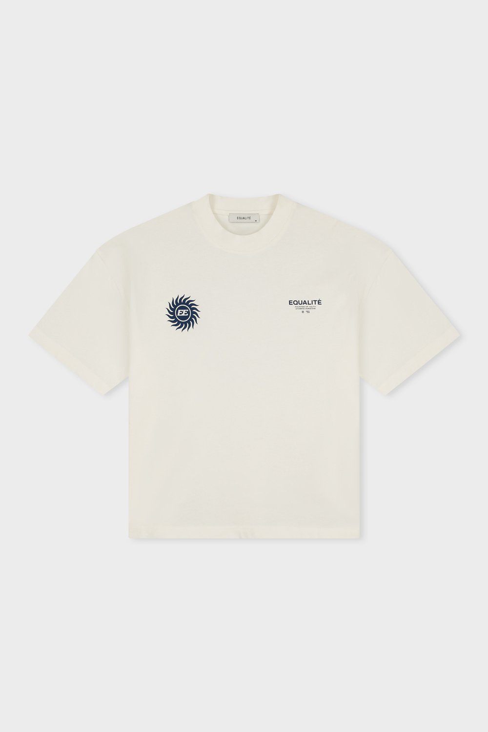 De Equalité Sunny Boxy Tee in Off White Navy heeft een oversized boxy fit en is gemaakt van premium katoen. Met subtiel logo op de borst en grote sun backprint in navy. Een frisse, zomerse streetwear essential met comfortabele en moderne uitstraling.