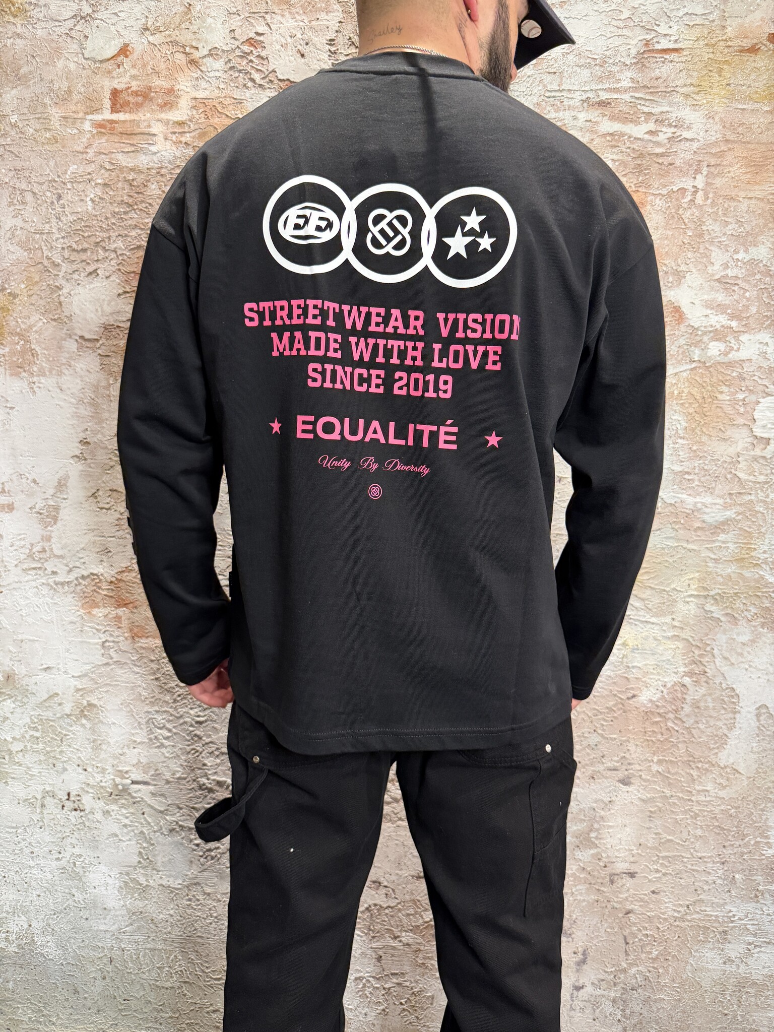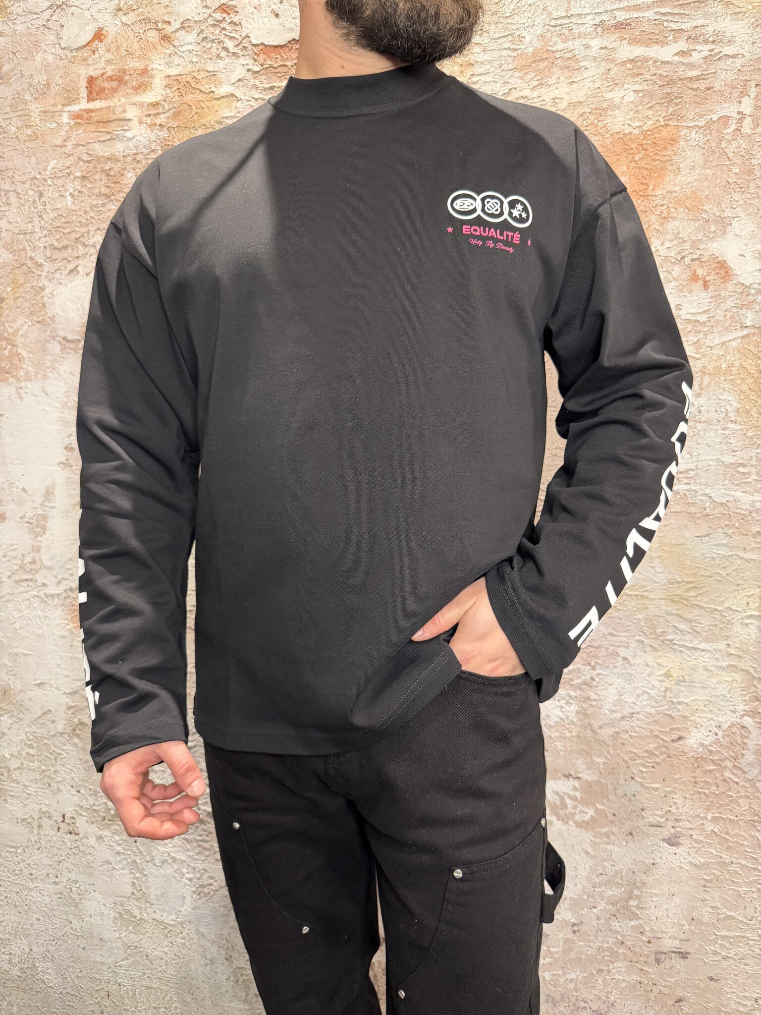 Oversized longsleeve van Equalité zwart roze. Voorzien van klein borstlogo, statement tekst en iconische backprint. Afgewerkt met logoprints op de mouwen. Gemaakt van comfortabel katoen met een relaxte fit, perfect voor een streetwear look. Model draagt X