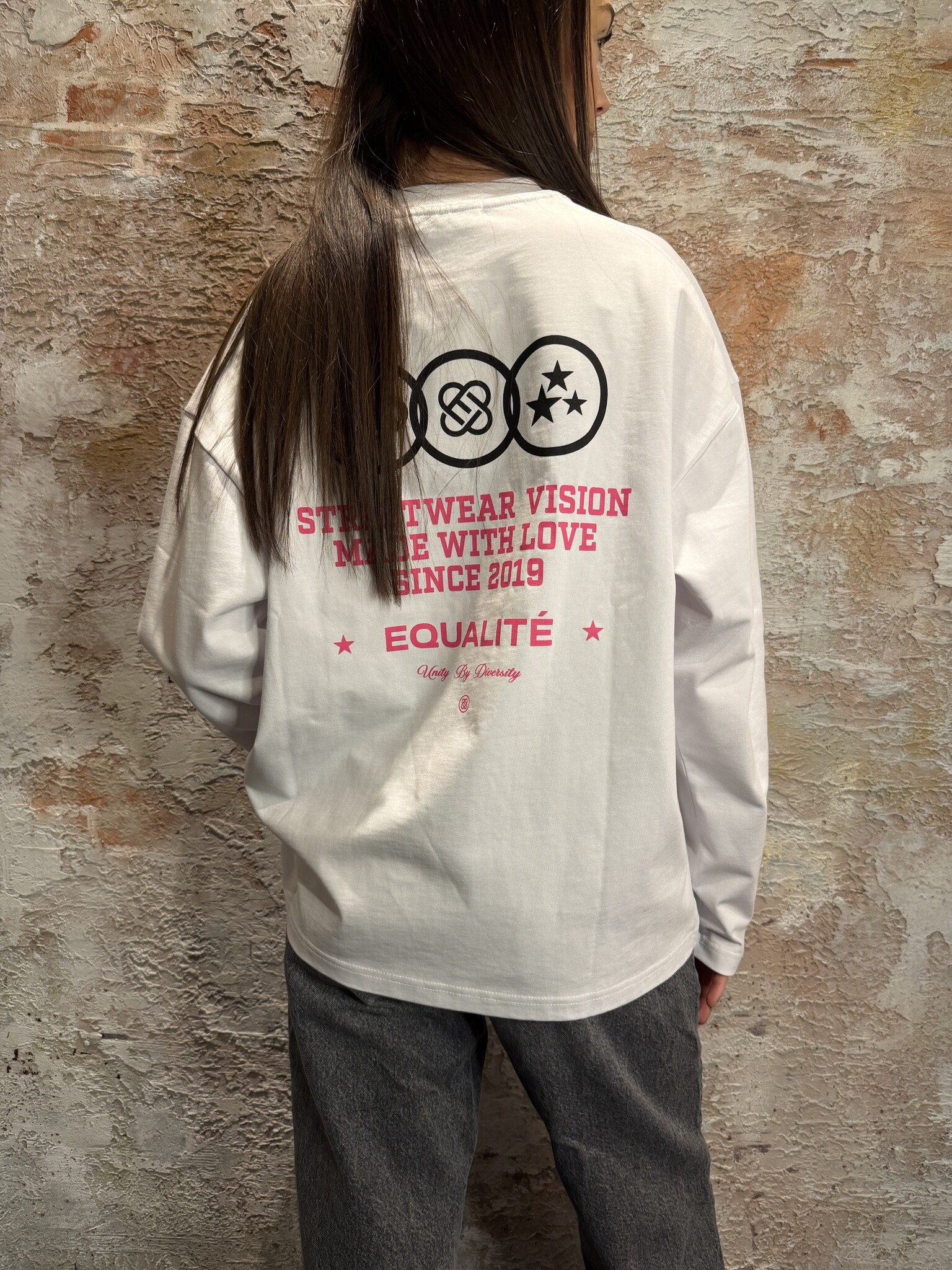 Oversized longsleeve van Equalité in White. Voorzien van klein borstlogo, statement tekst en iconische backprint. Afgewerkt met logoprints op de mouwen. Gemaakt van comfortabel katoen met een relaxte fit, perfect voor een streetwear look. Model draagt XS