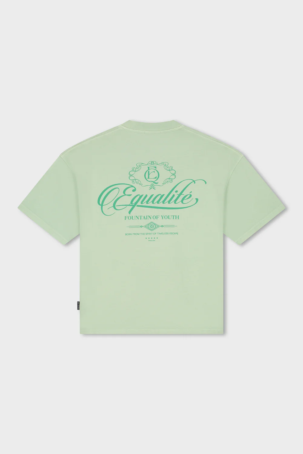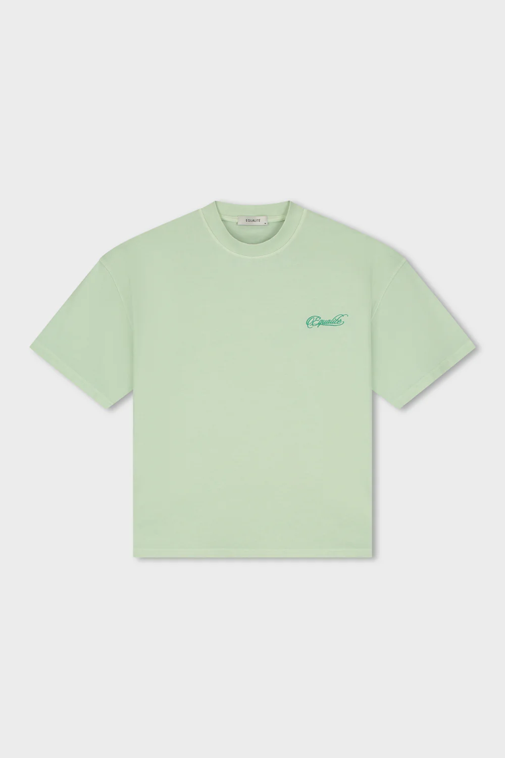 Equalité Yuki Boxy Tee Light Green. Lichtgroen heren T-shirt met boxy fit en grote backprint. Comfortabele katoenen kwaliteit met subtiel logo op de borst. Modern streetwear design. Perfect te combineren met jeans of short voor een zomerse casual look.