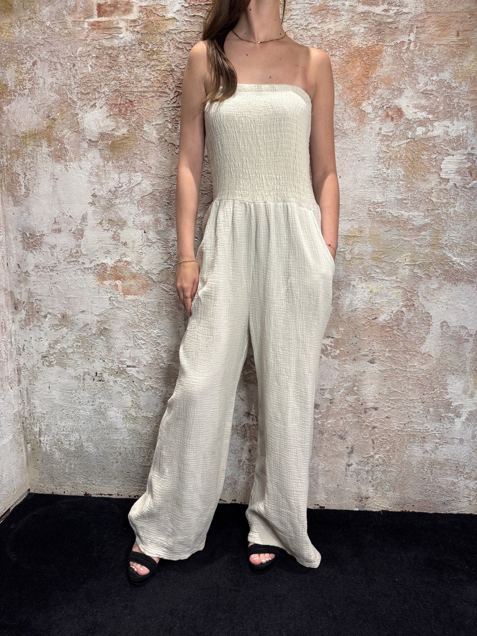 Deze Musthave Offshoulder Jumpsuit in Beige is een elegante, strapless jumpsuit in tijdloos beige. De soepele, geplooide stof en rechte wide-leg pasvorm zorgen voor een chique look. Perfect voor een etentje of een zomerse avond uit. Musthave alert!