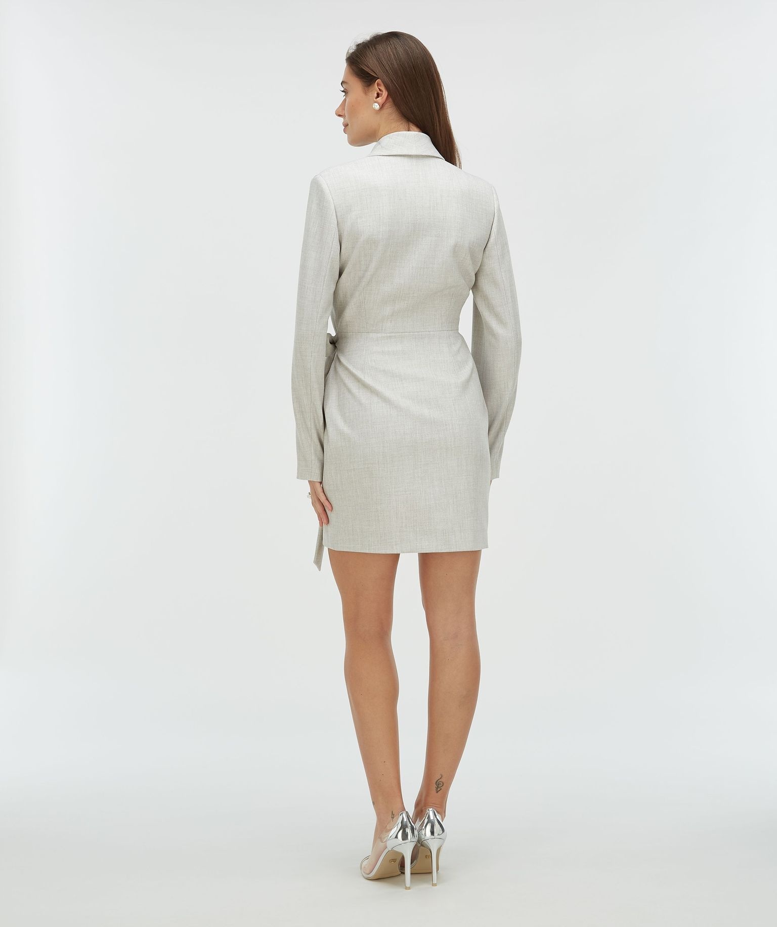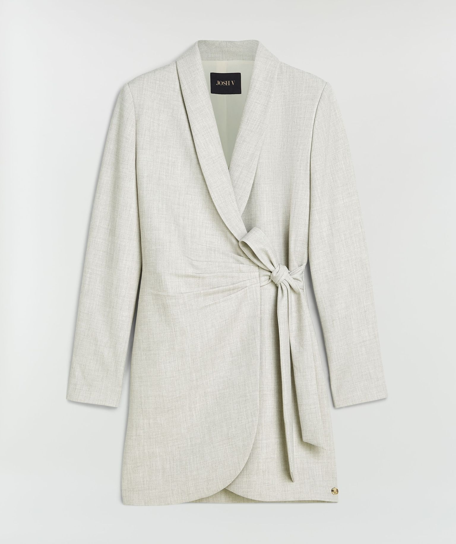 Josh V Bonita Dress Light Grey Melange is een stijlvolle blazerjurk met strikceintuur. De lange mouwen en getailleerde pasvorm zorgen voor een elegante look. Perfect voor zowel zakelijke als chique gelegenheden.