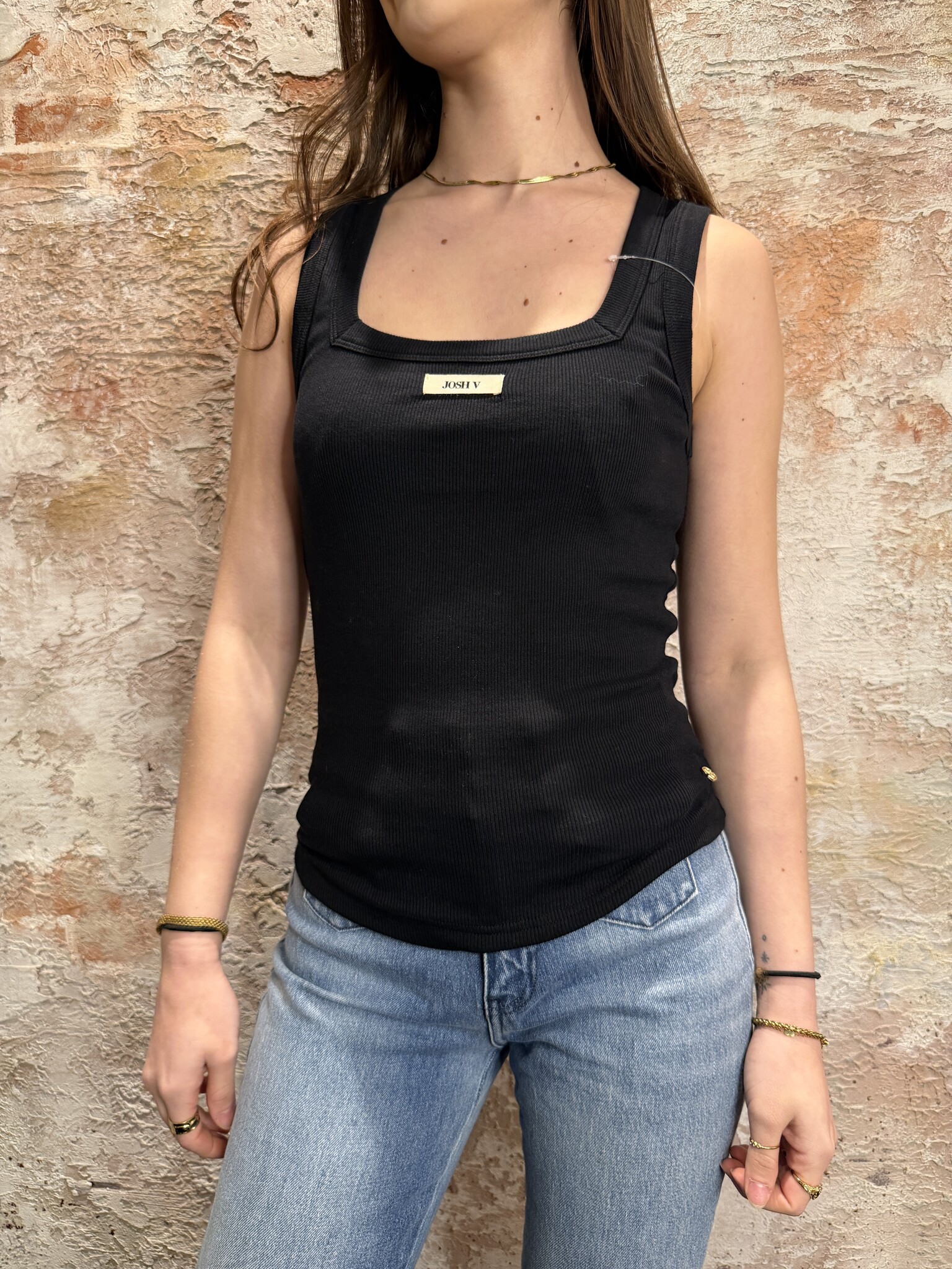 Stijlvolle Josh V halter top in zwart met een moderne vierkante halslijn. De top heeft een aangesloten pasvorm en zachte ribstof die comfortabel draagt. Perfect te combineren met jeans, rok of pantalon voor een elegante en trendy look.