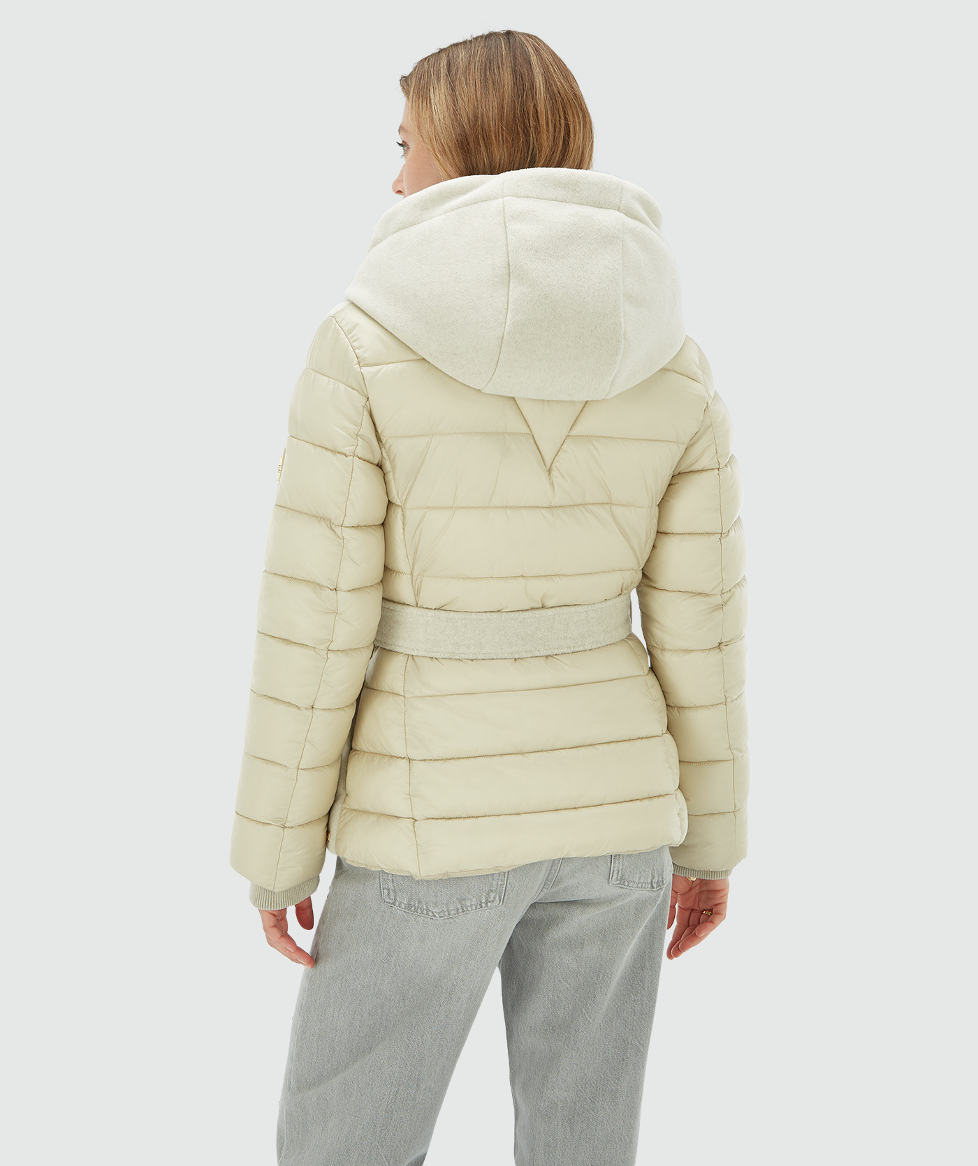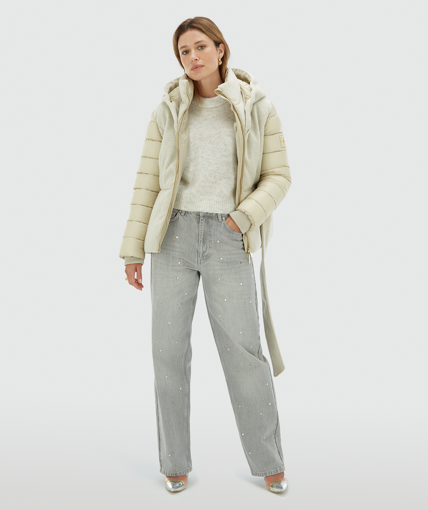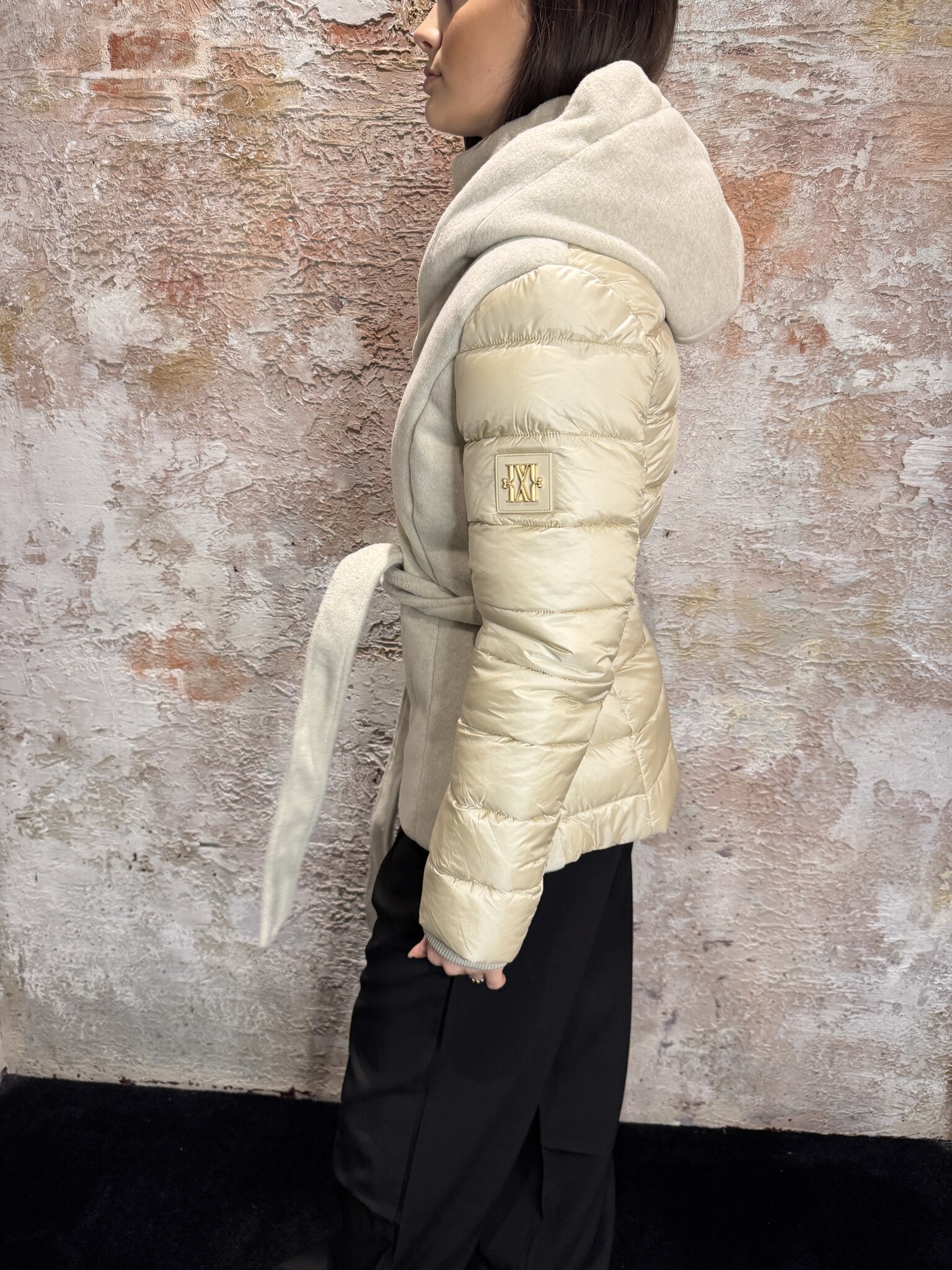 Josh V Gracia Jacket Light Beige is een elegante jas met een mix van gewatteerde mouwen en een zachte wollook body. Voorzien van ceintuur voor een getailleerde pasvorm, capuchon, goudkleurige details en logo. Comfortabel, perfect voor winterse dagen.