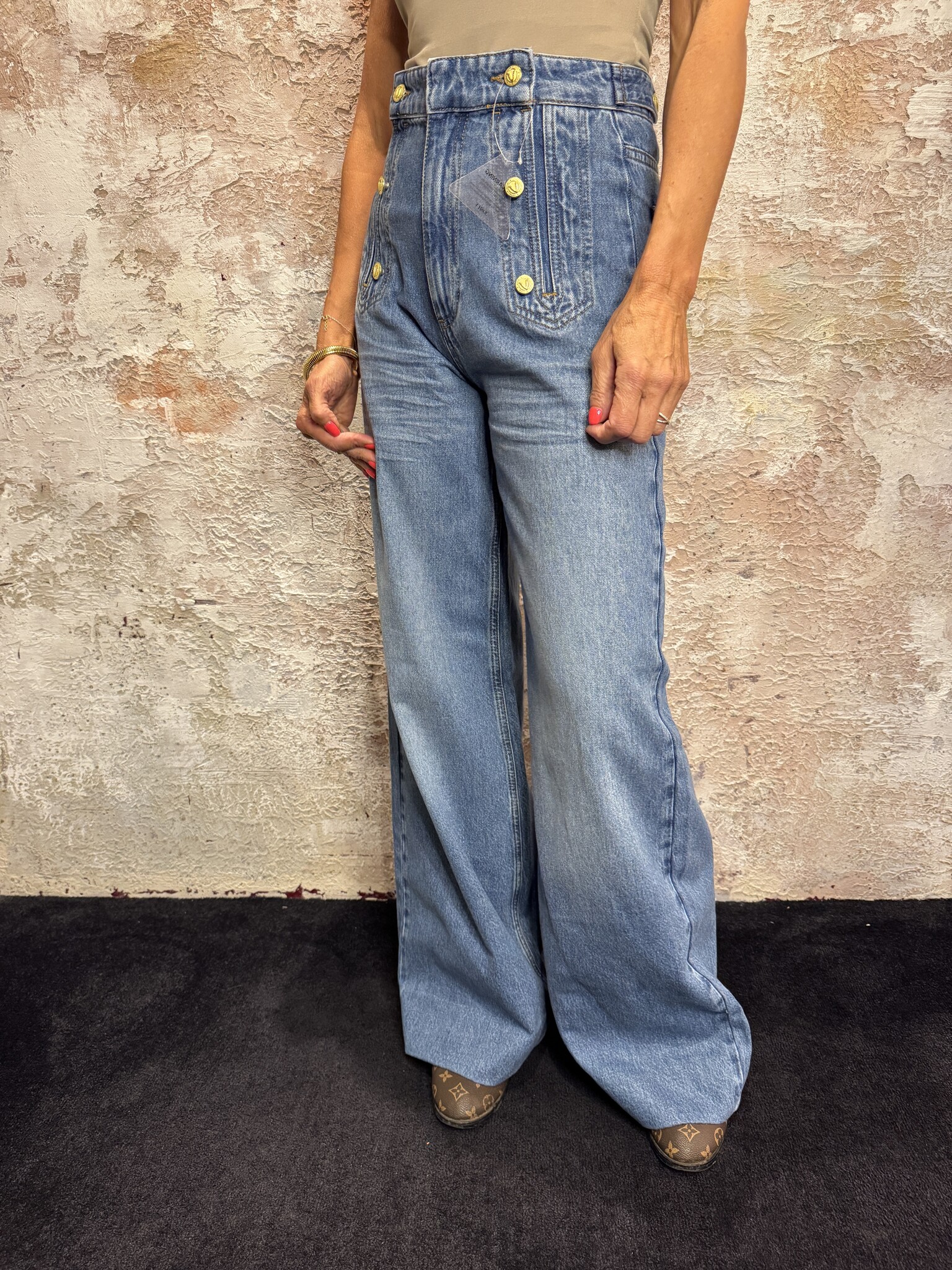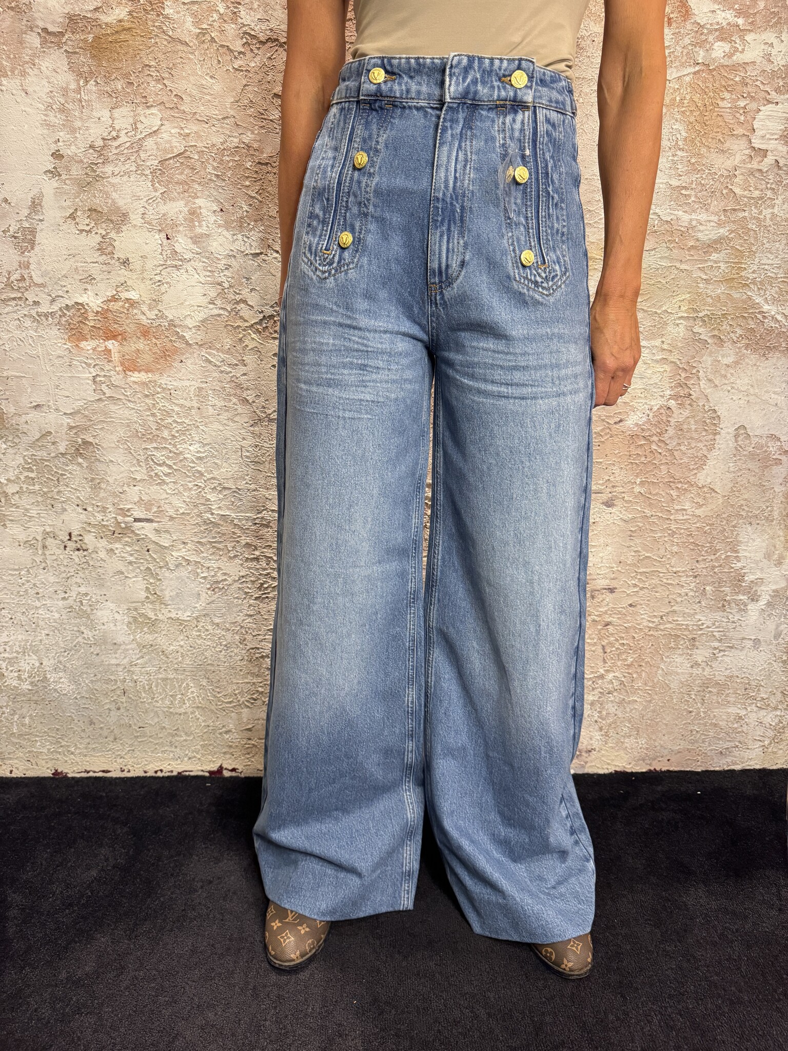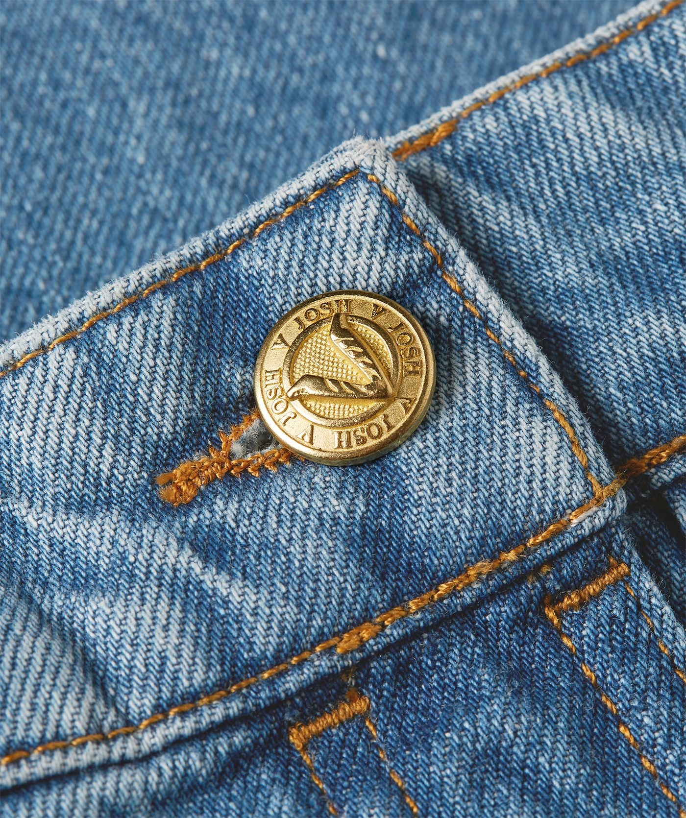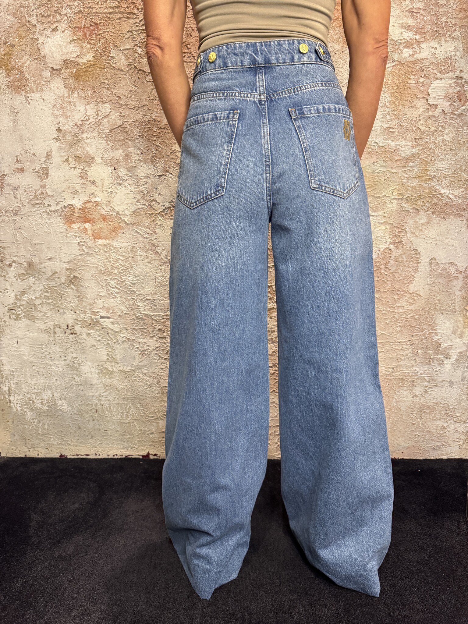 Josh V Rumo Denim Dark Blue. Trendy wide leg jeans voor dames in donkerblauw denim met hoge taille, goudkleurige JV knopen en subtiel logo detail. Comfortabele pasvorm en een echte eyecatcher. Perfect te combineren met blouses voor een stijlvolle look.
