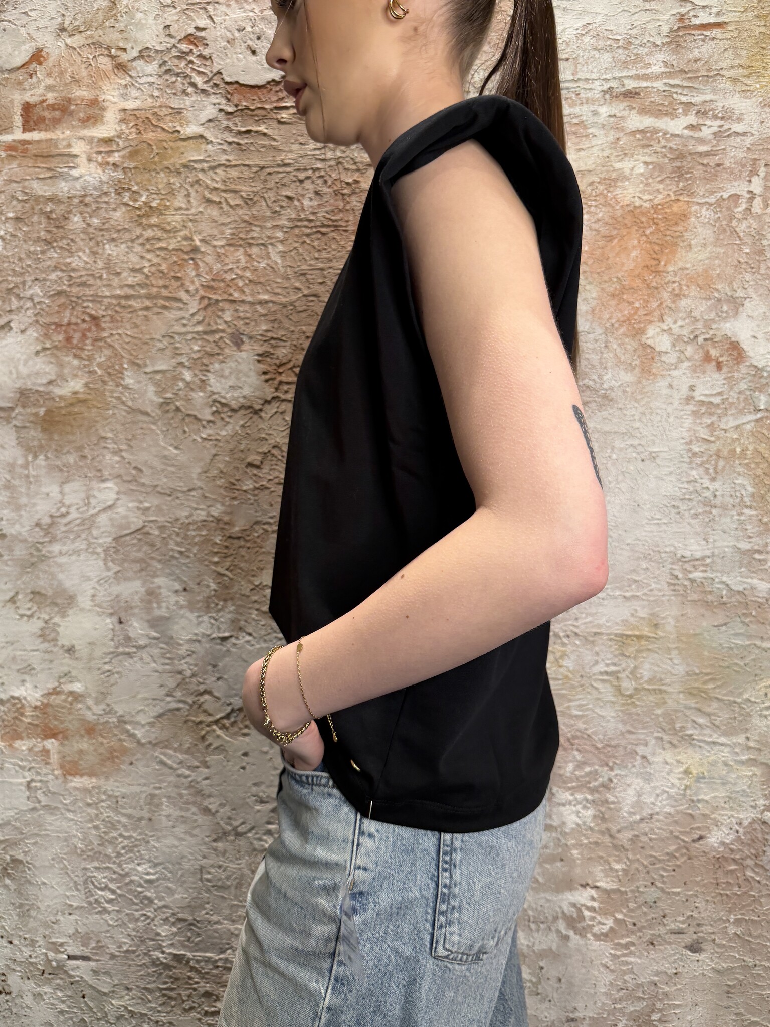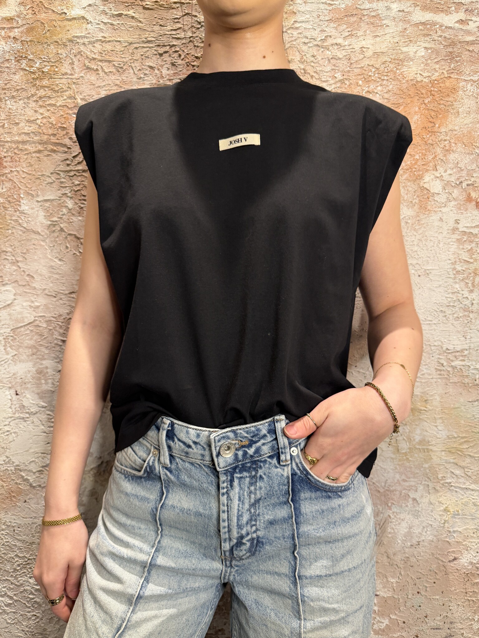 Josh V Sue T-Shirt met schoudervulling Black. Stijlvolle top met sterke schouderdetails en een moderne, minimalistische look. Comfortabele stof en rechte fit, perfect te combineren met jeans of pantalon voor een krachtige, trendy outfit.