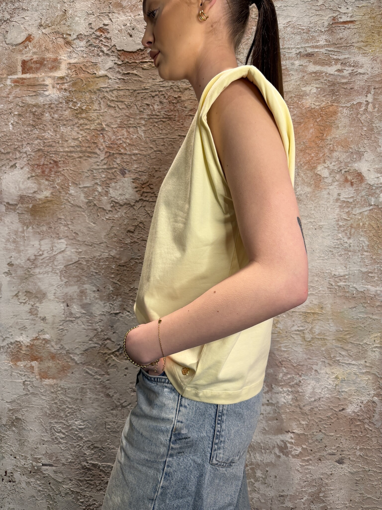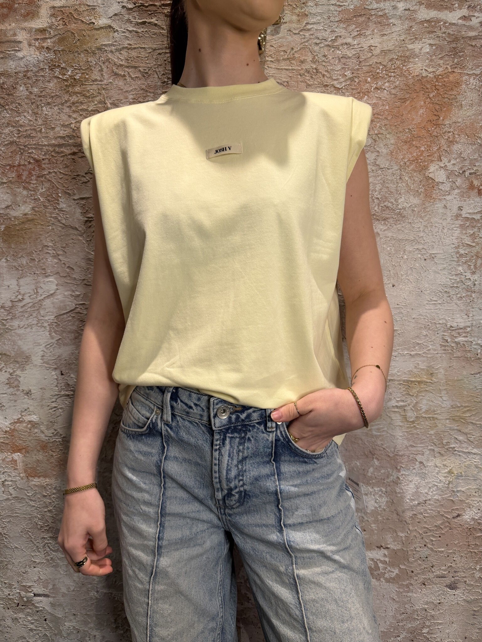 Josh V Sue T-Shirt Yellow. Trendy T-shirt met schoudervulling voor een krachtige, vrouwelijke look. De zachte stof en subtiele pasvorm maken ‘m perfect voor elke dag. Combineer casual met jeans of chic met een rok. Must-have basic met luxe uitstraling.