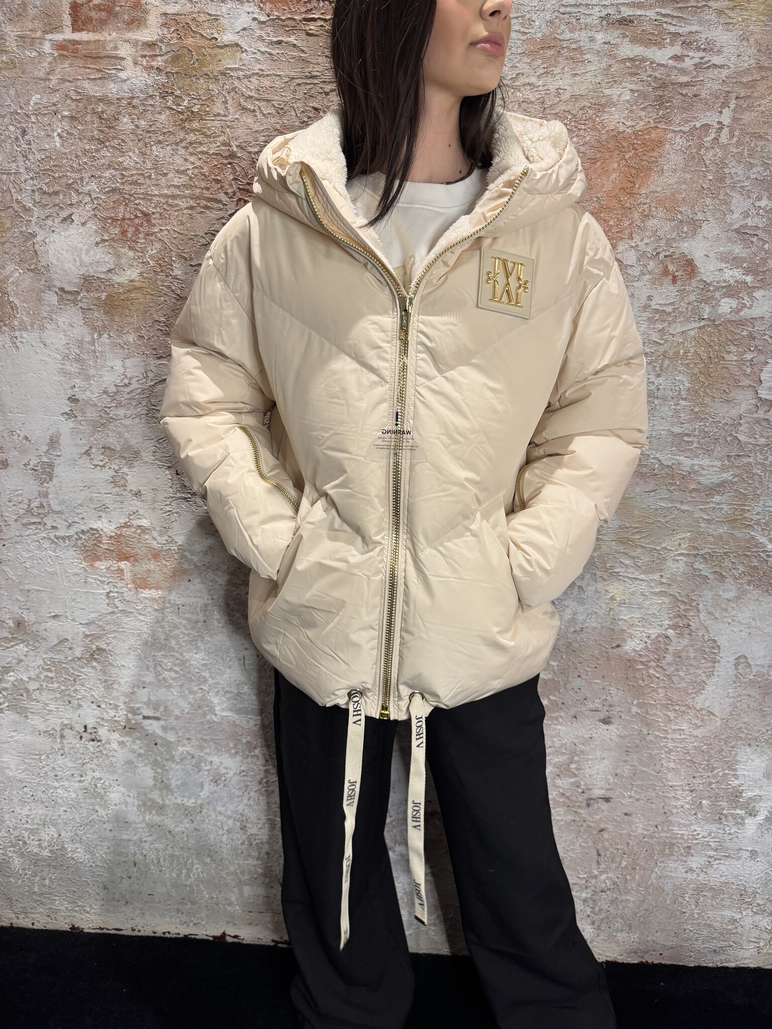 Josh V Wrenna Oversized Jacket Light Ecru is een luxe, gewatteerde winterjas met oversized fit en capuchon. Uitgevoerd in licht ecru met goudkleurige details, logo-badge en ritsen. Afgewerkt met branded trekkoorden en comfortabele zakken. Warm en trendy.