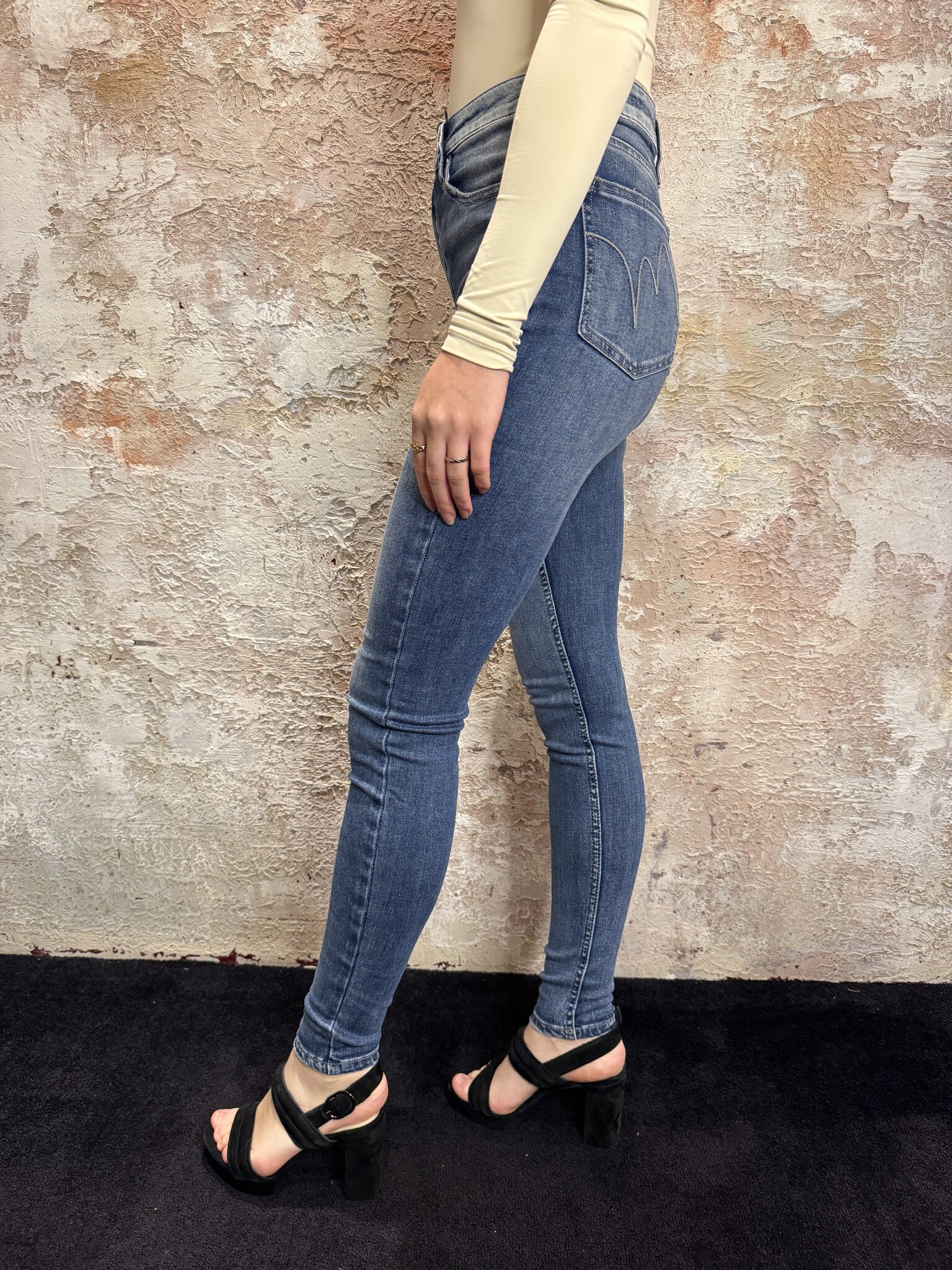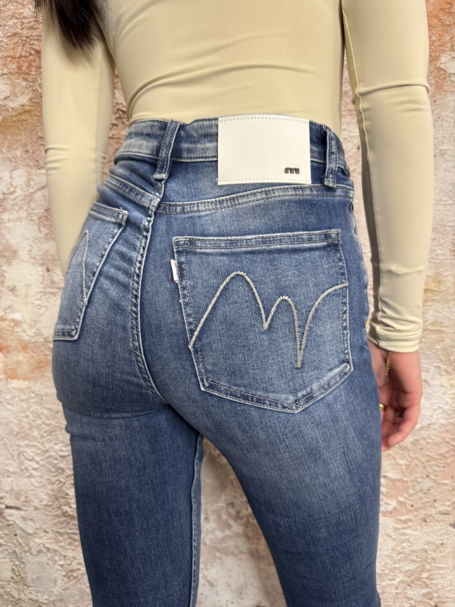 Met Jeans Cara T1L808 High Waist Blue. Dames skinny jeans met hoge taille, perfecte stretch en flatterende pasvorm. Lichtblauwe wassing met het iconische M-stiksel op de achterzakken. Comfortabel, stijlvol en ideaal voor elke look.