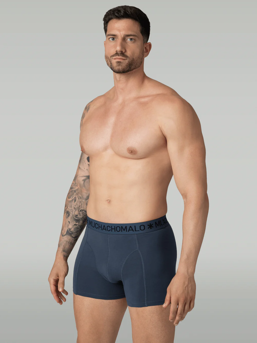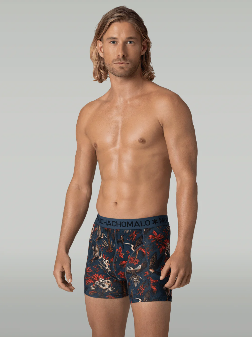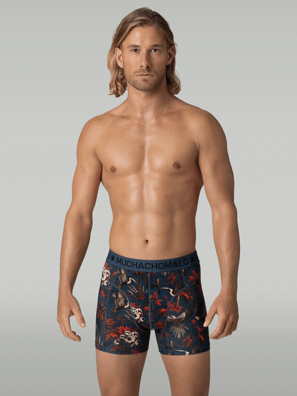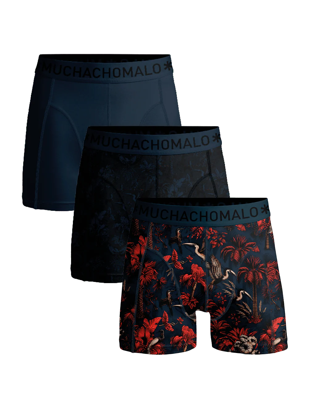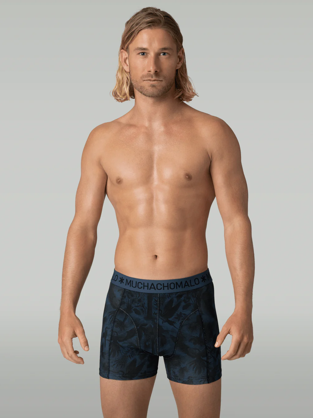 Muchachomalo 3 Pack Palm Birds boxershorts voor heren. Set van drie shorts in donkerblauw tinten met tropische palm- en vogelprints. Gemaakt van zacht katoen met comfortabele elastische tailleband voor een perfecte pasvorm en stijlvol draagcomfort.