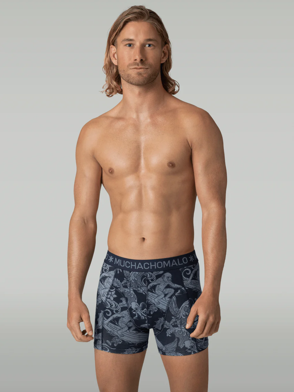 Muchachomalo 3 Pack Surf Monkey boxershorts voor heren. Set van drie shorts met speelse surfende apenprint en twee effen modellen. Gemaakt van zacht, ademend katoen met elastische band voor ultiem draagcomfort en perfecte pasvorm.