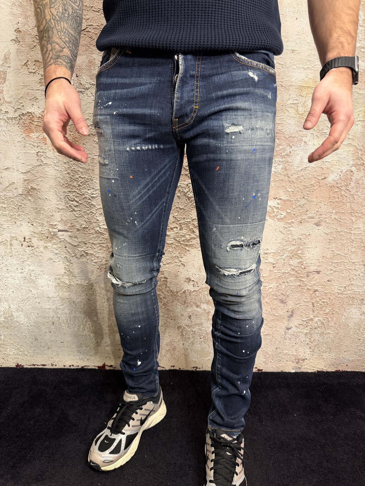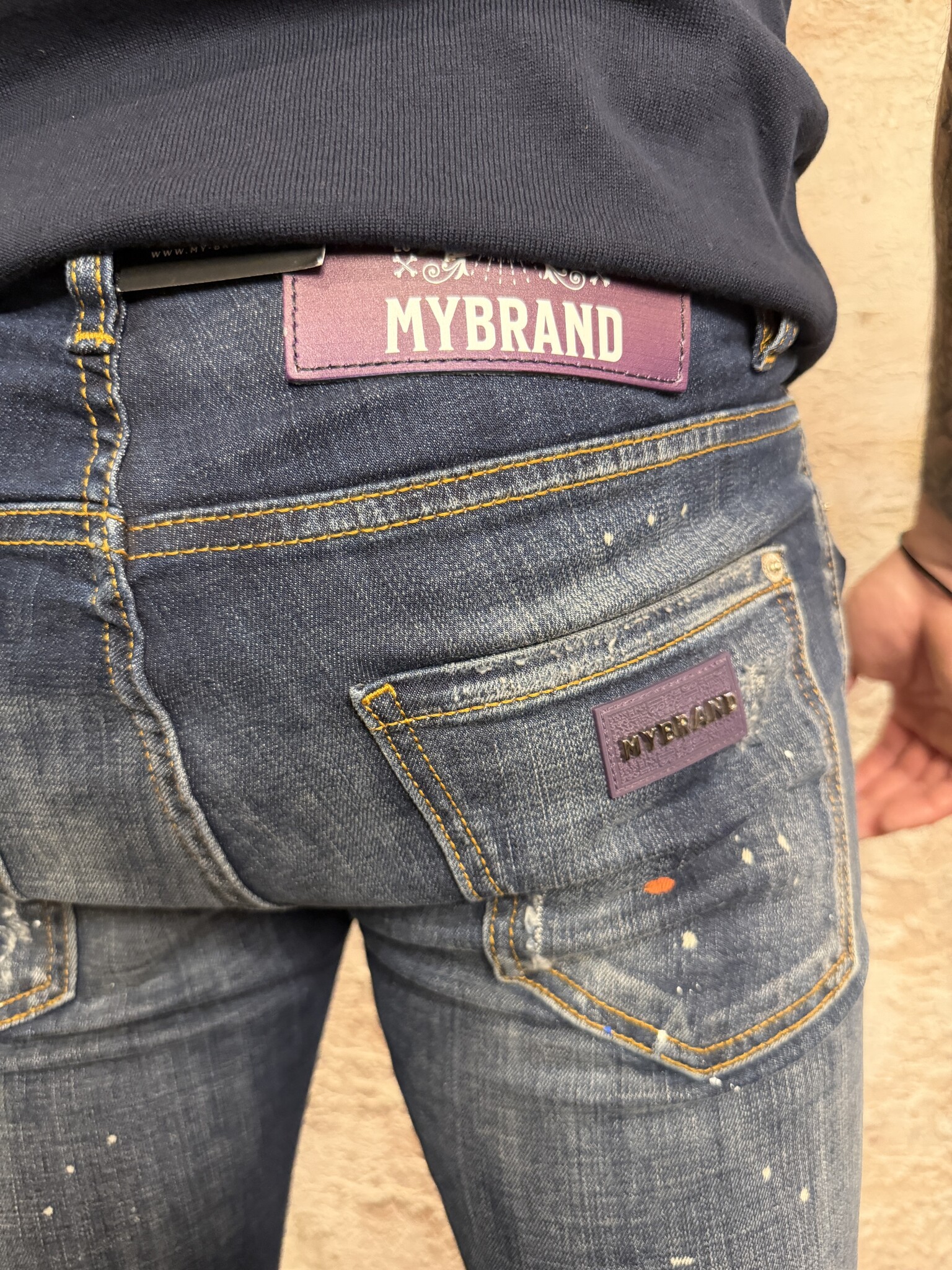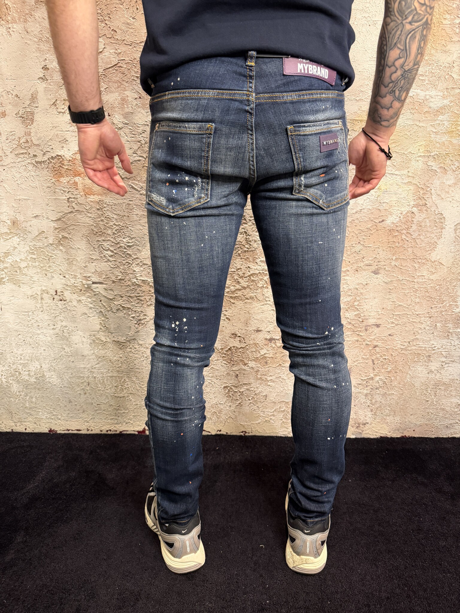 Stoere MyBrand heren jeans met slim fit en opvallende paint splatter en destroyed details. Deze blauwe denim jeans voor heren heeft een moderne pasvorm, stretch comfort en luxe afwerking. Perfect voor een trendy streetwear look.