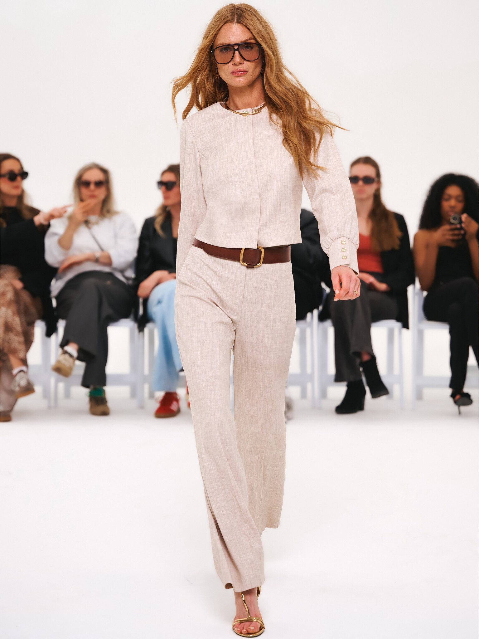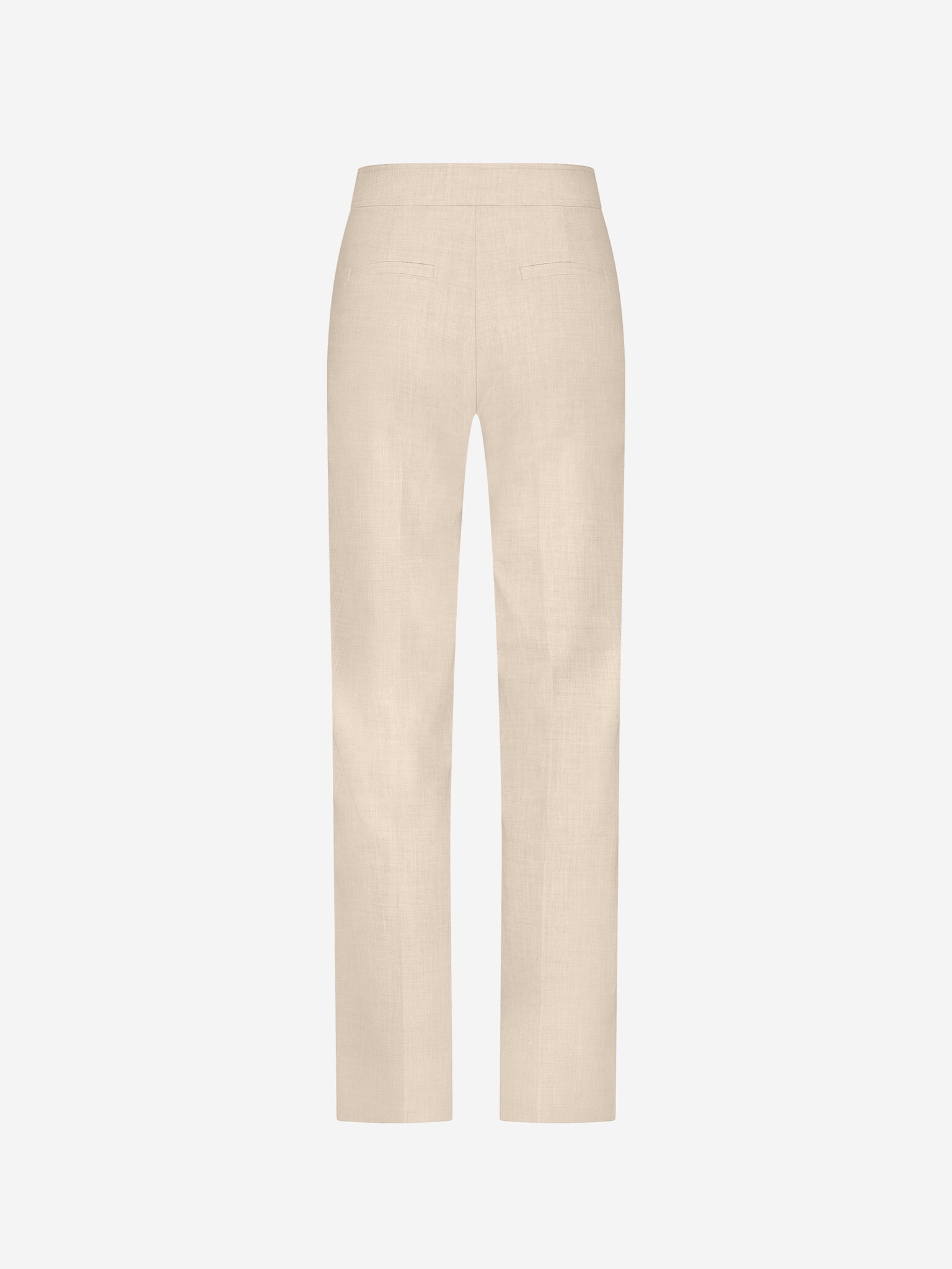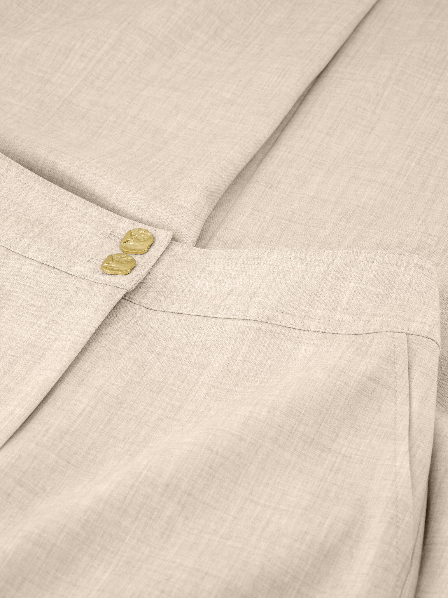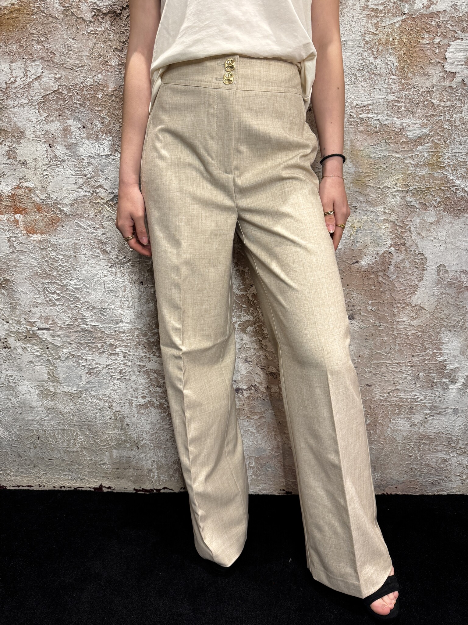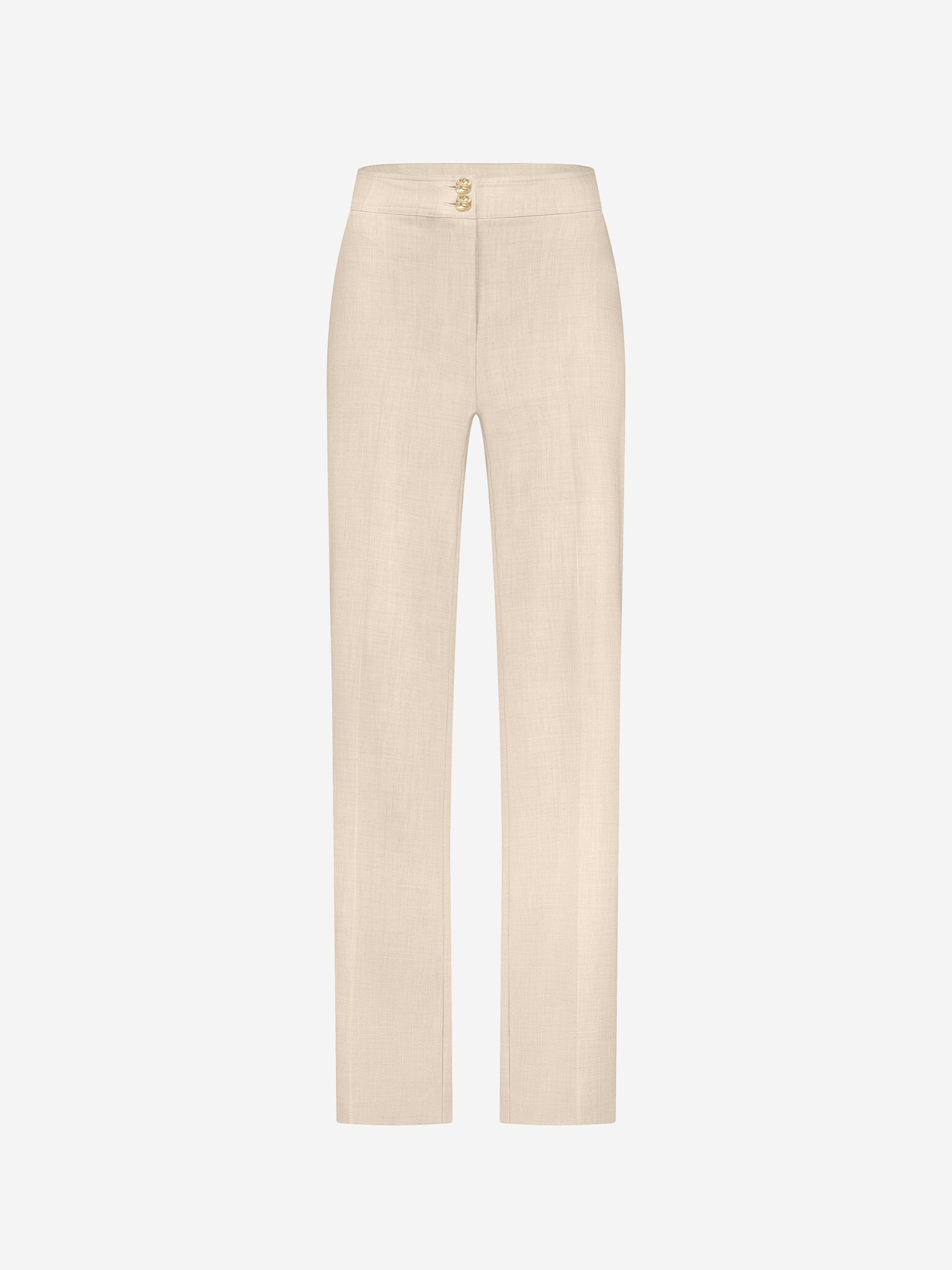 Nikkie Kiev Pants Cream is een elegante high-waist broek met rechte pijp en luxe gouden knopen. Gemaakt van luchtige linnenblend voor een stijlvolle zomerlook. Combineer met het bijpassende jasje voor een chique set. Model draagt maat 34.