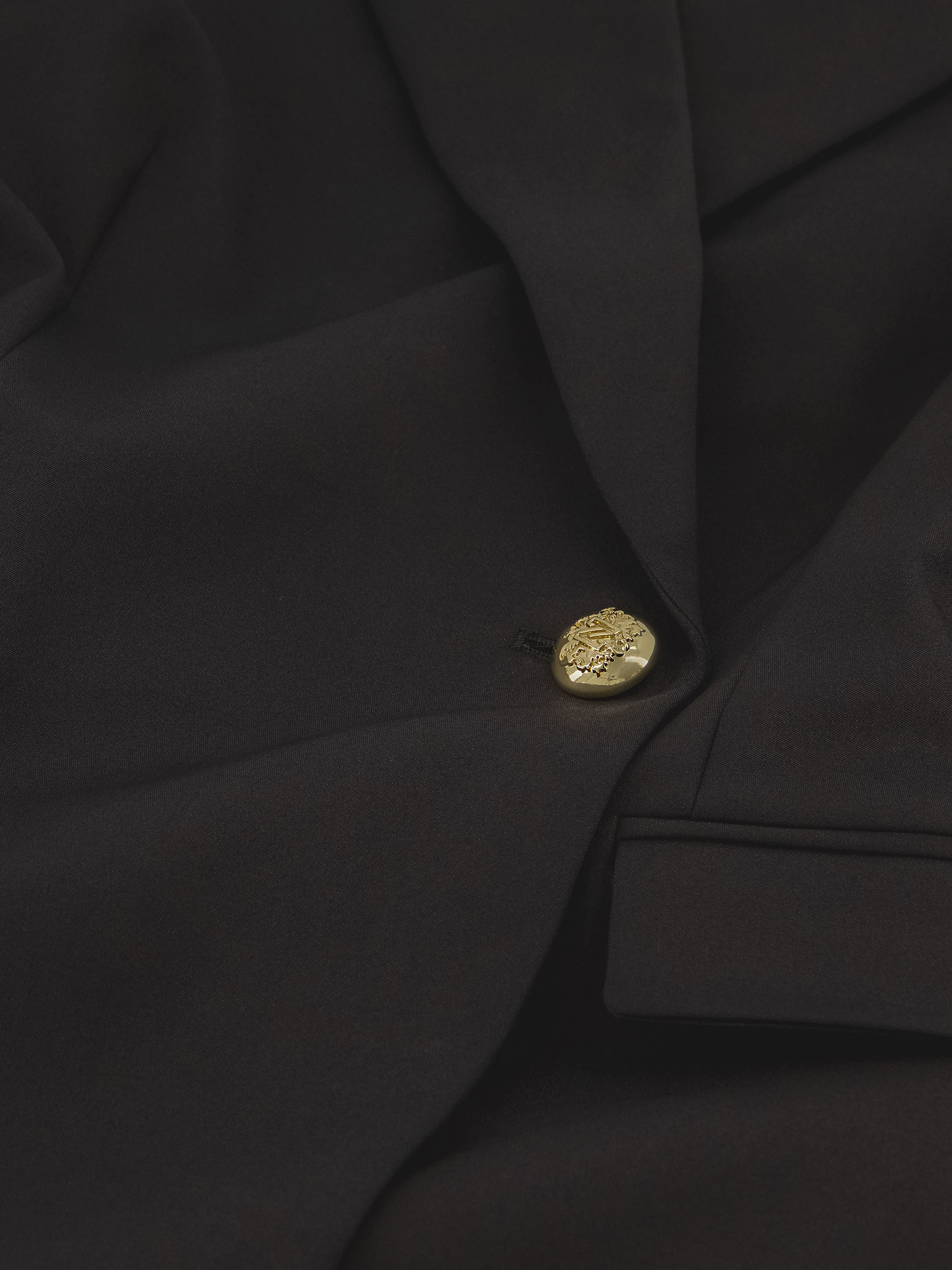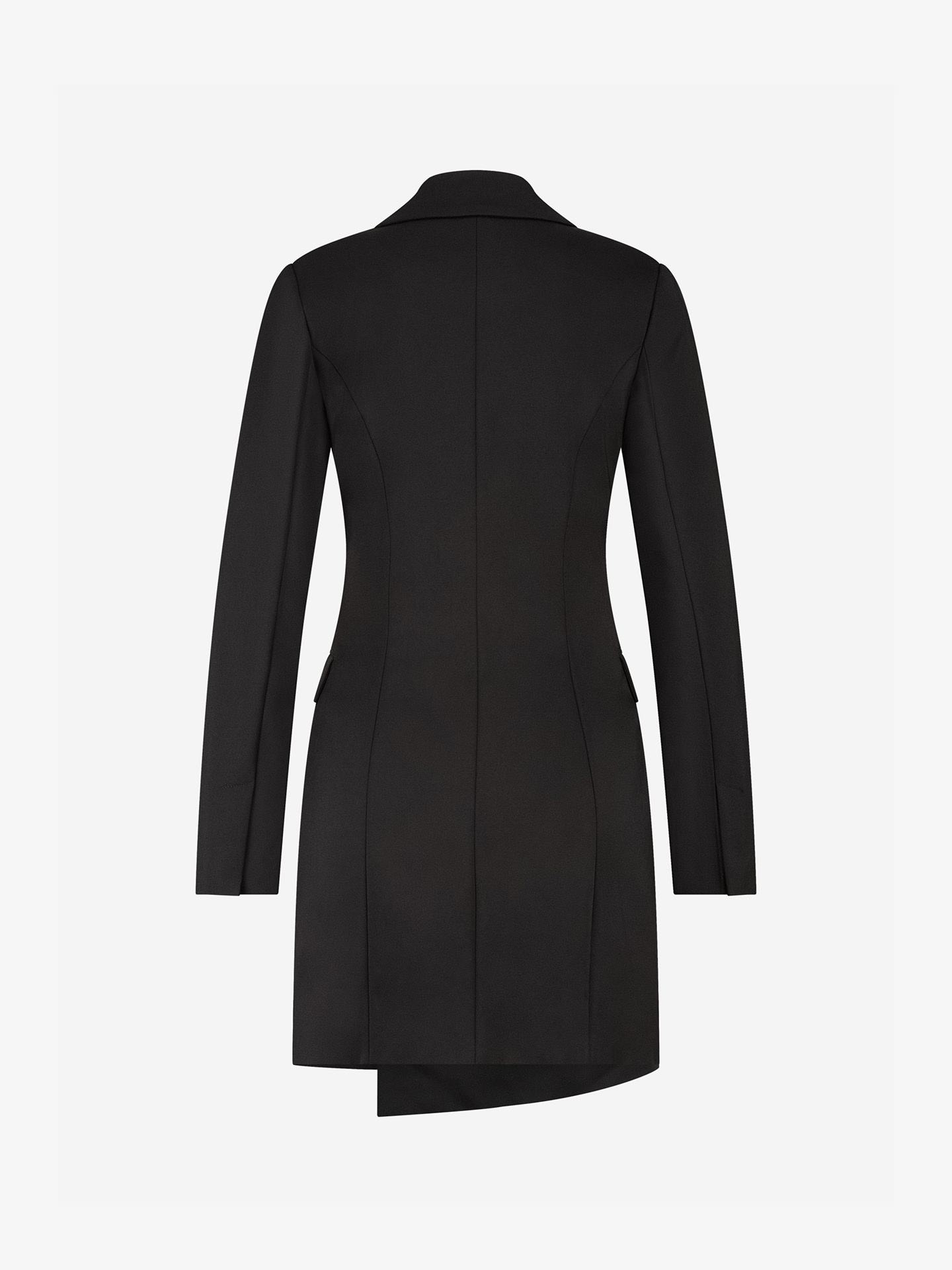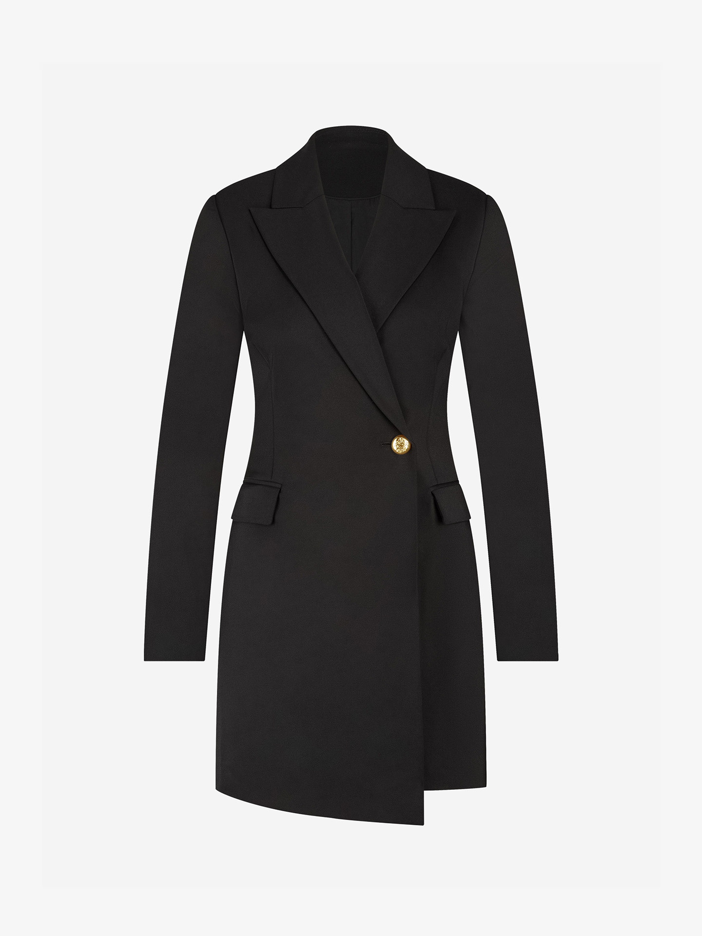 Nikkie Lancastero Asymmetrische Blazer Dress Black. Elegante zwarte blazerjurk met een asymmetrisch design, diepe revers en goudkleurige knoopsluiting. De getailleerde fit en luxe uitstraling maken deze jurk perfect voor een chique en krachtige look.