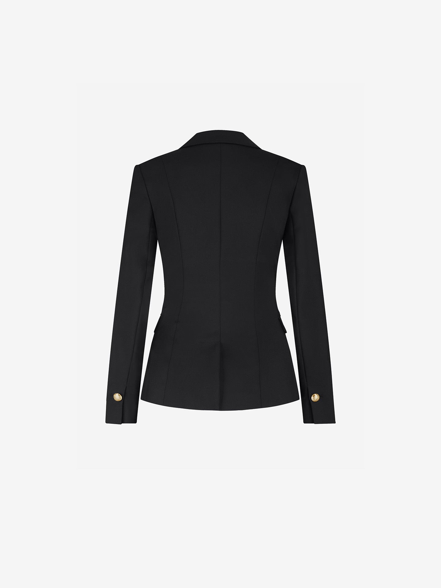 Nikkie Lancastero Getailleerde Blazer Black. Elegante zwarte blazer met getailleerde pasvorm, dubbele rij goudkleurige knopen en klassieke revers. Luxe uitstraling die zowel zakelijk als casual chic te combineren is voor een krachtige, stijlvolle look.