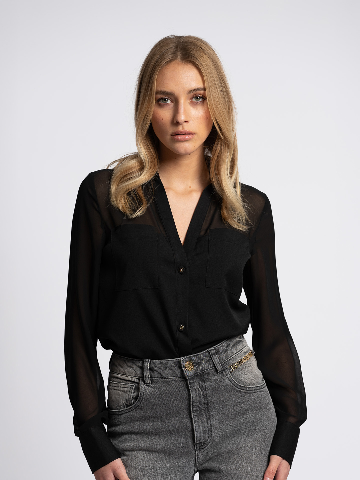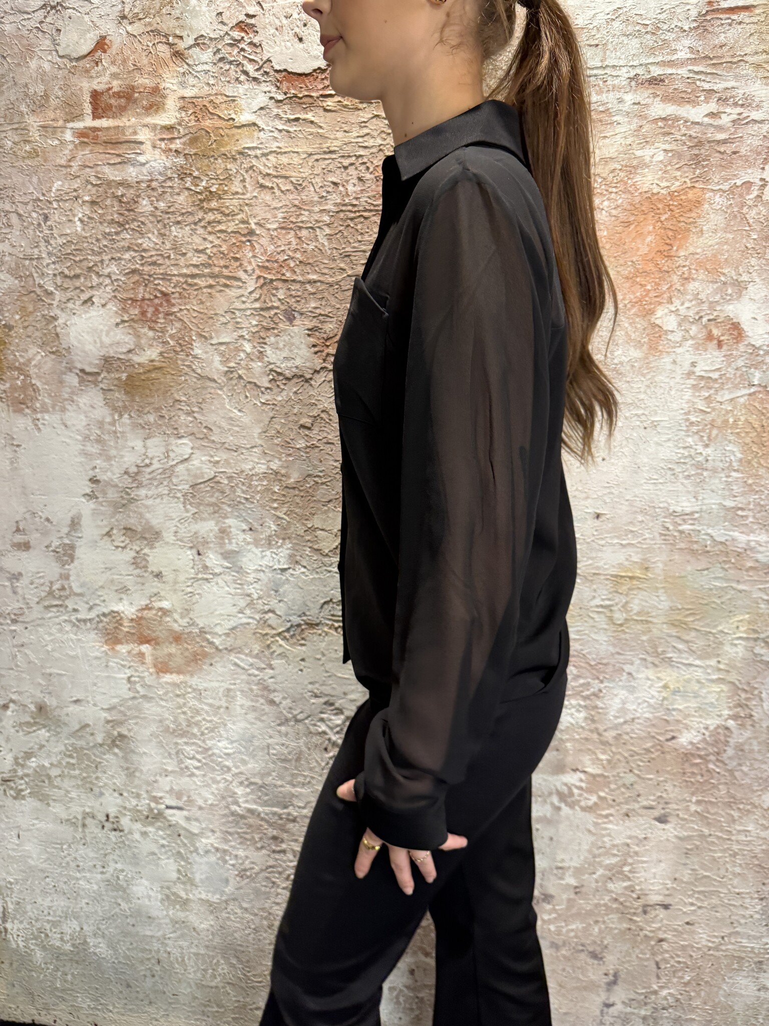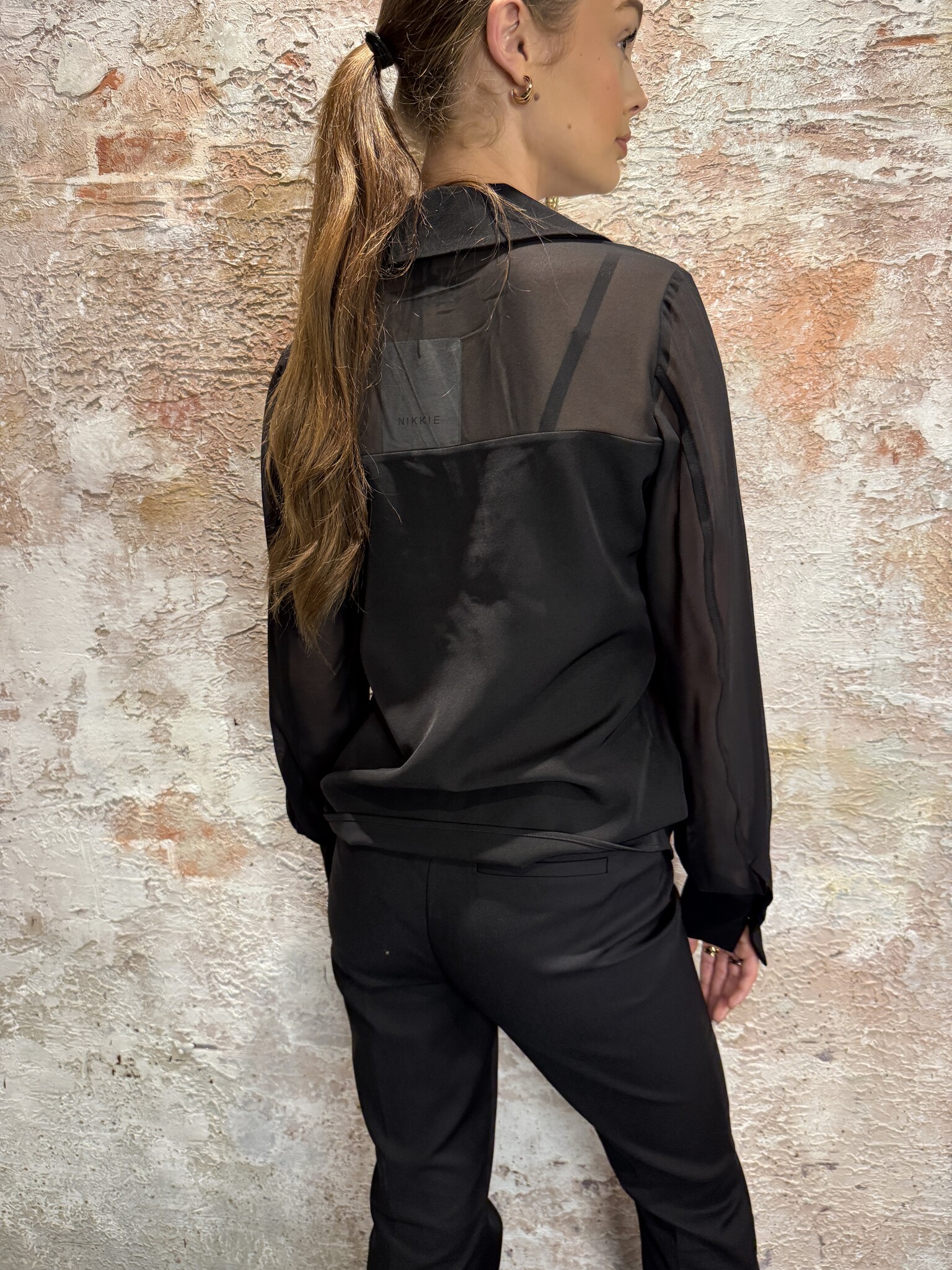 Nikkie Larisa Losvallende Blouse Black. Elegante zwarte blouse met losvallende fit, klassieke kraag en knoopsluiting. Voorzien van borstzakken en licht transparante mouwen voor een vrouwelijke en chique uitstraling, perfect voor elke gelegenheid.