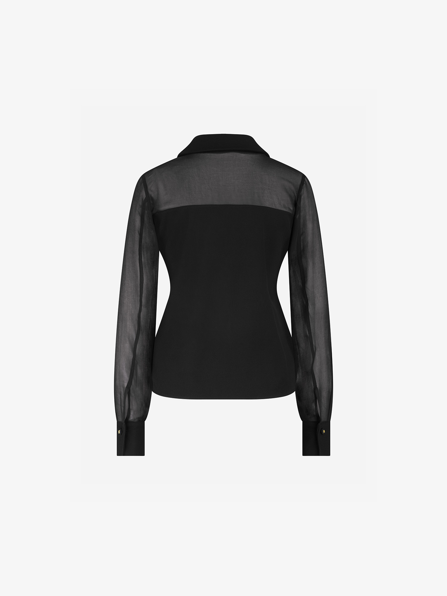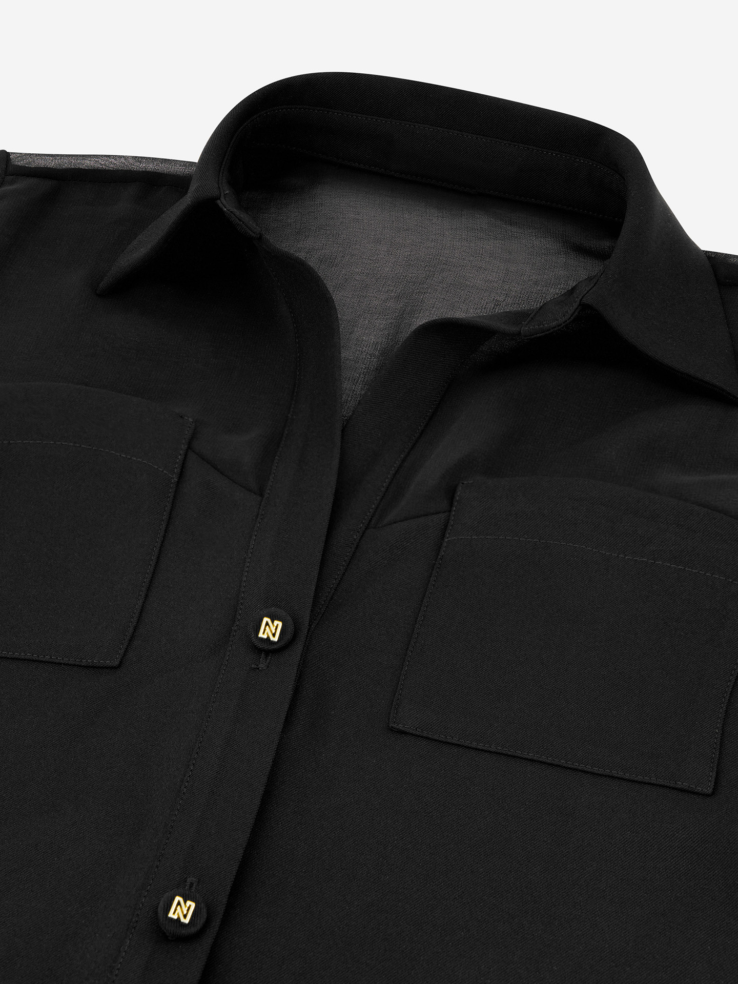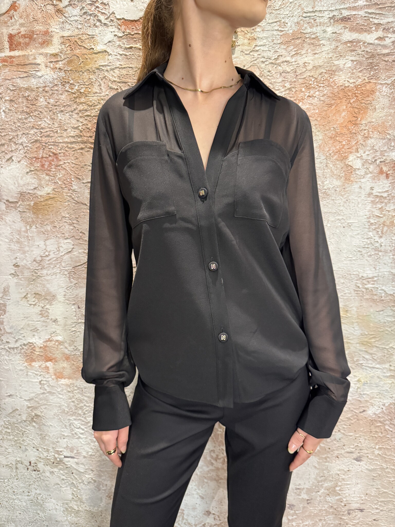 Nikkie Larisa Losvallende Blouse Black. Elegante zwarte blouse met losvallende fit, klassieke kraag en knoopsluiting. Voorzien van borstzakken en licht transparante mouwen voor een vrouwelijke en chique uitstraling, perfect voor elke gelegenheid.