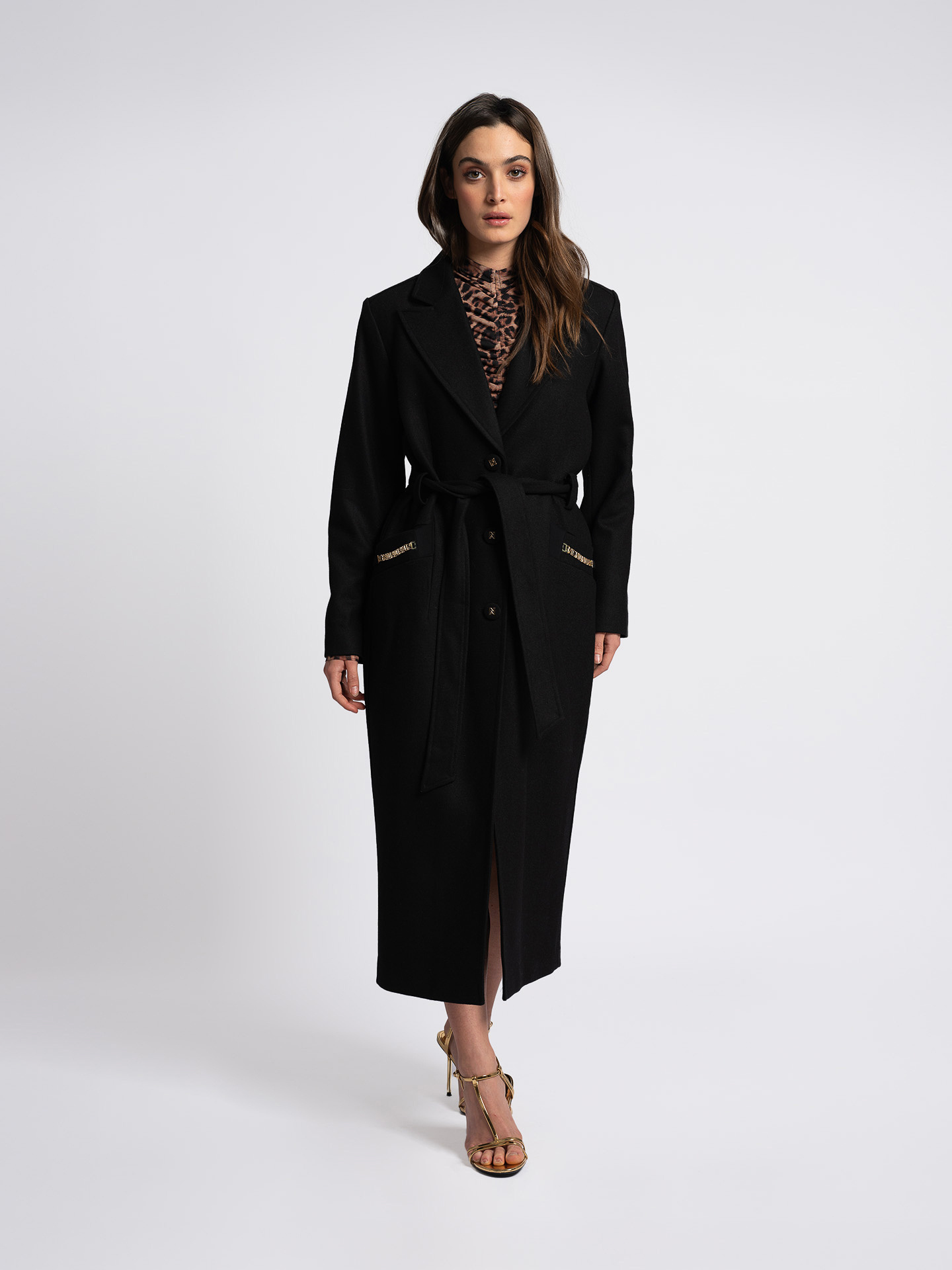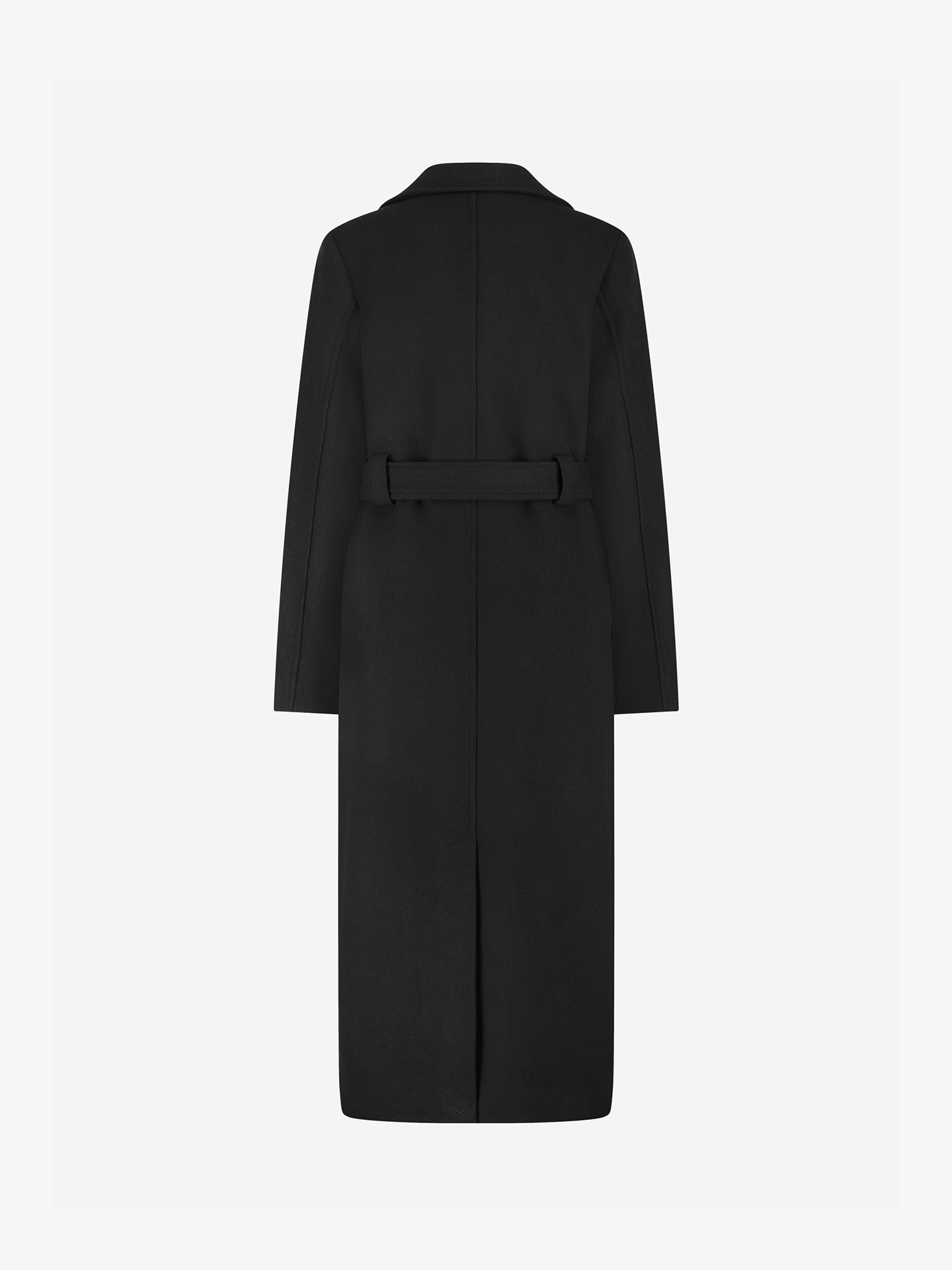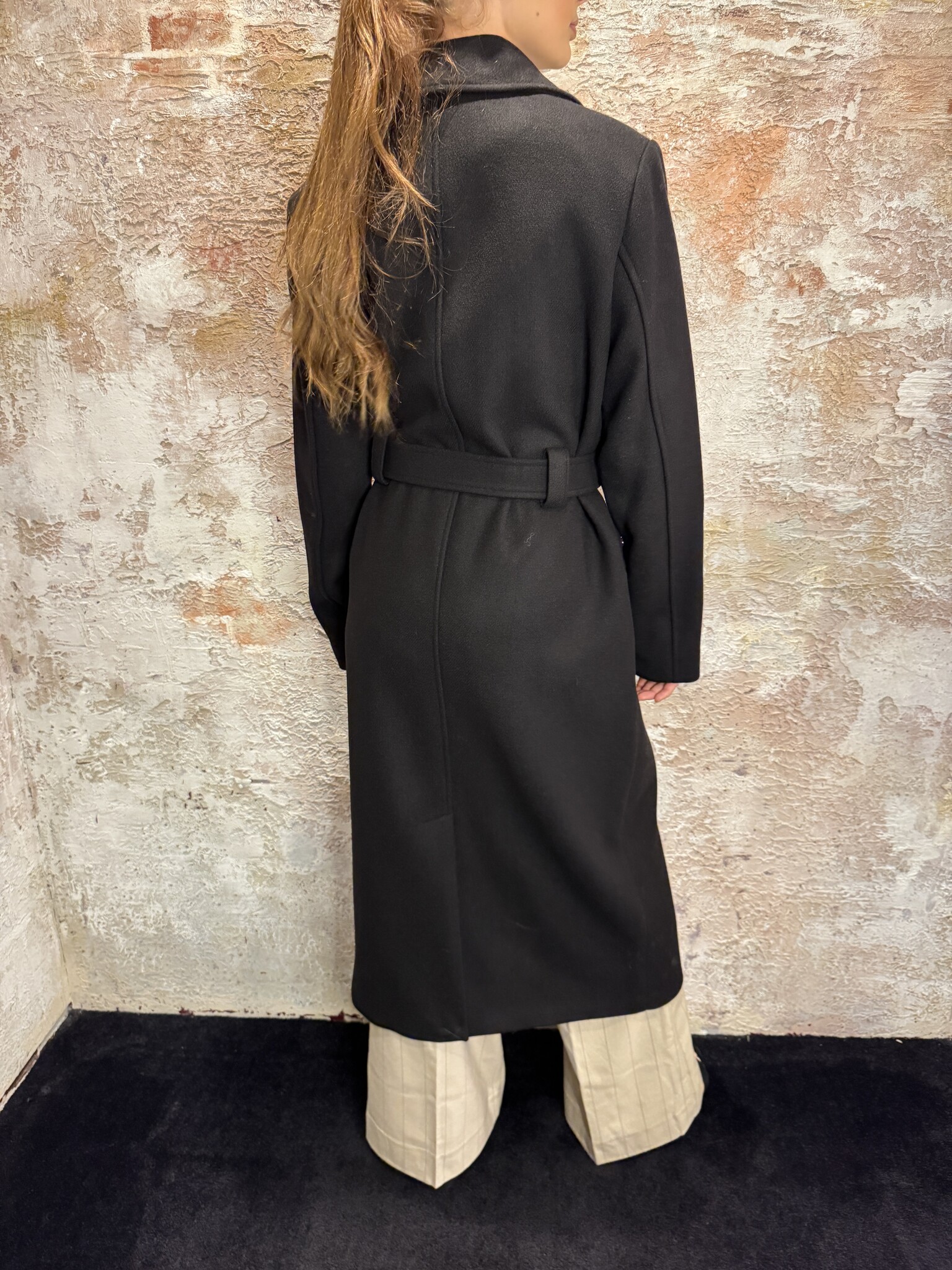 Nikkie Lille Coat Black. Stijlvolle lange zwarte jas met strikceintuur en klassieke revers. Voorzien van knoopsluiting en zakdetails met subtiele afwerking. Een tijdloze mantel die warmte, comfort en elegantie perfect combineert.
