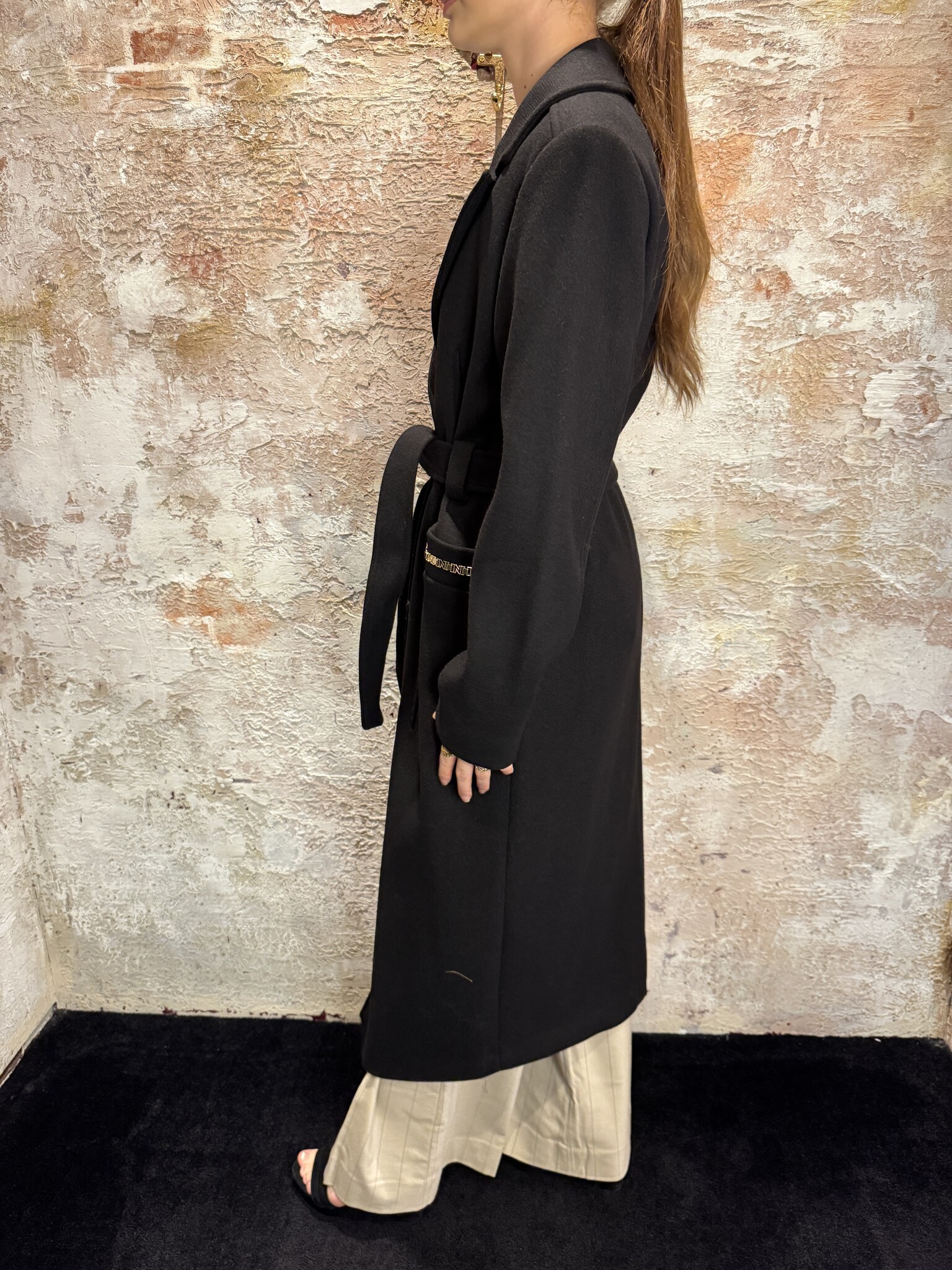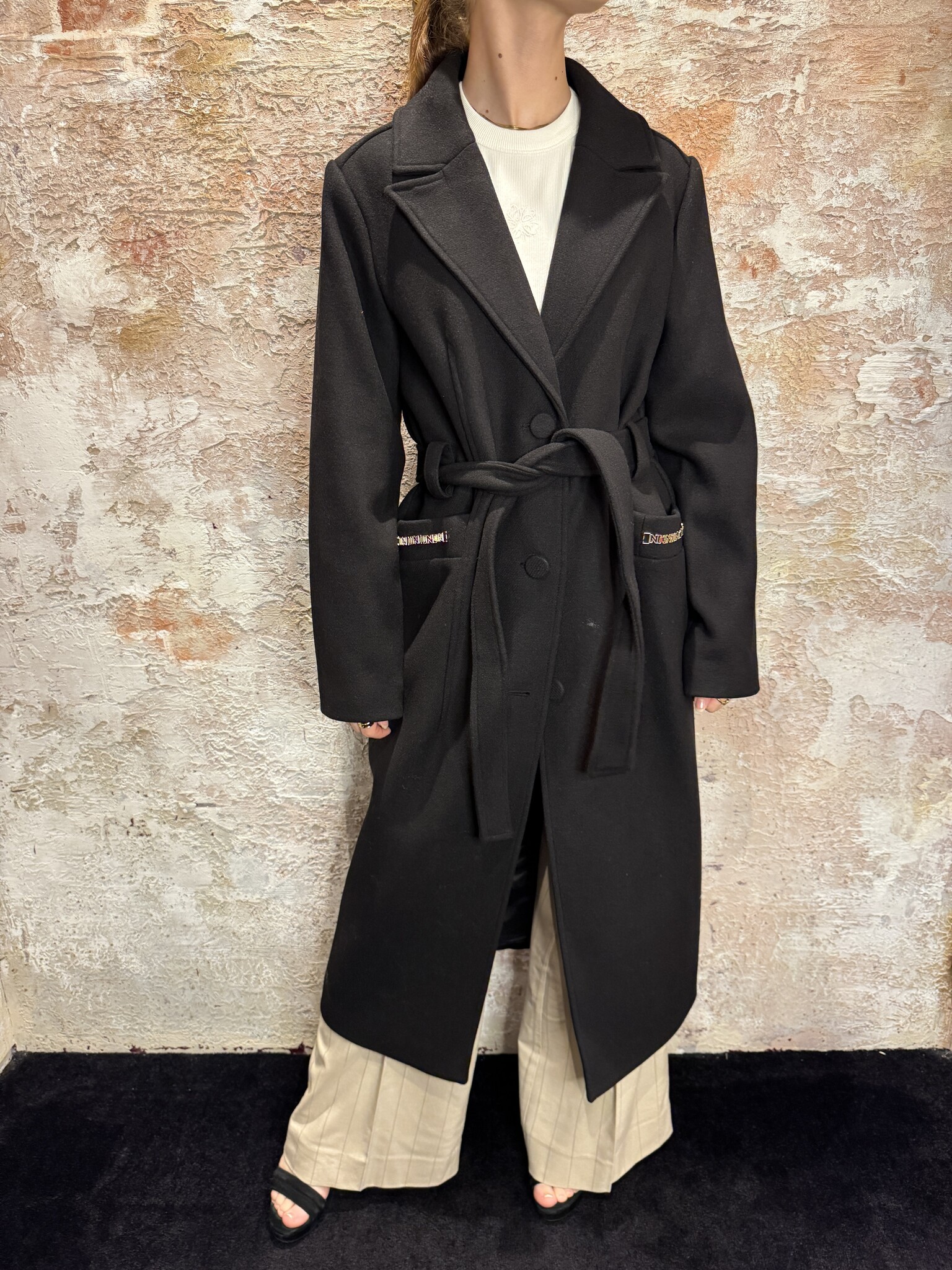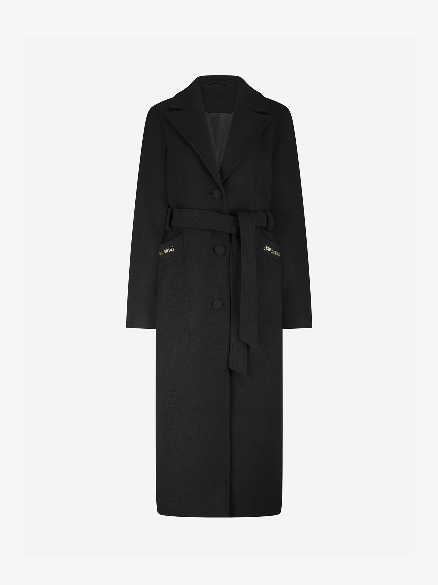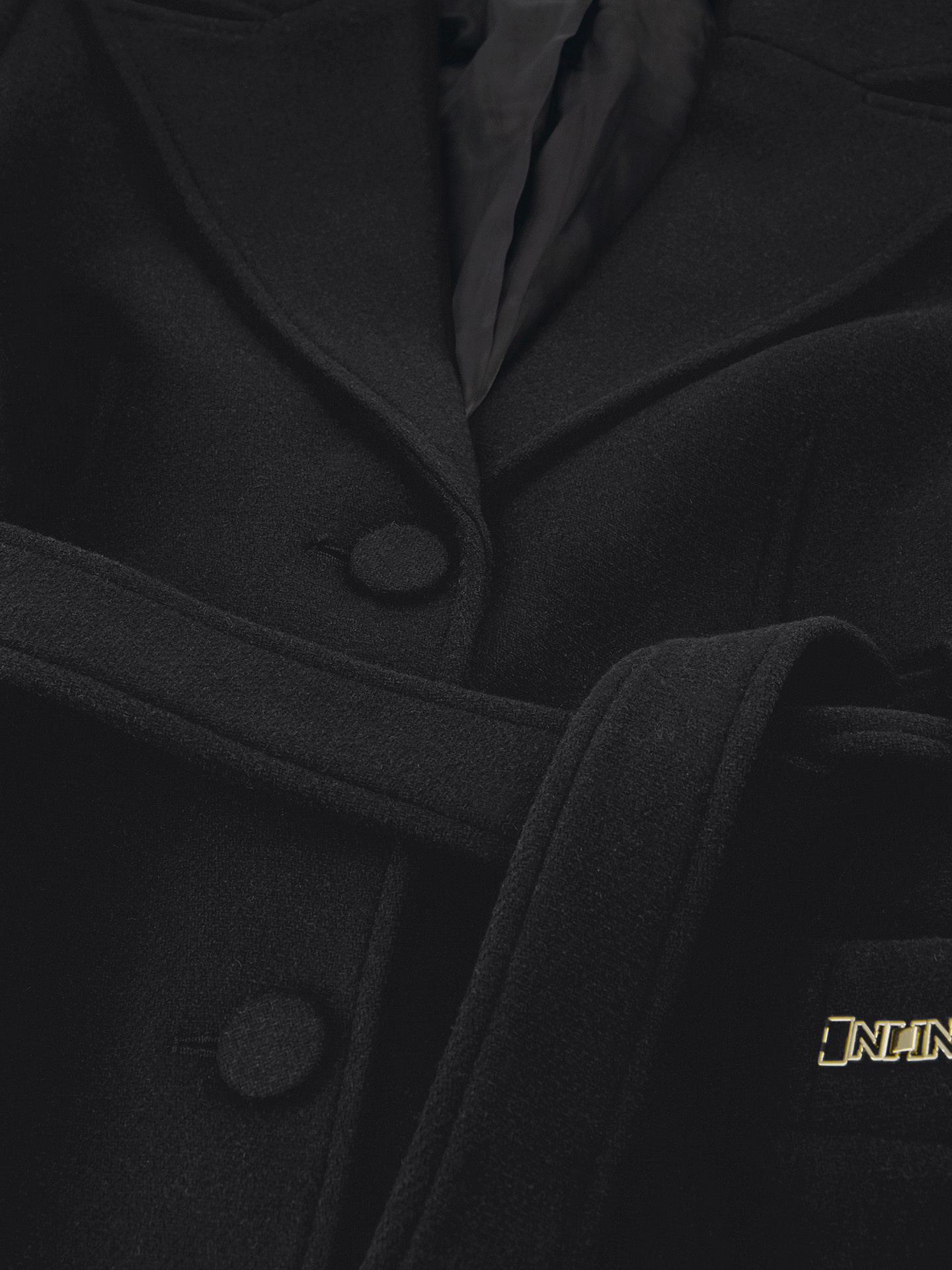 Nikkie Lille Coat Black. Stijlvolle lange zwarte jas met strikceintuur en klassieke revers. Voorzien van knoopsluiting en zakdetails met subtiele afwerking. Een tijdloze mantel die warmte, comfort en elegantie perfect combineert.