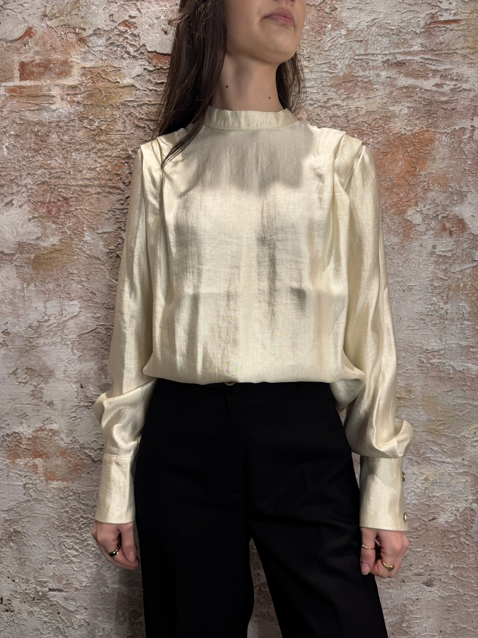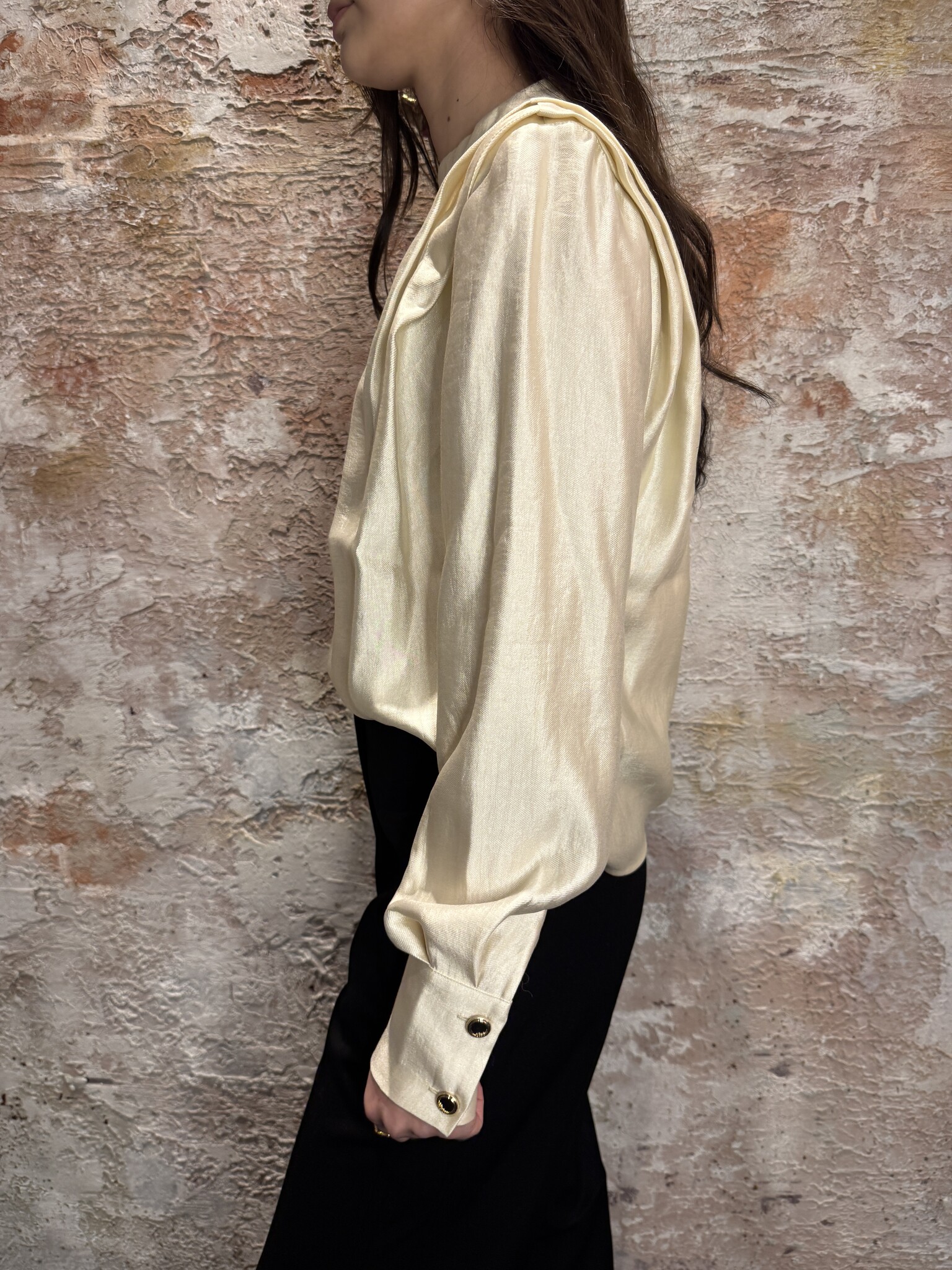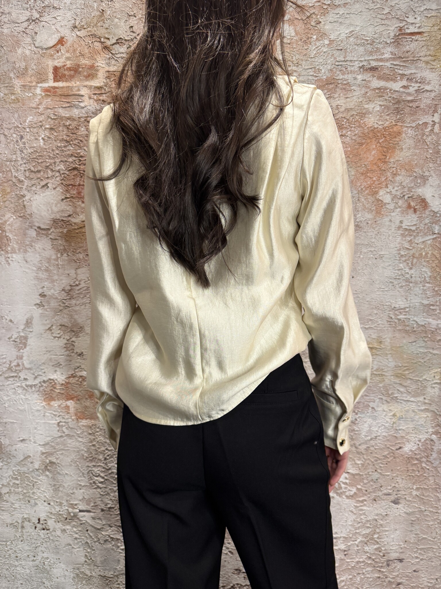 De Nikkie Ohino Blouse Cream is een chique blouse met subtiele glans en luxe uitstraling. Voorzien van gouden knoopdetails en geplooide schouders. Perfect voor een elegante look – draagbaar bij zowel een pantalon als rok.