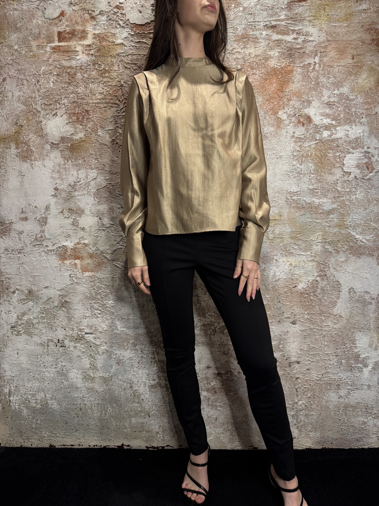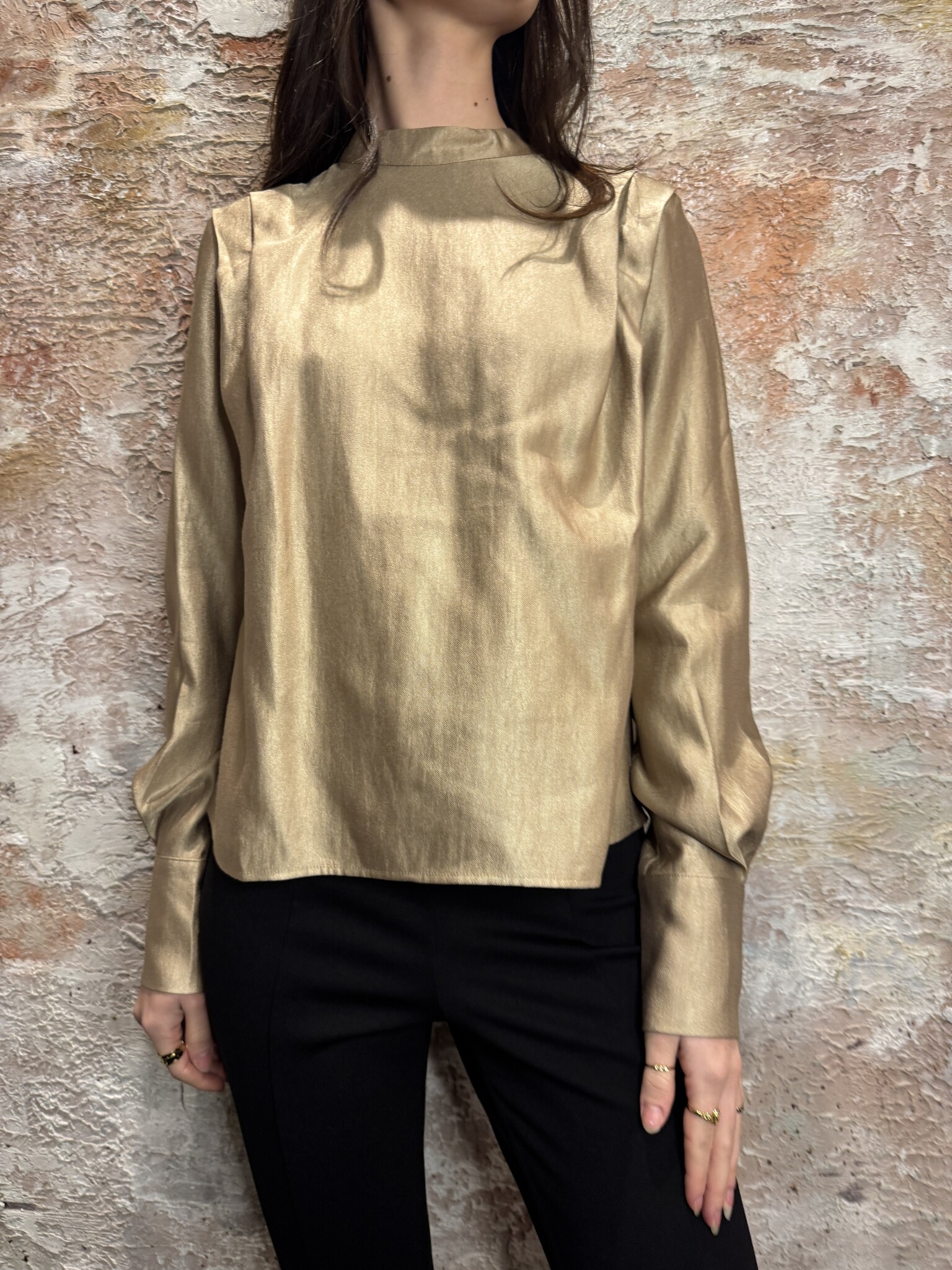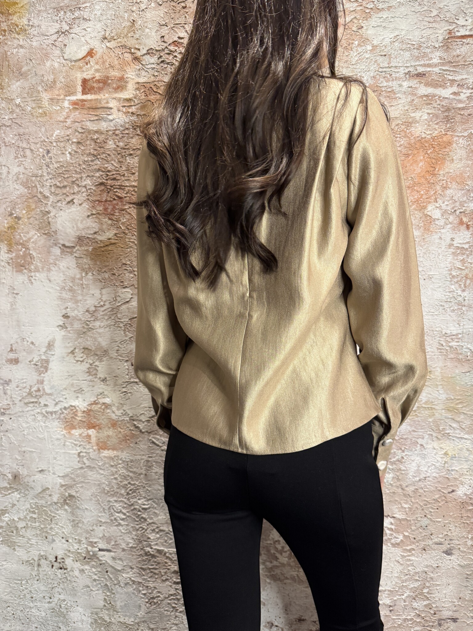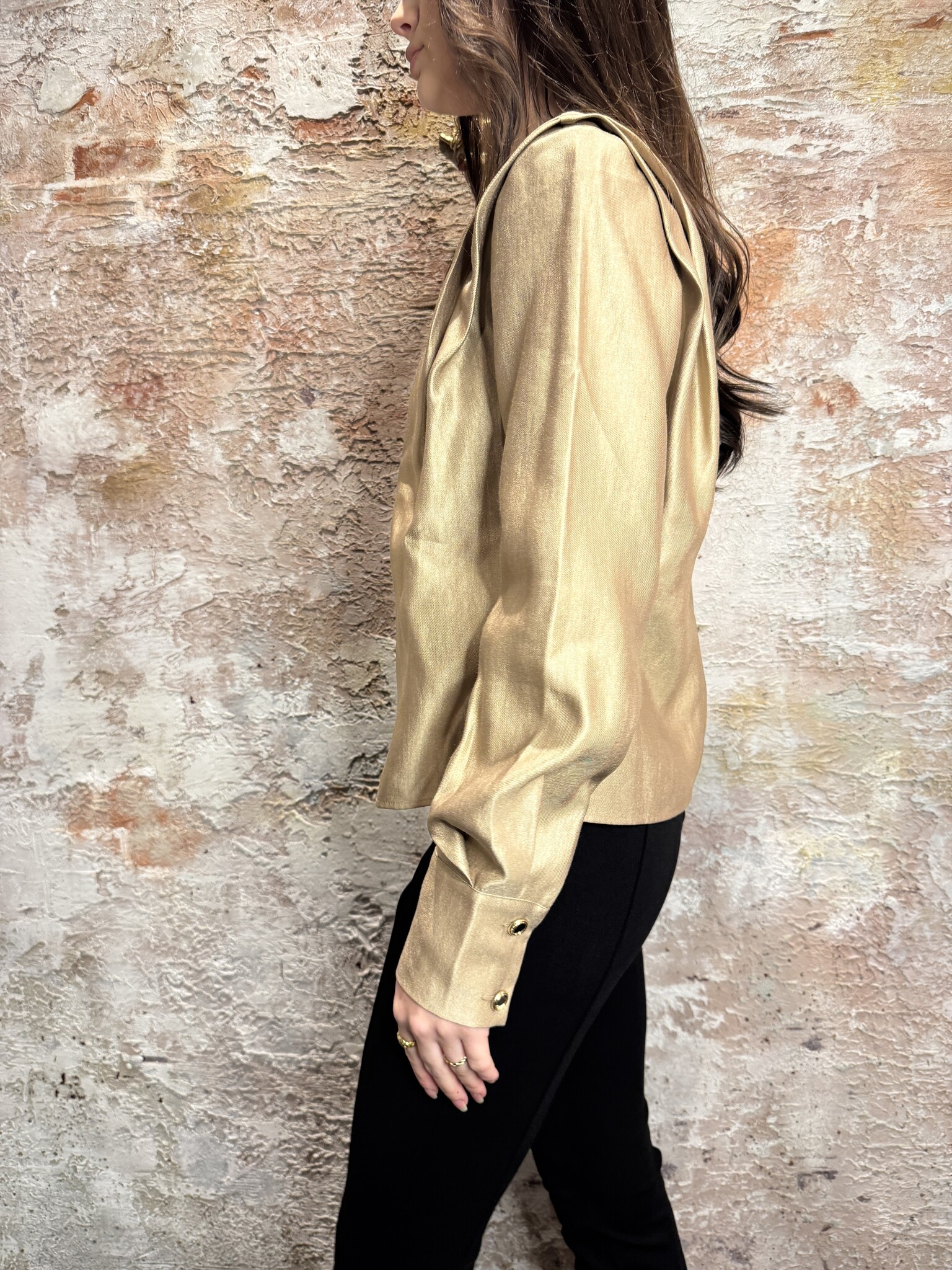 De Nikkie Ohino Blouse Pebble straalt elegante glamour uit. Gemaakt van glanzende metallic stof met subtiele plooien op de schouders. Perfect te combineren met een pantalon of rok voor een chique partylook of stijlvolle avondoutfit.