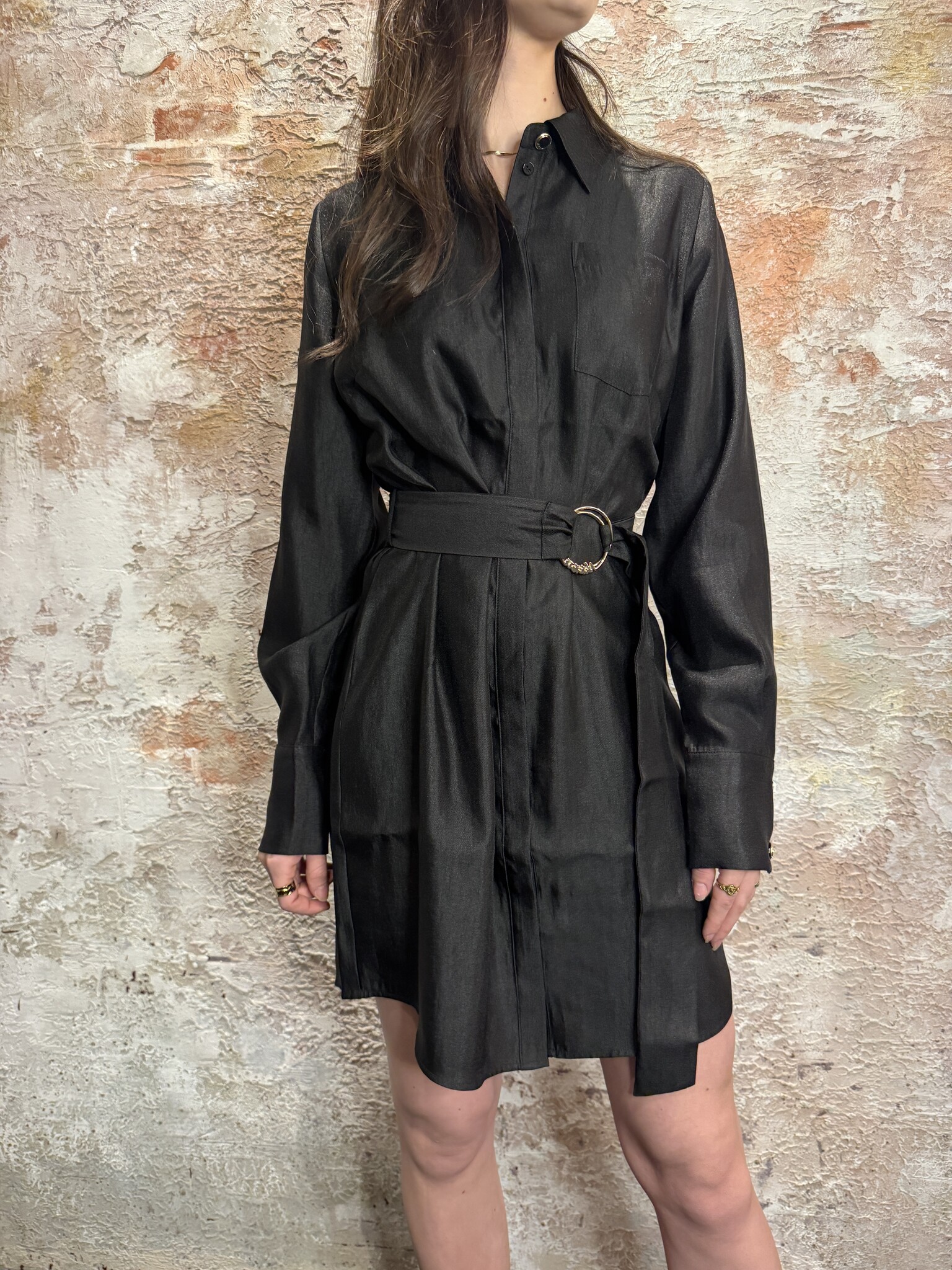 De Nikkie Ohino Dress Black is een elegante blousejurk met subtiele glans. De bijpassende tailleceintuur met gouden gesp accentueert het silhouet. Perfect voor een chique avondlook of stijlvolle business outfit.