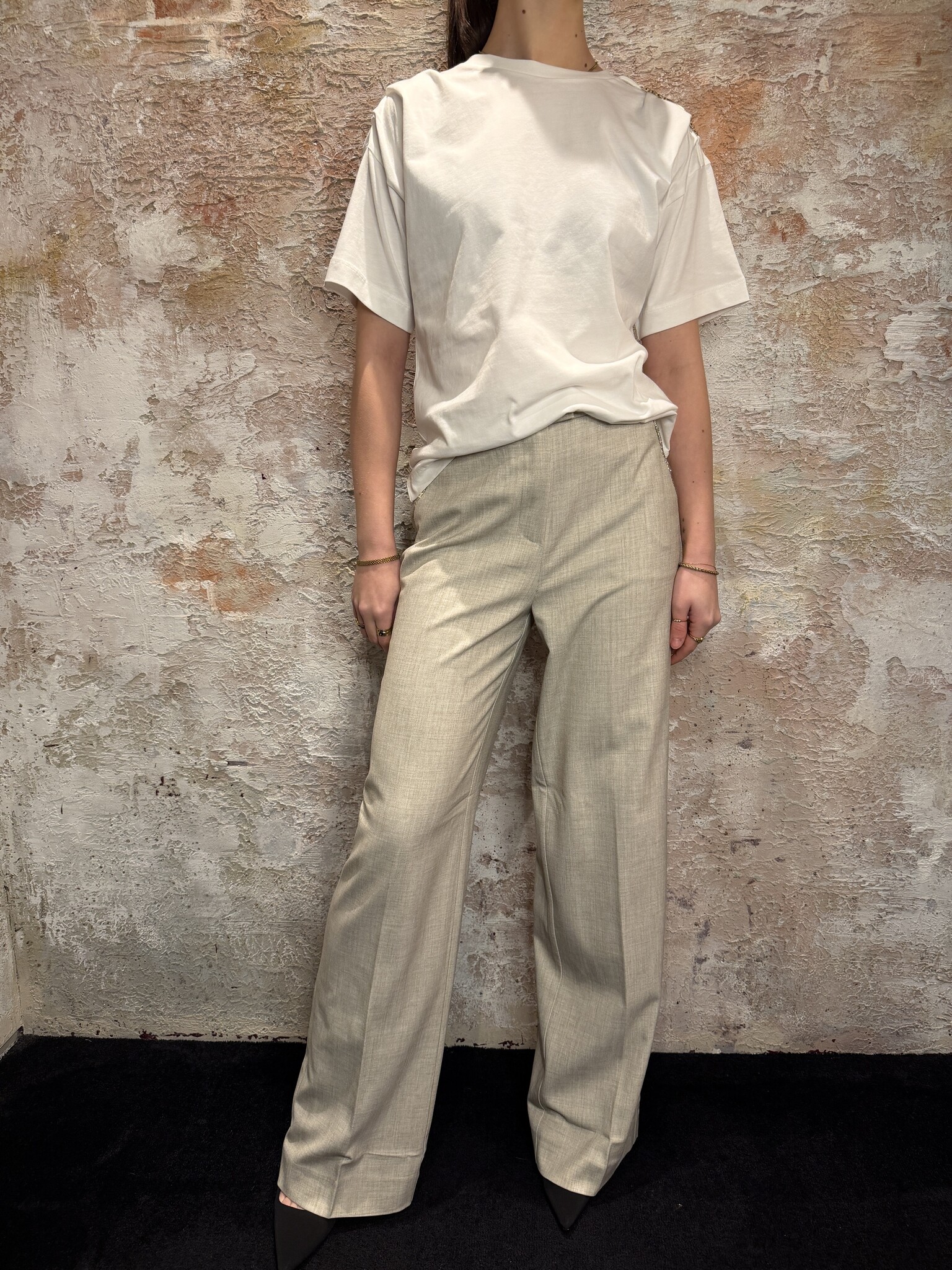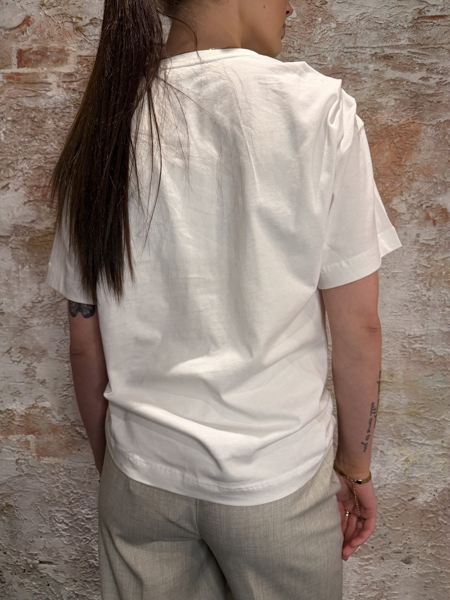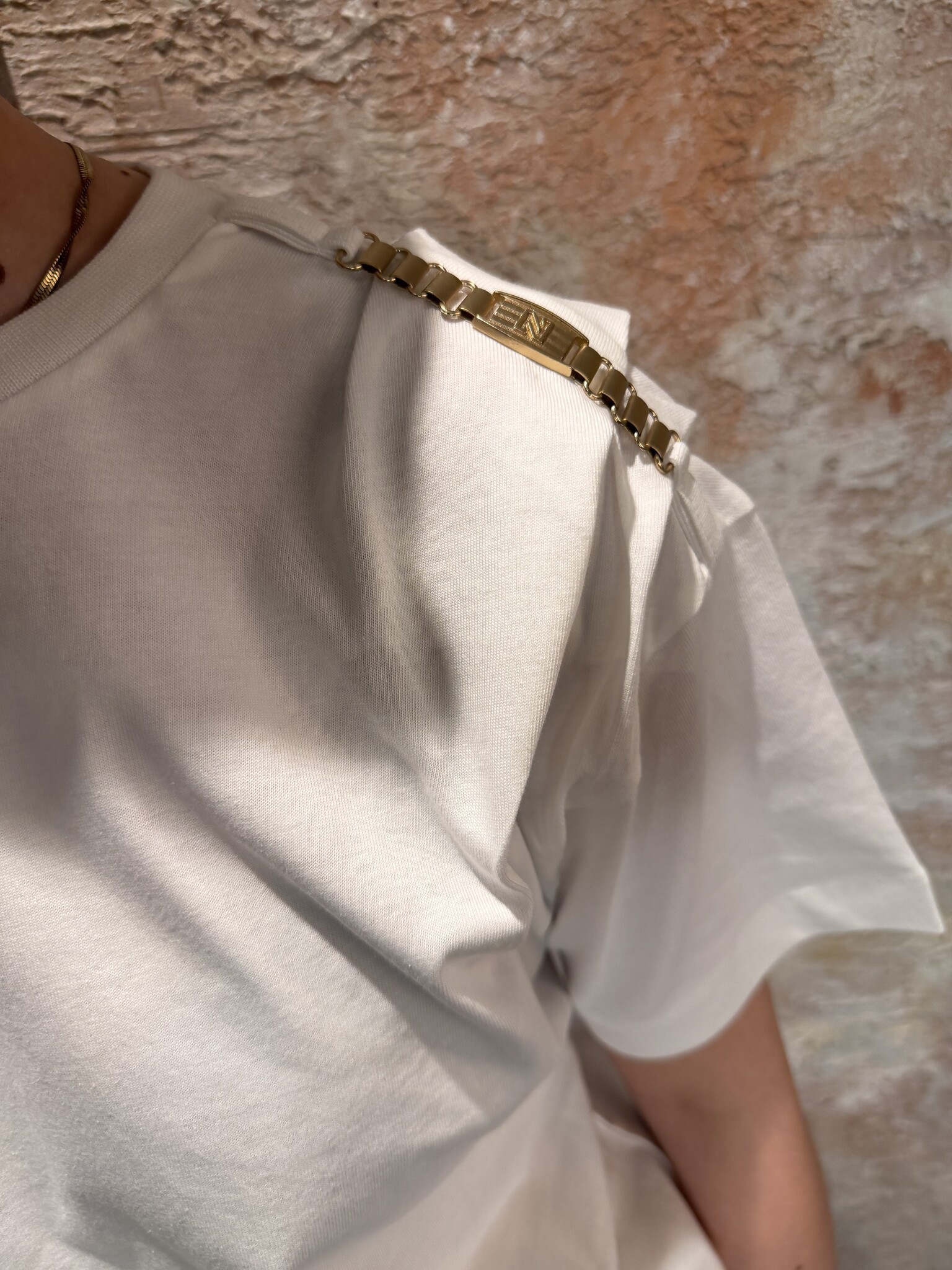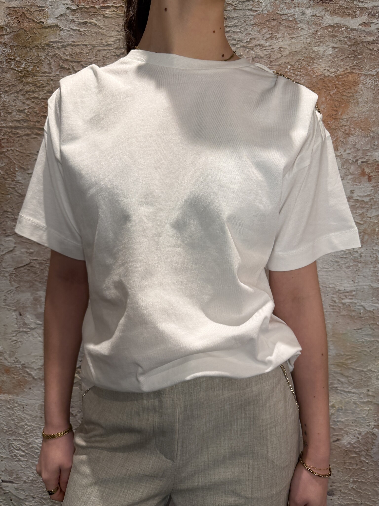 NIKKIE Patos T-Shirt Star White is een stijlvolle witte dames T-shirt met ronde hals en relaxed fit. Het gouden chain detail op de schouder geeft een luxe, trendy touch. Perfect basic item voor een chic casual look.