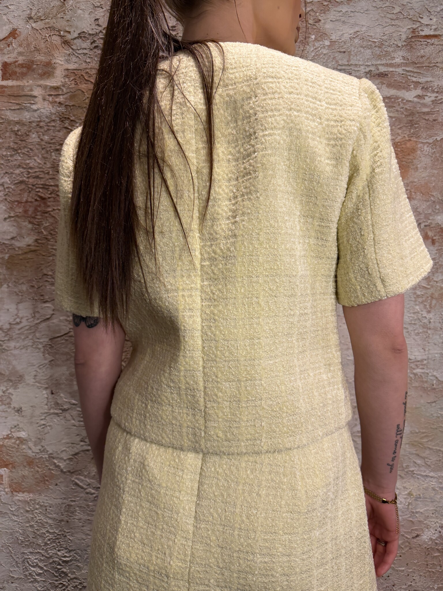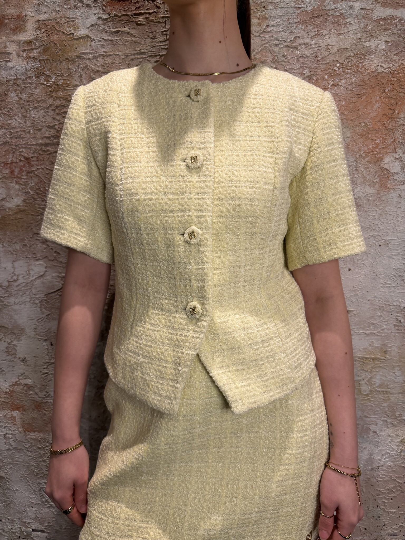 NIKKIE Perth Jacket Lemonade. Elegant jasje in zachte tweed-look met luxe structuur en gouden knopen. Vrouwelijke pasvorm en frisse kleur voor een stijlvolle uitstraling. Perfect te combineren met de bijpassende rok of casual met jeans.
