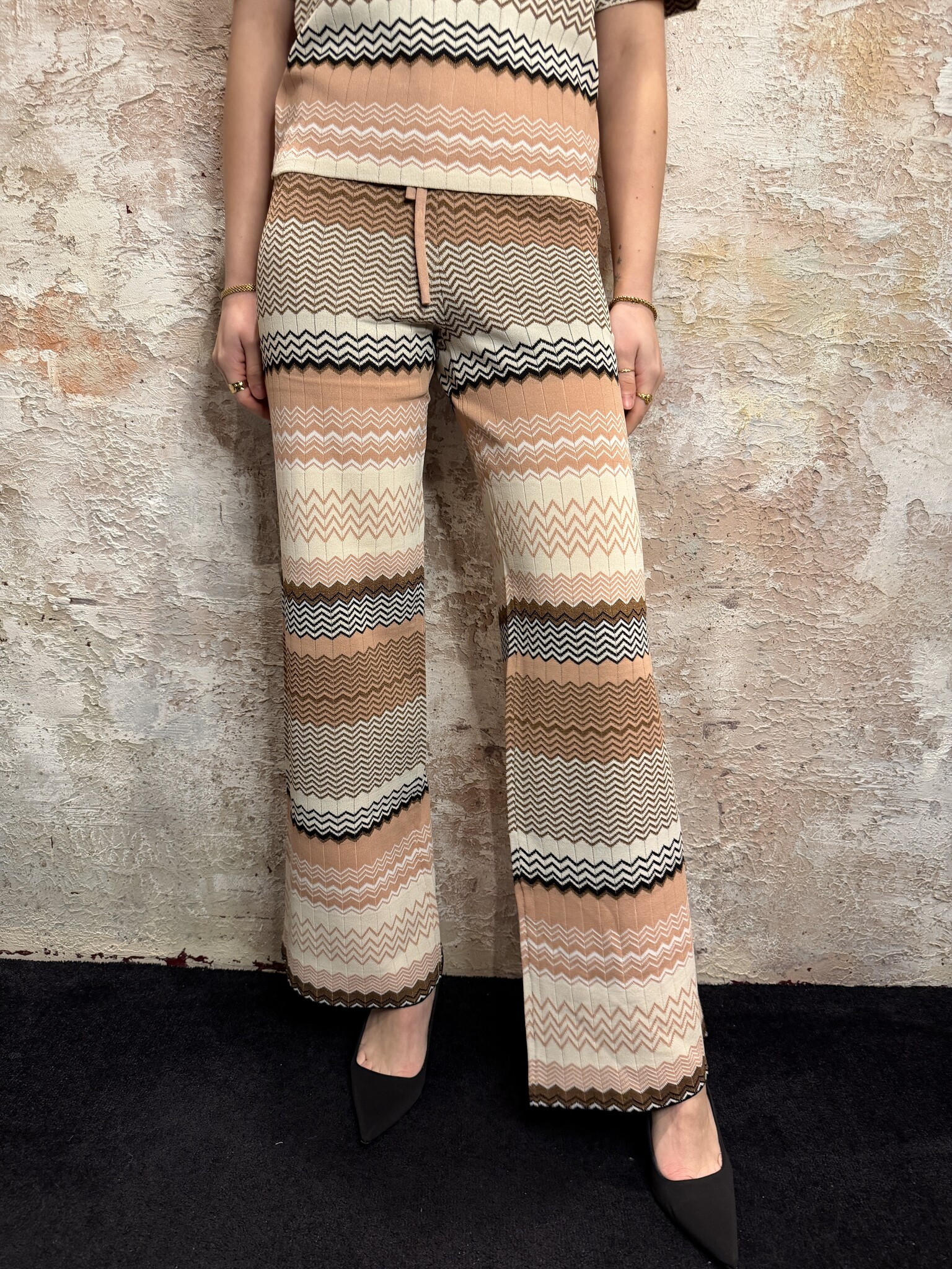 NIKKIE Pilazio Pants Blush met stijlvol zigzag patroon in nude, beige en bruin. High waist dames broek met elastische taille en rechte wijde pijpen. Perfect als co-ord set met de Pilazio Top. Trendy NIKKIE broek voor een elegante, vrouwelijke look.