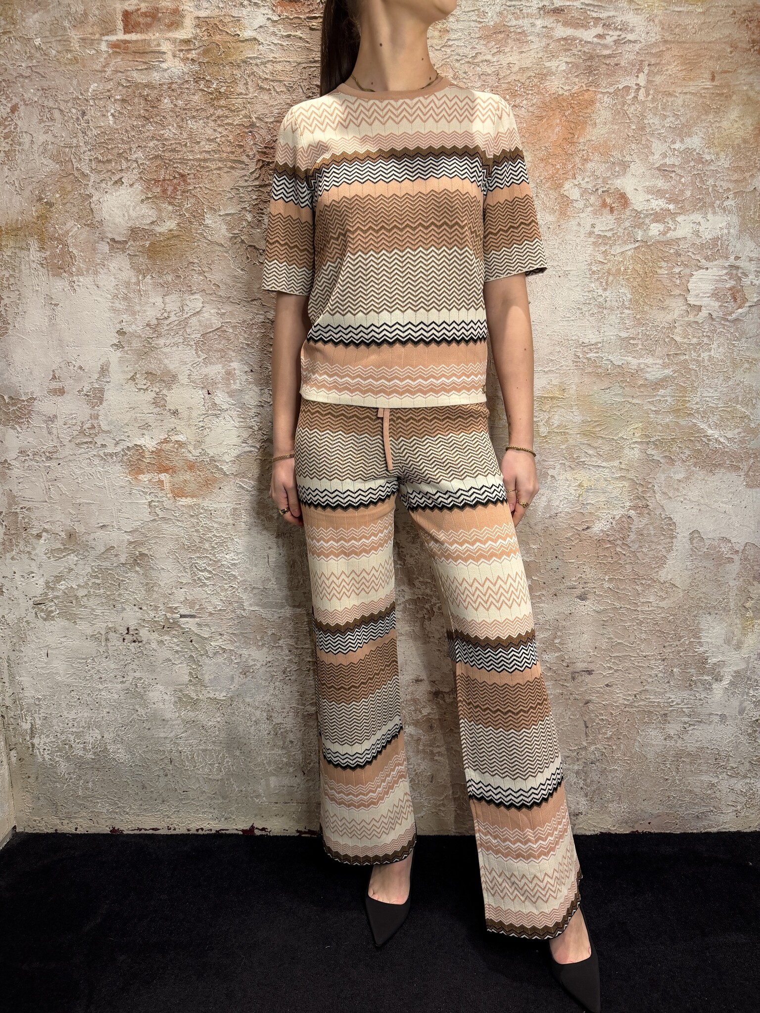 NIKKIE Pilazio Top Blush met stijlvol zigzag patroon in nude, beige en bruin. Aangesloten fit, ronde hals en halflange mouwen. Draag ‘m als co-ord set met bijpassende broek. Trendy dames top van NIKKIE, perfect voor een elegante look.