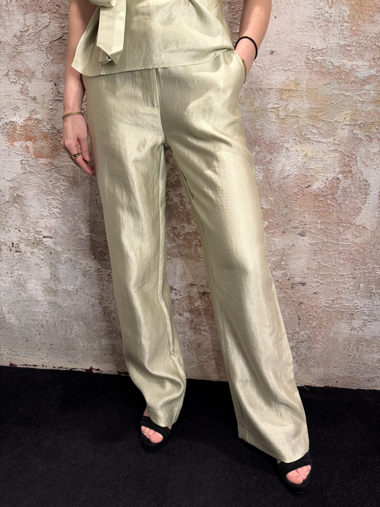 Elegant en stijlvol. De NIKKIE Porlamar Pants in Aloe Vera heeft een luxe glanzende stof en rechte wide leg pasvorm. Perfect te combineren met de bijpassende top of blouse voor een complete set. #nikkie #have2havealkmaar #musthave #newcollection #fashion
