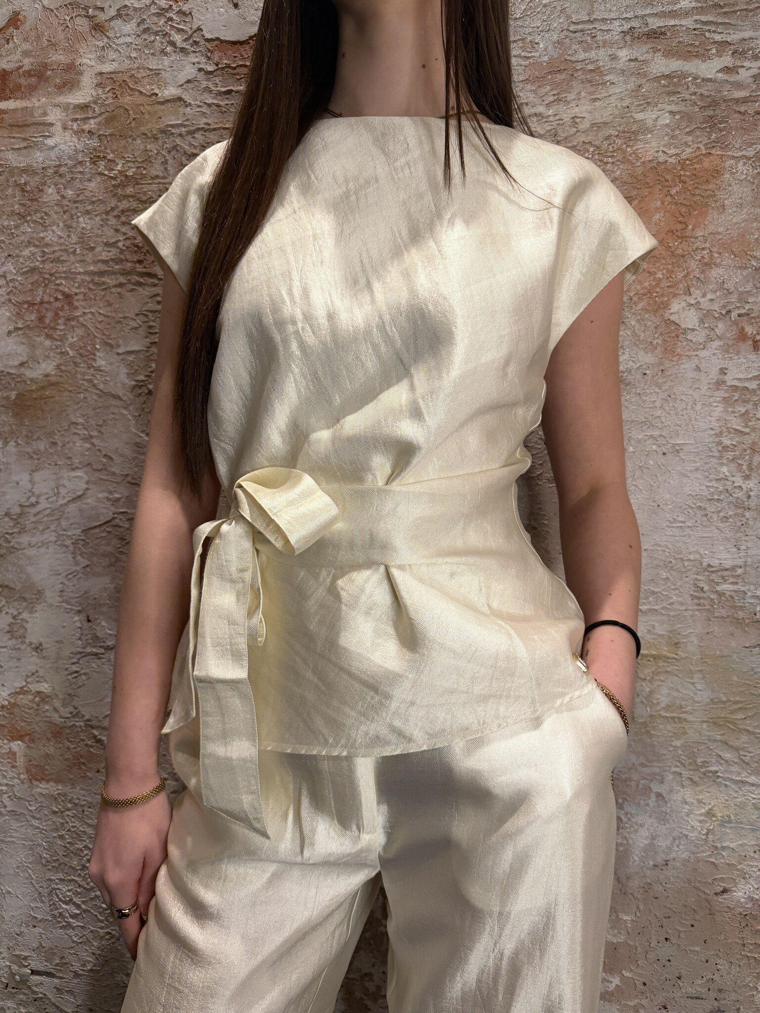 Elegant en zomers. De NIKKIE Porlamar Top in Cream heeft een luxe glanzende stof en strikdetail in de taille voor een flatterende fit. Perfect te combineren met de bijpassende pantalon voor een stijlvolle set. #nikkie #have2havealkmaar