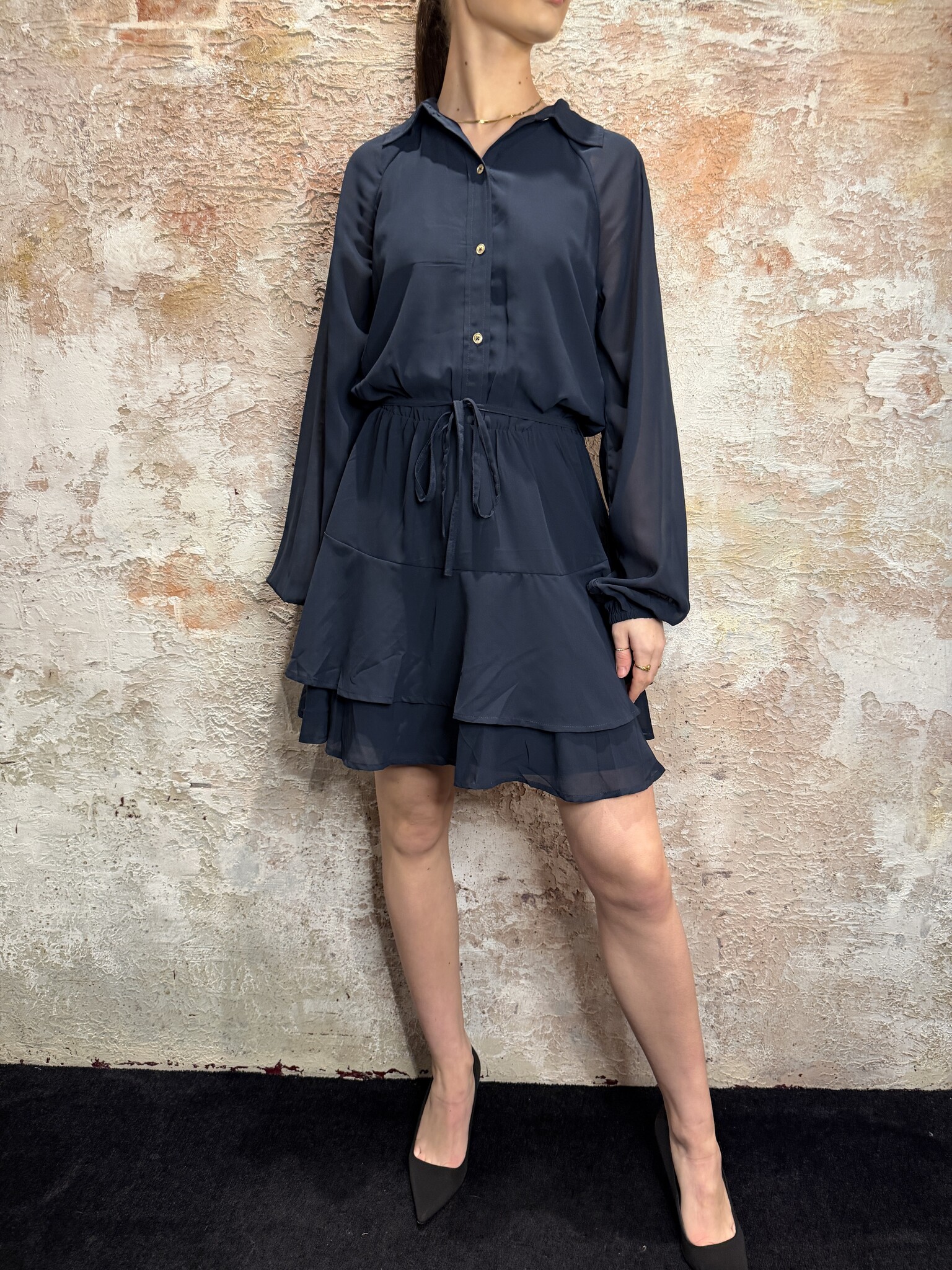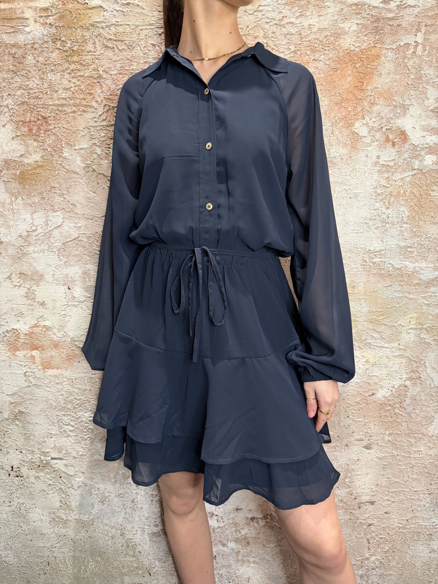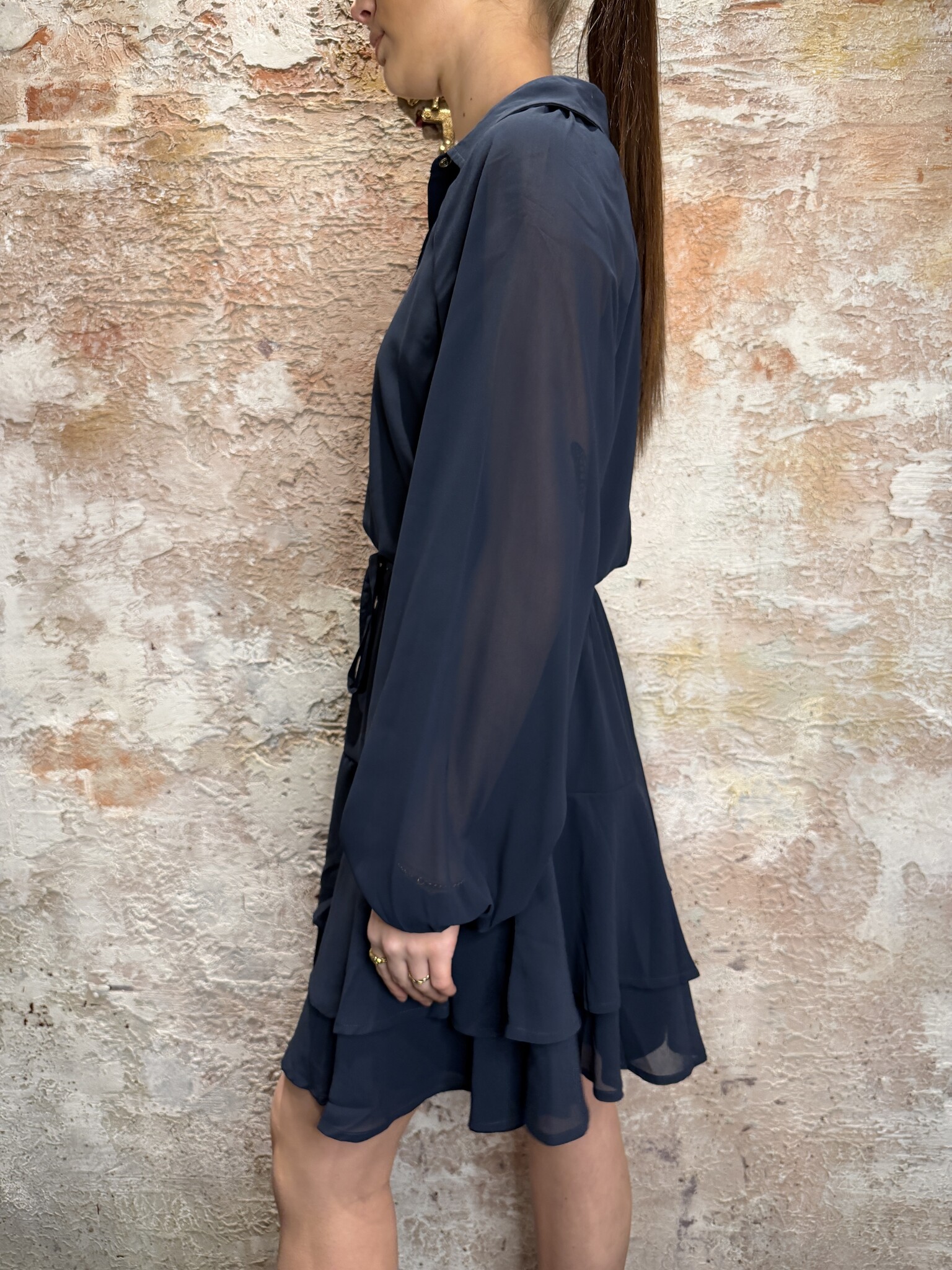 NIKKIE Praques Dress After Midnight met elegante blousejurk look en vrouwelijke pasvorm. Voorzien van knoopsluiting, tailleceintuur en speelse ruches. Luchtige stof en tijdloze donkerblauwe kleur. Perfect voor zowel casual als chique gelegenheden.