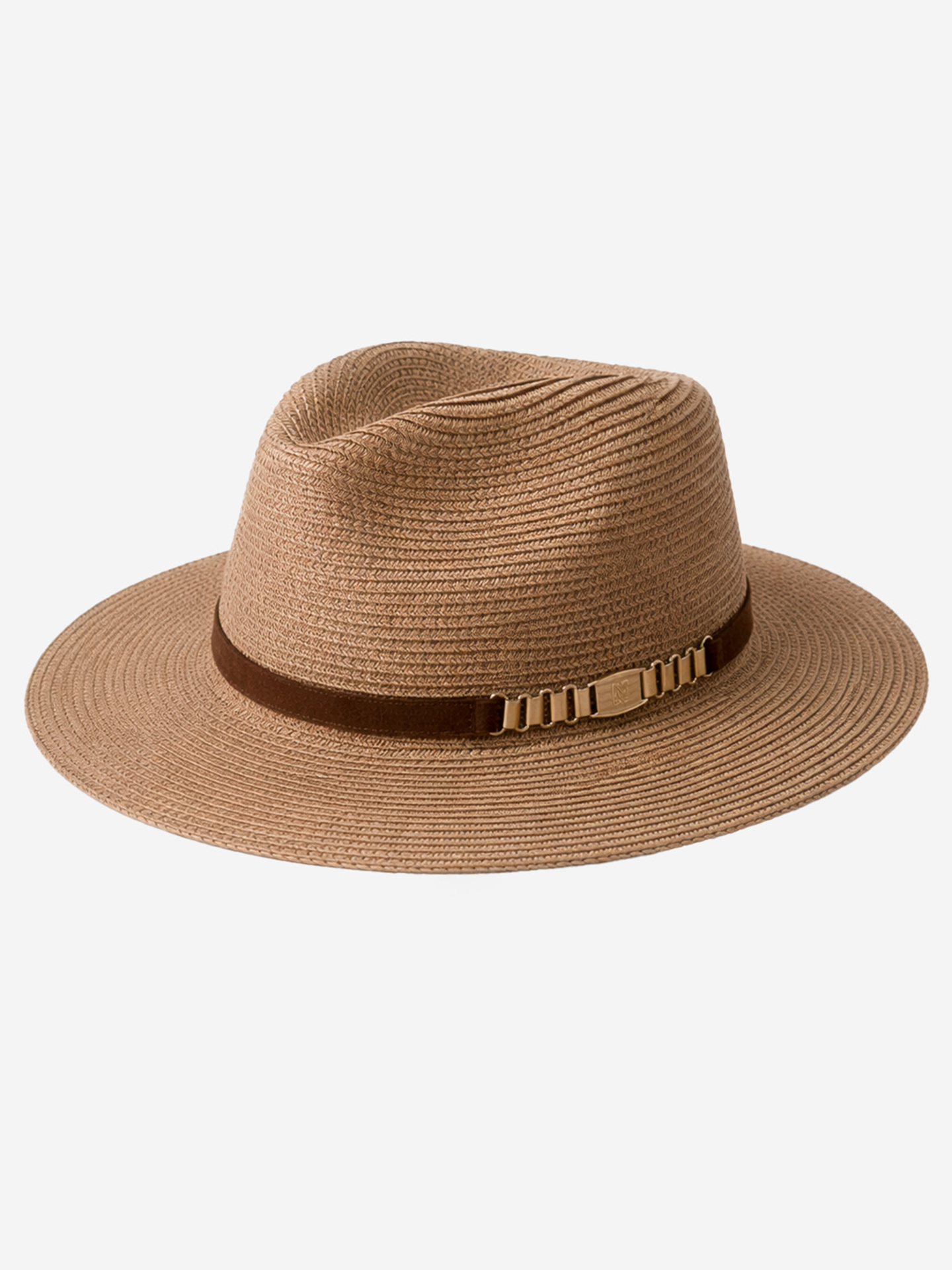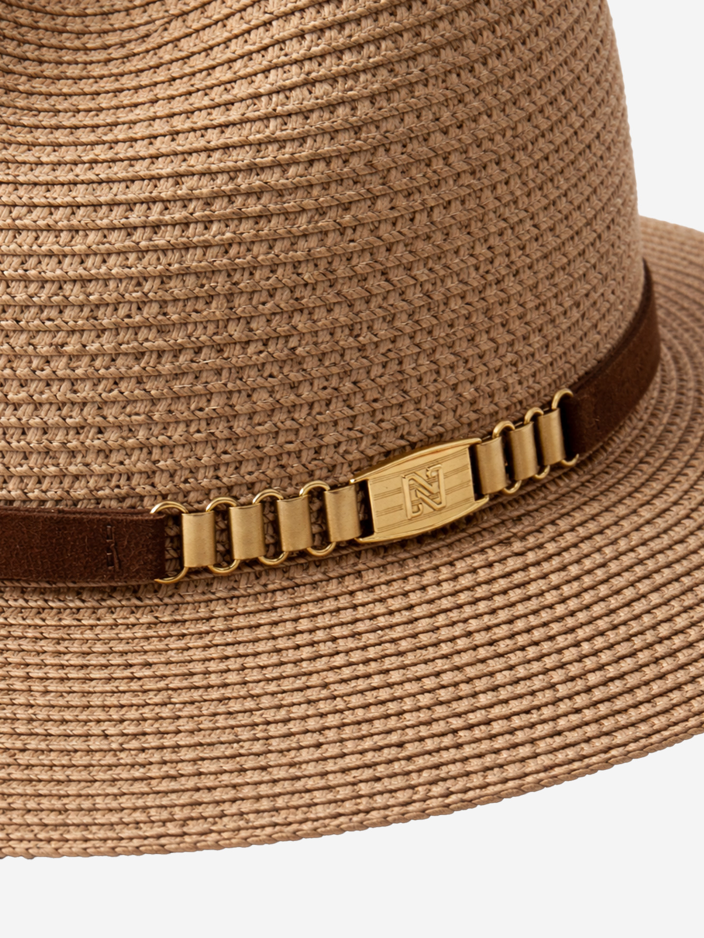 NIKKIE Quesandra Hat Neutral. Stijlvolle hoed in een warme neutrale tint met brede rand en luxe afwerking. Voorzien van een elegante band met gouden NIKKIE detail voor een chique uitstraling. Perfect voor een classy en zomerse look.