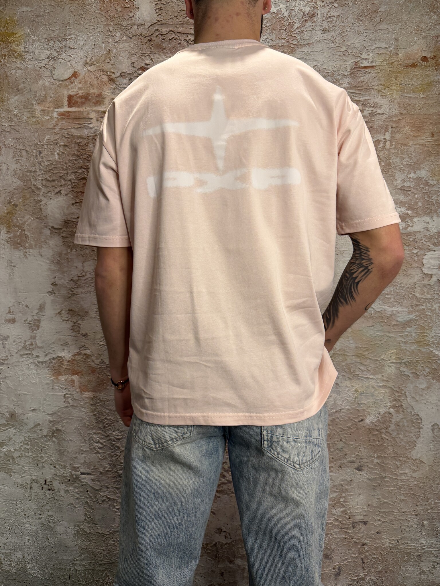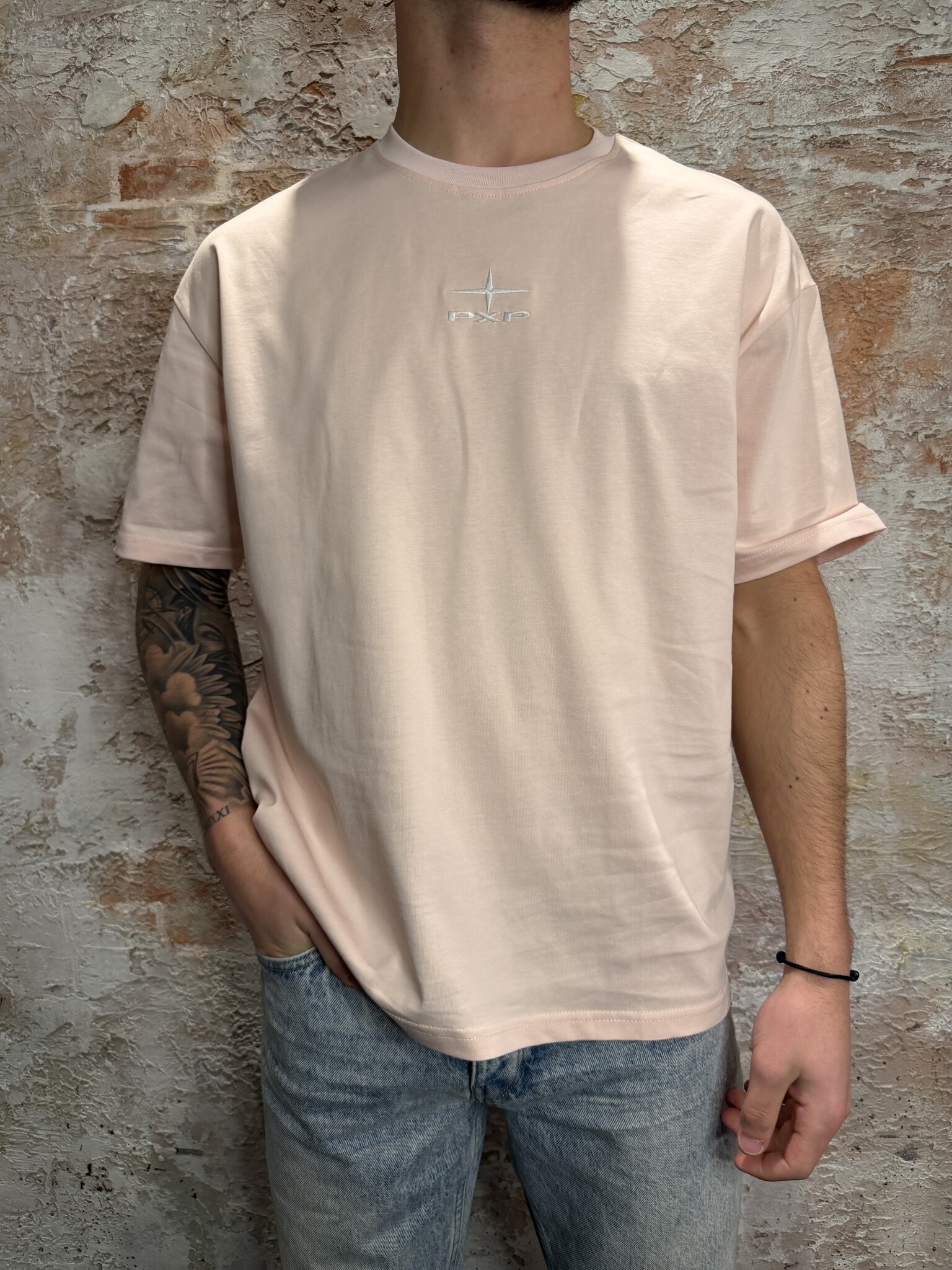 Project X Paris oversized T-shirt in zacht roze met subtiel PXP logo op de borst en ton-sur-ton logo op de rug. Gemaakt van comfortabele katoenkwaliteit met relaxte fit. Minimalistische streetwear look, eenvoudig te combineren met jeans of short.