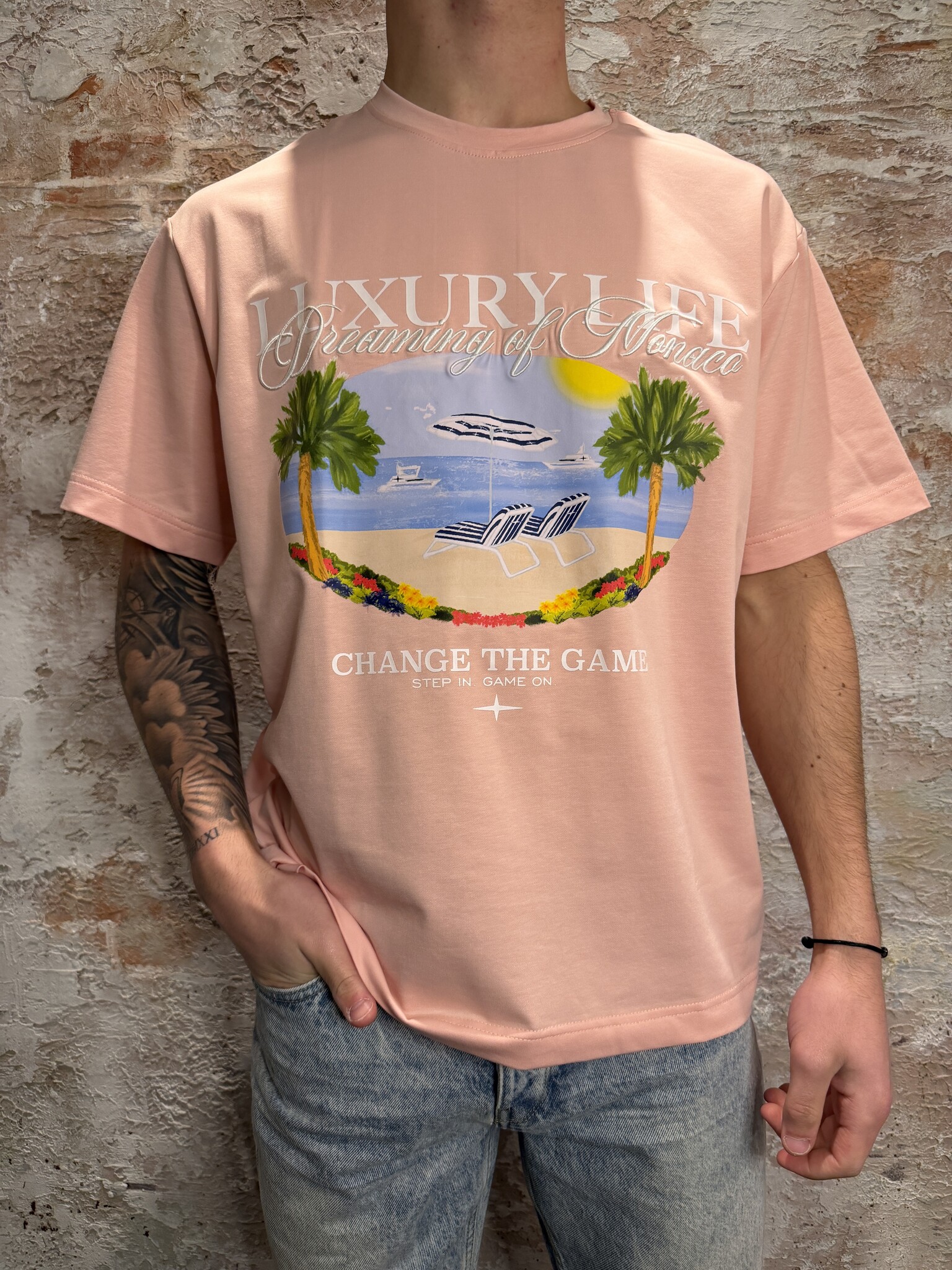 Project X Paris oversized T-shirt in zacht roze met grote “Luxury Life” frontprint en zomerse strandillustratie. Gemaakt van comfortabele katoenkwaliteit met relaxte fit. Perfect voor een frisse streetwear look en eenvoudig te combineren met jeans of shor